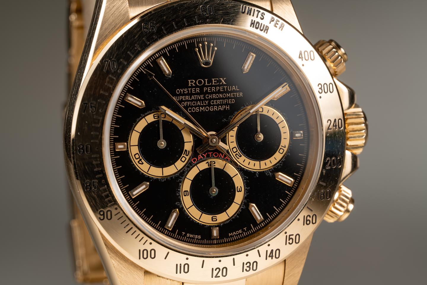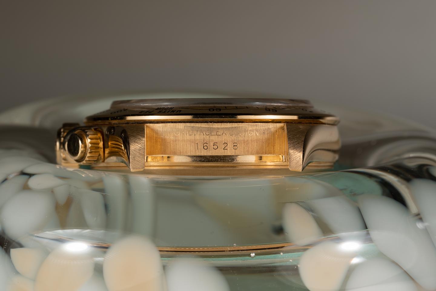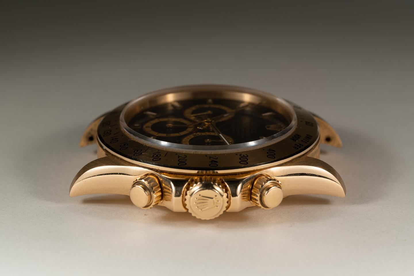 Case: The thick and even 18k yellow gold case is excellent showing only very light wear. The 18k yellow gold bezel is also in excellent condition showing only very light wear.