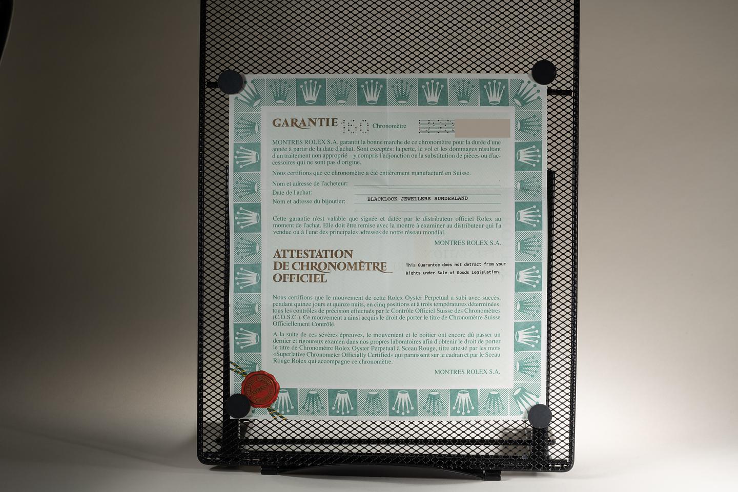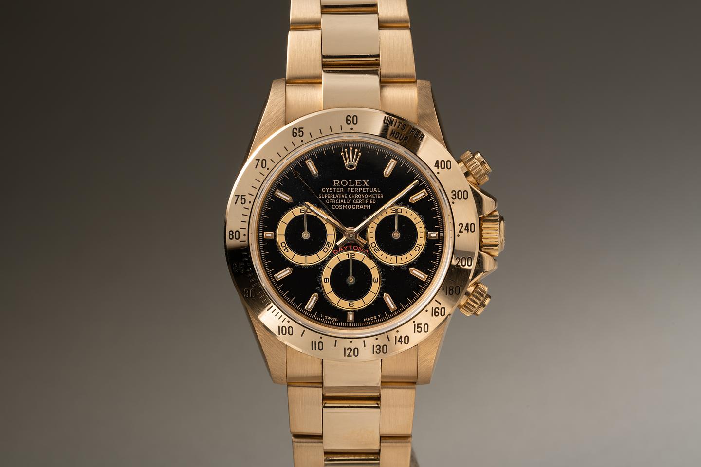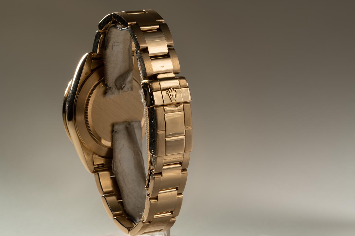 Bracelet: The 12 link 18K yellow gold Oyster bracelet is excellent showing only very light stretch for its age. The clasp is stamped with a 1996 date code.