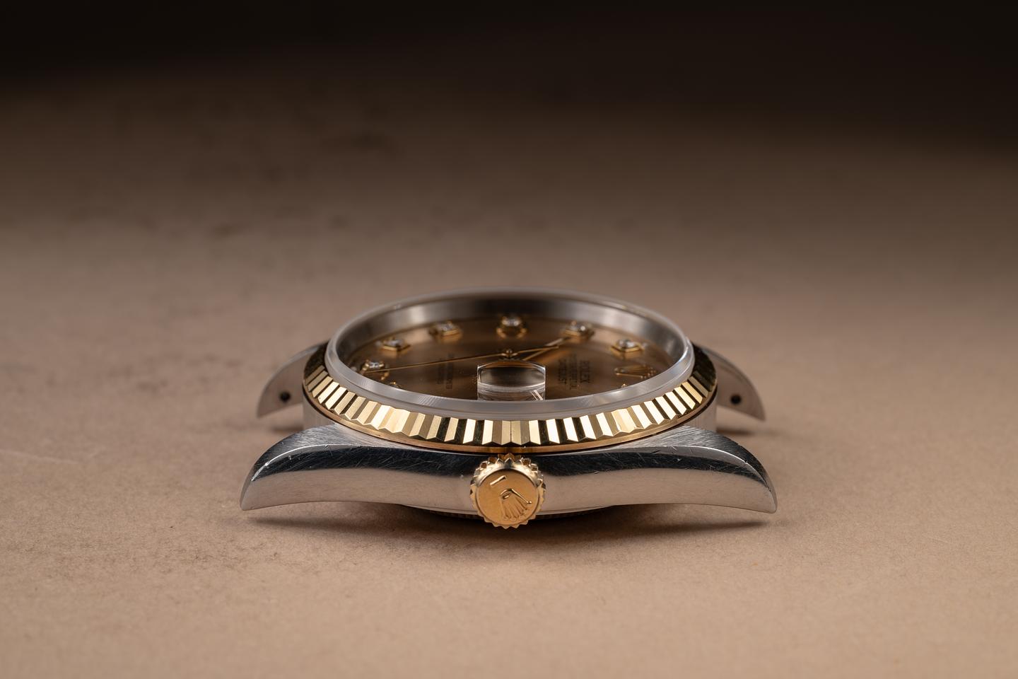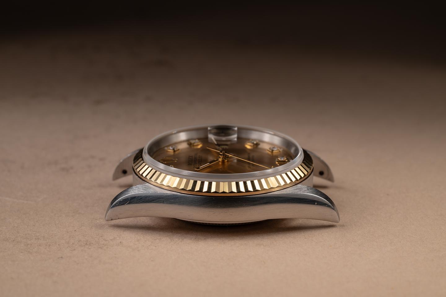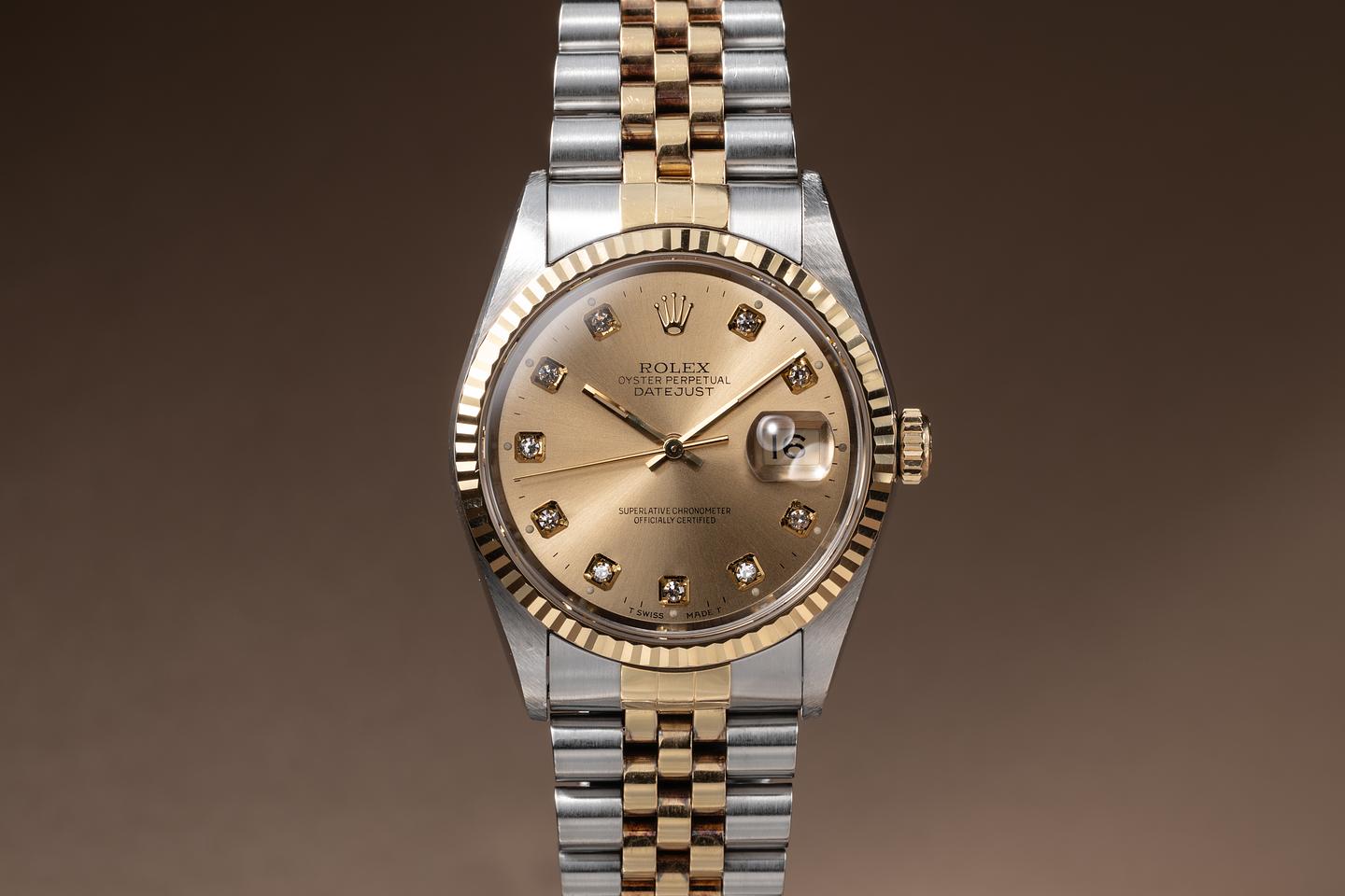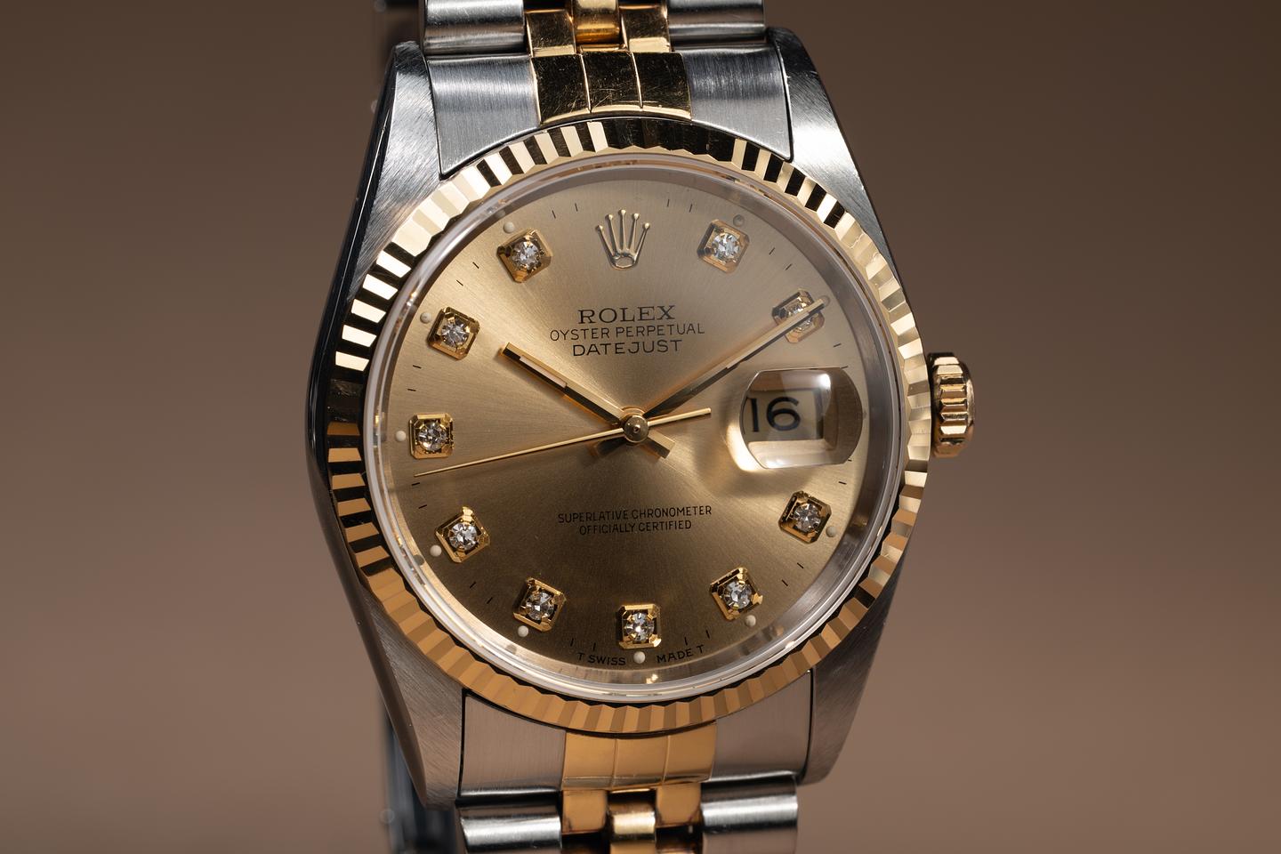 Dial: The champagne diamond dial is excellent, showing little if any wear for its age. The lume has aged to a warm, creamy hue, and the hands match perfectly.