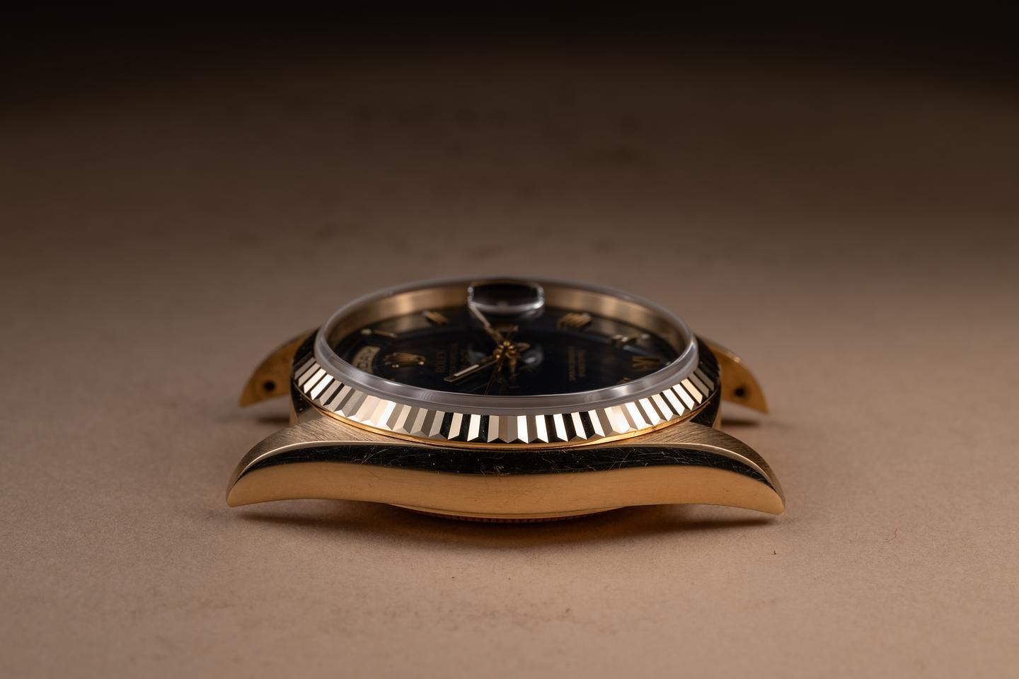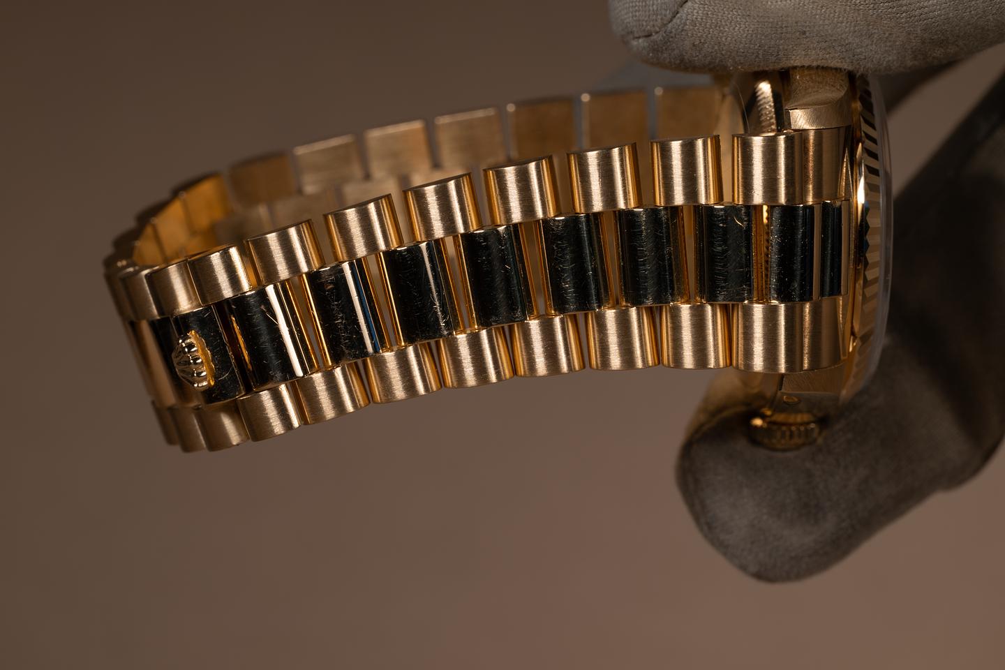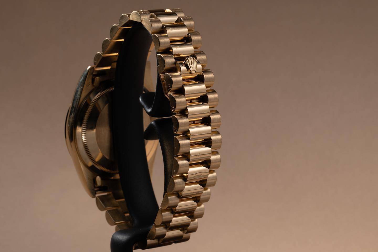 Bracelet: The 22-link 18K yellow gold president bracelet is excellent, showing only very light stretch for its age.