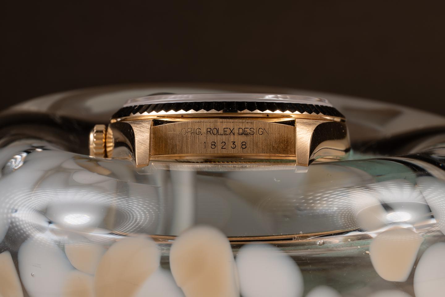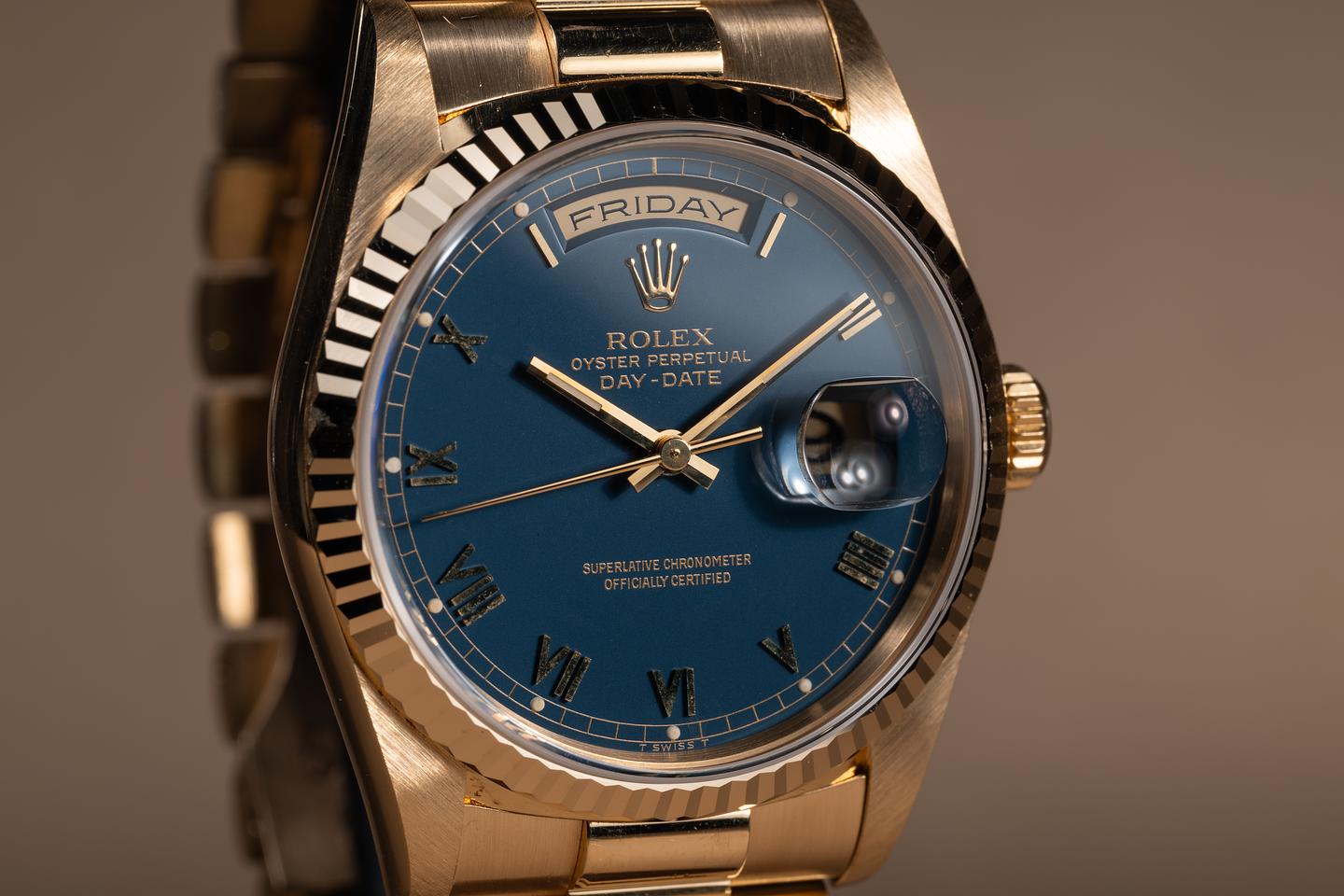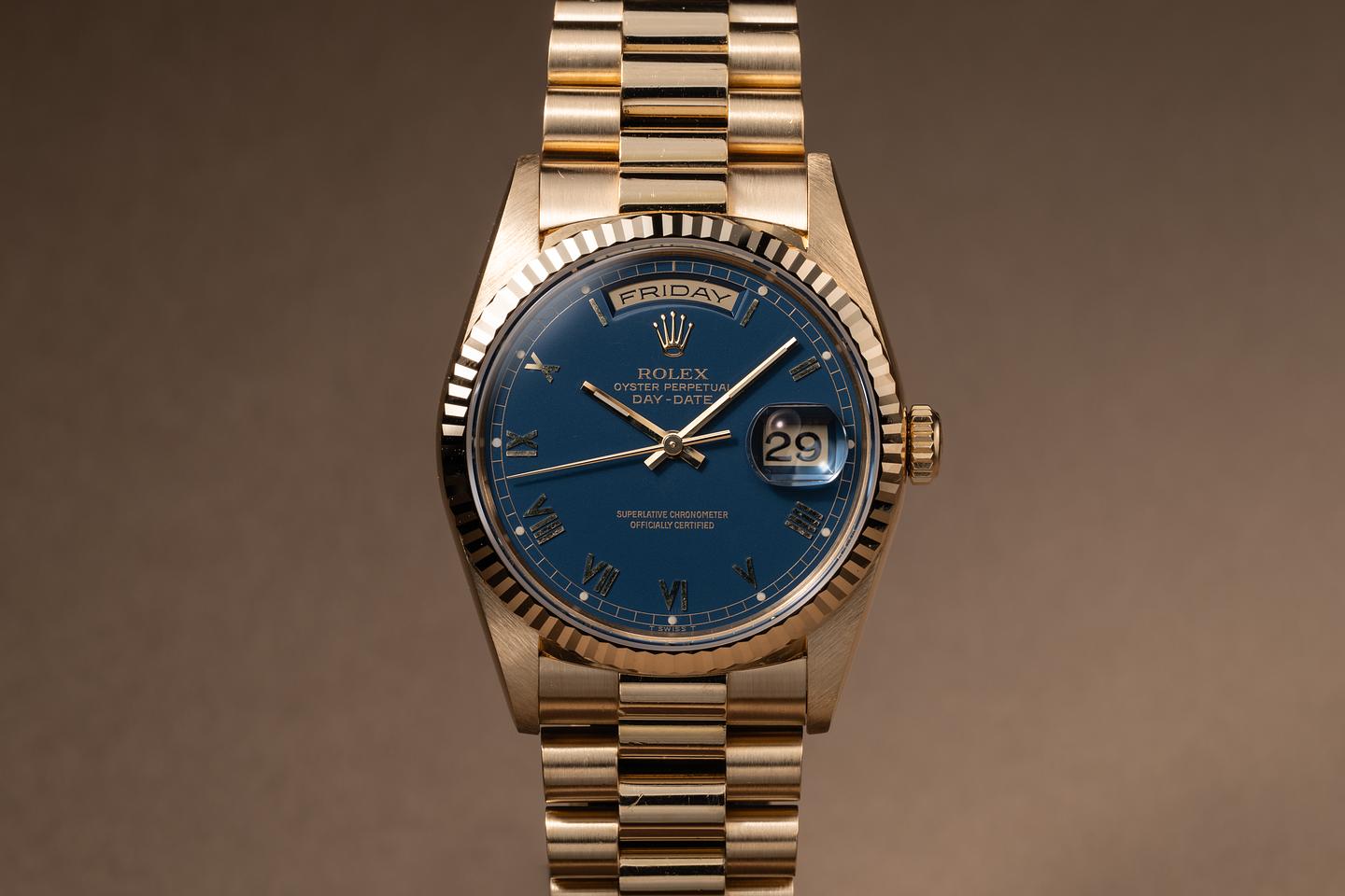 Bracelet: The 22-link 18K yellow gold president bracelet is excellent, showing only very light stretch for its age.