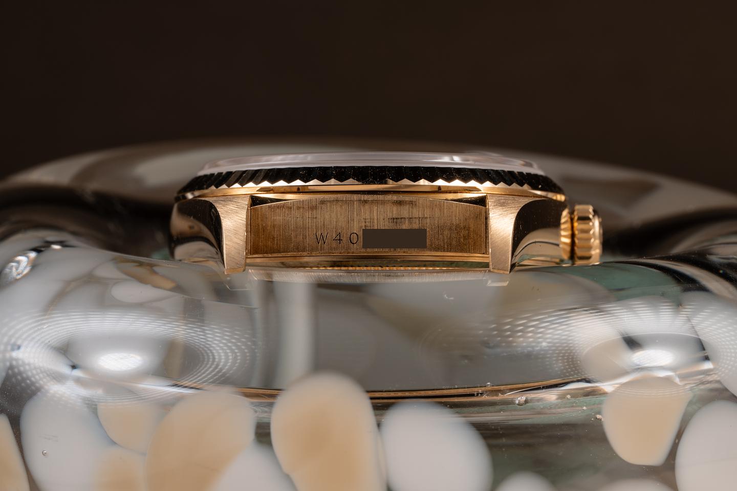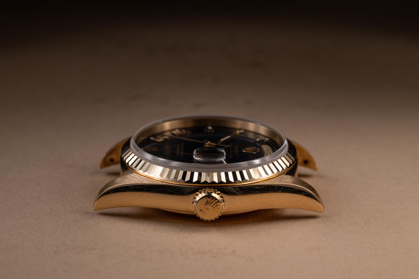 Case: The thick, sharp, and even 18K yellow gold case is excellent, showing only very light wear from use. The sharp 18K yellow gold fluted bezel is also in excellent condition, showing only very light wear from use.