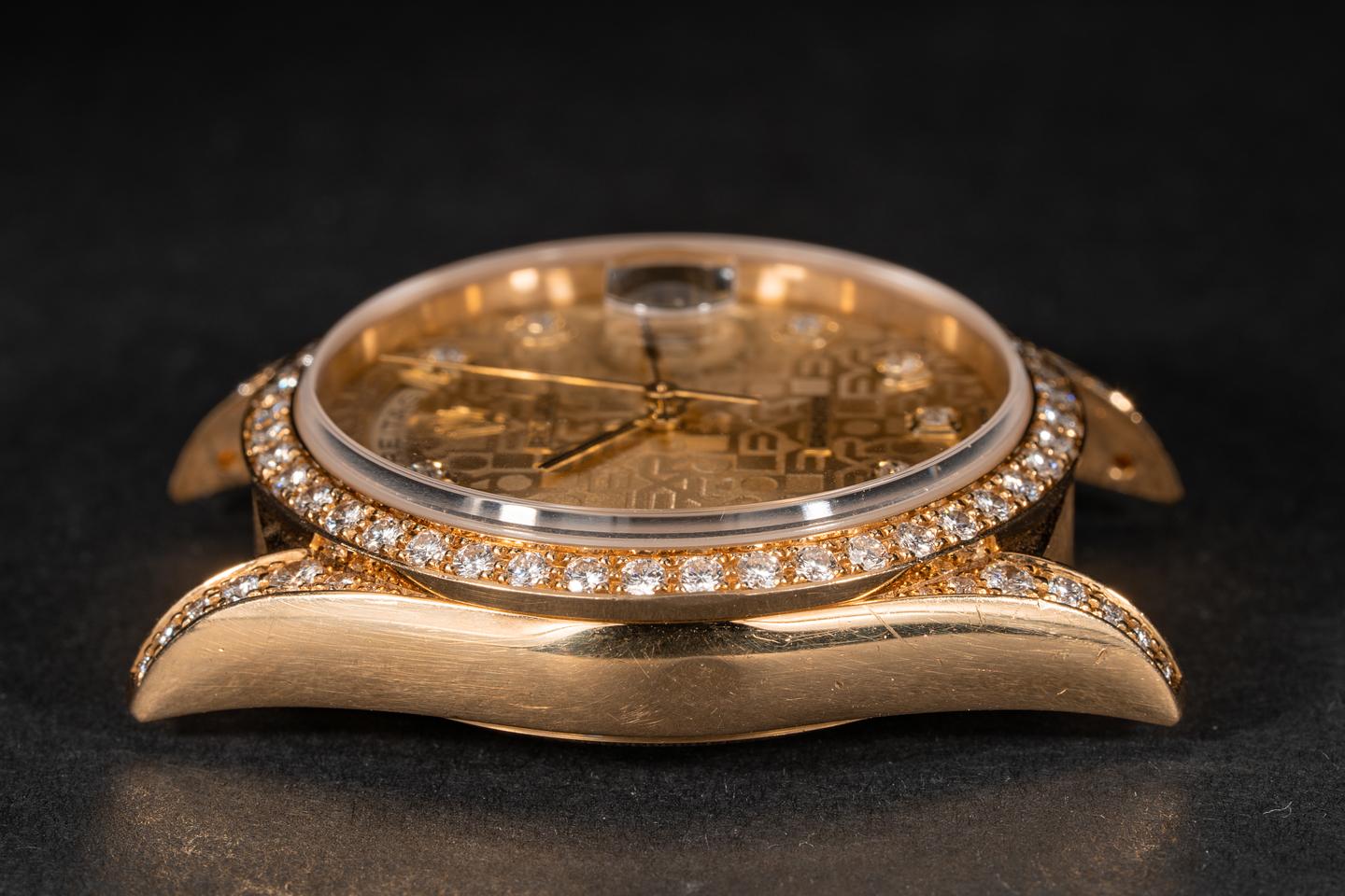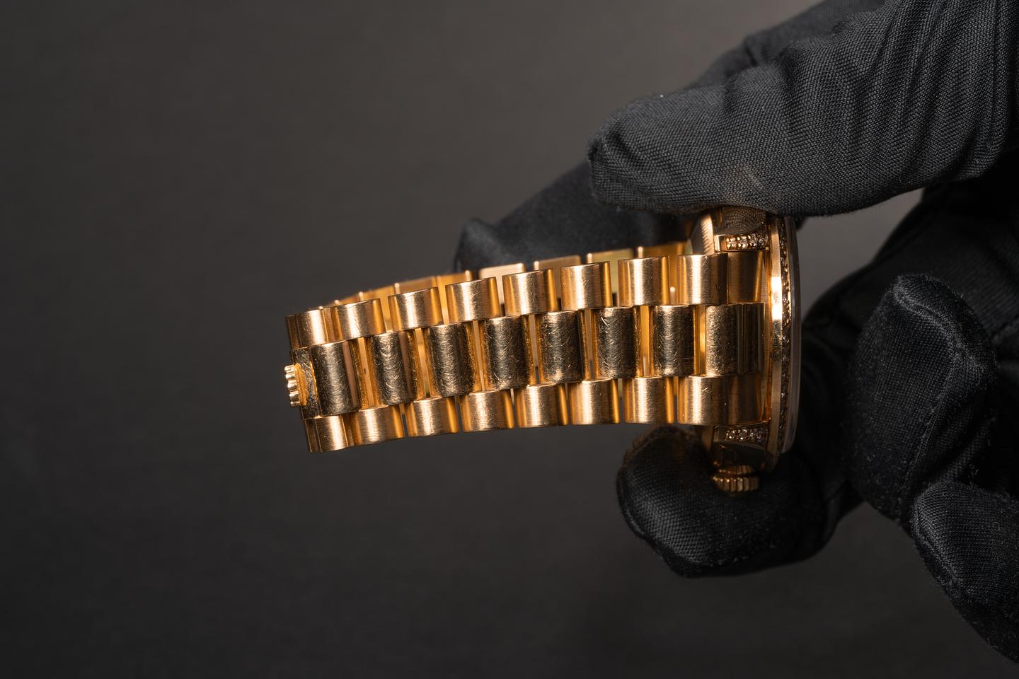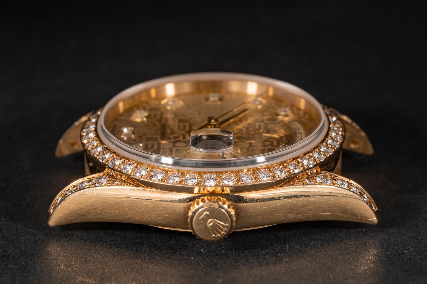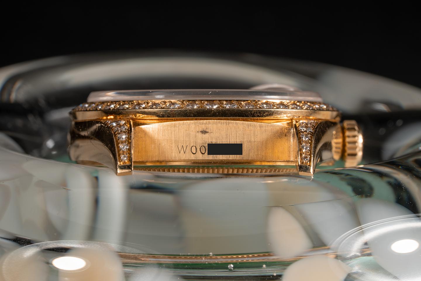 Case: The factory diamond set 18k yellow gold case is thick, even, and in excellent condition showing only light wear from use. The 18k factory diamond set bezel is also excellent and shows only light wear from use.