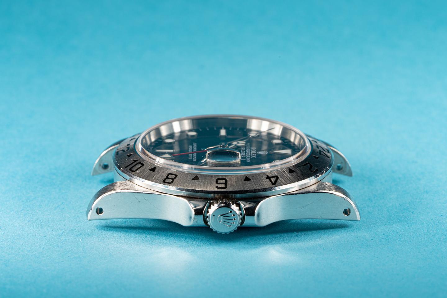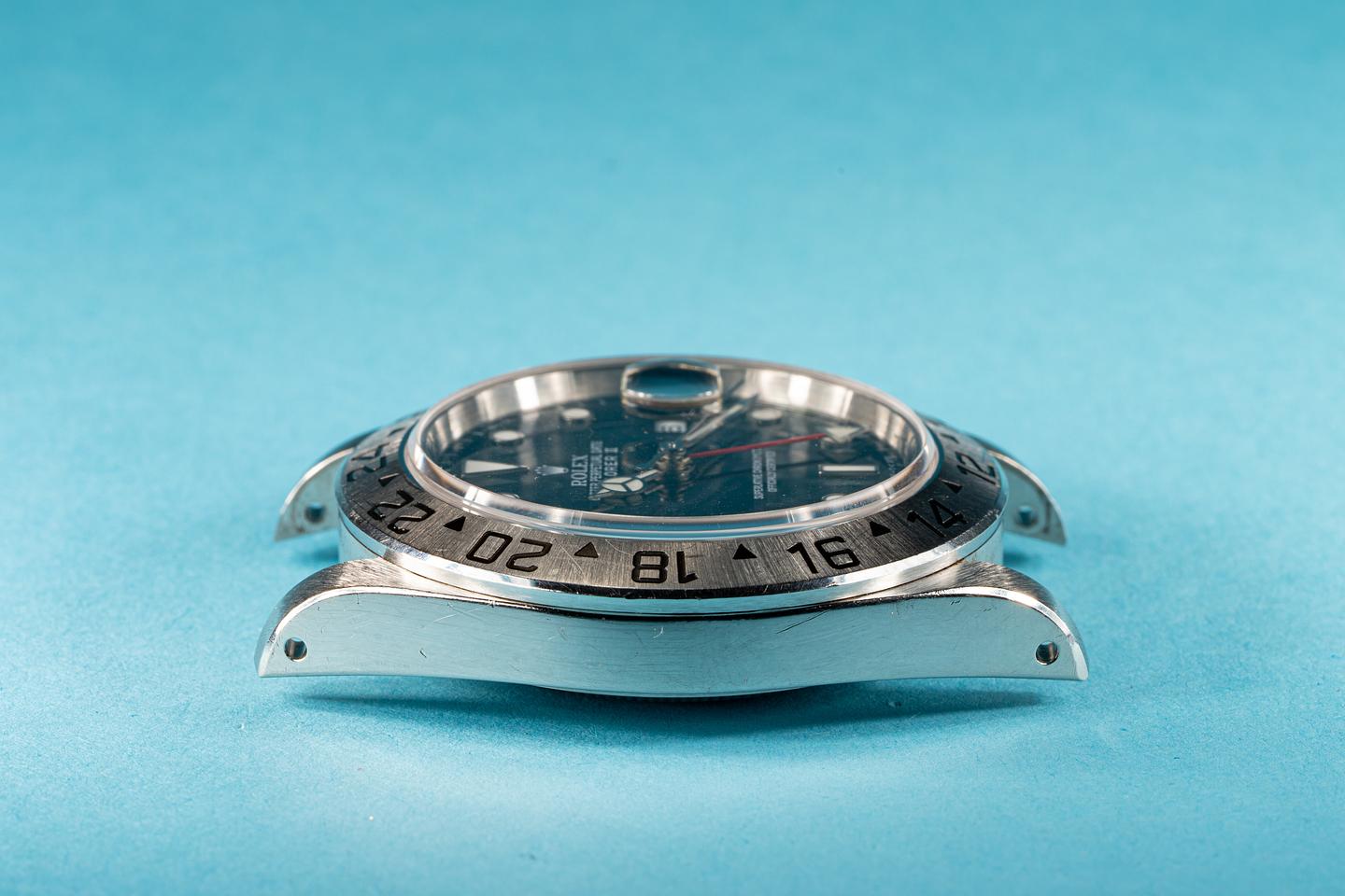 Case: Excellent and thick case with sharp bevels. The stainless steel bezel is also excellent and retains the factory sunburst finish.