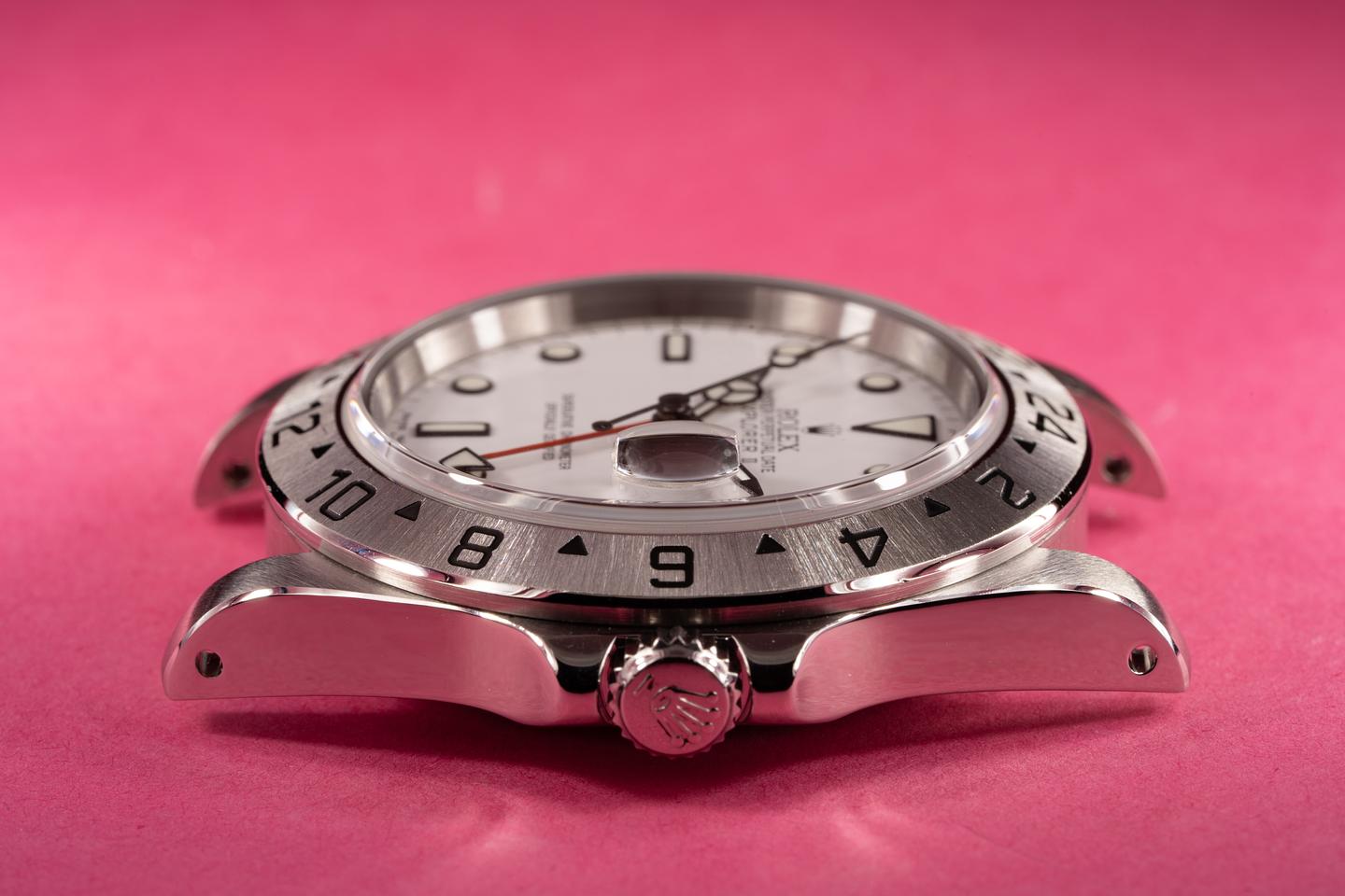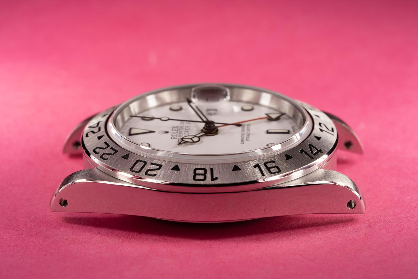 Case: The case and bezel have just returned from polishing showing sharp prominent bevels and prominent sunburst finishing.