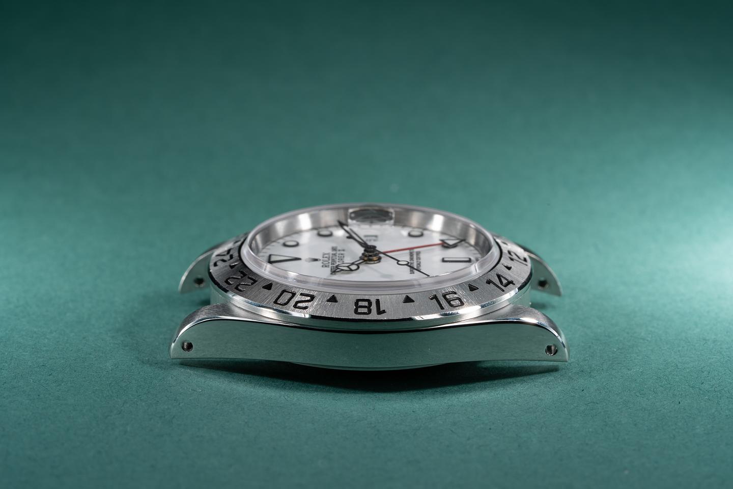 Case: The previously polished case is excellent showing sharp prominent bevels and only light wear from use. The stainless bezel is also in excellent condition showing a sharp and well defined sunburst finish.