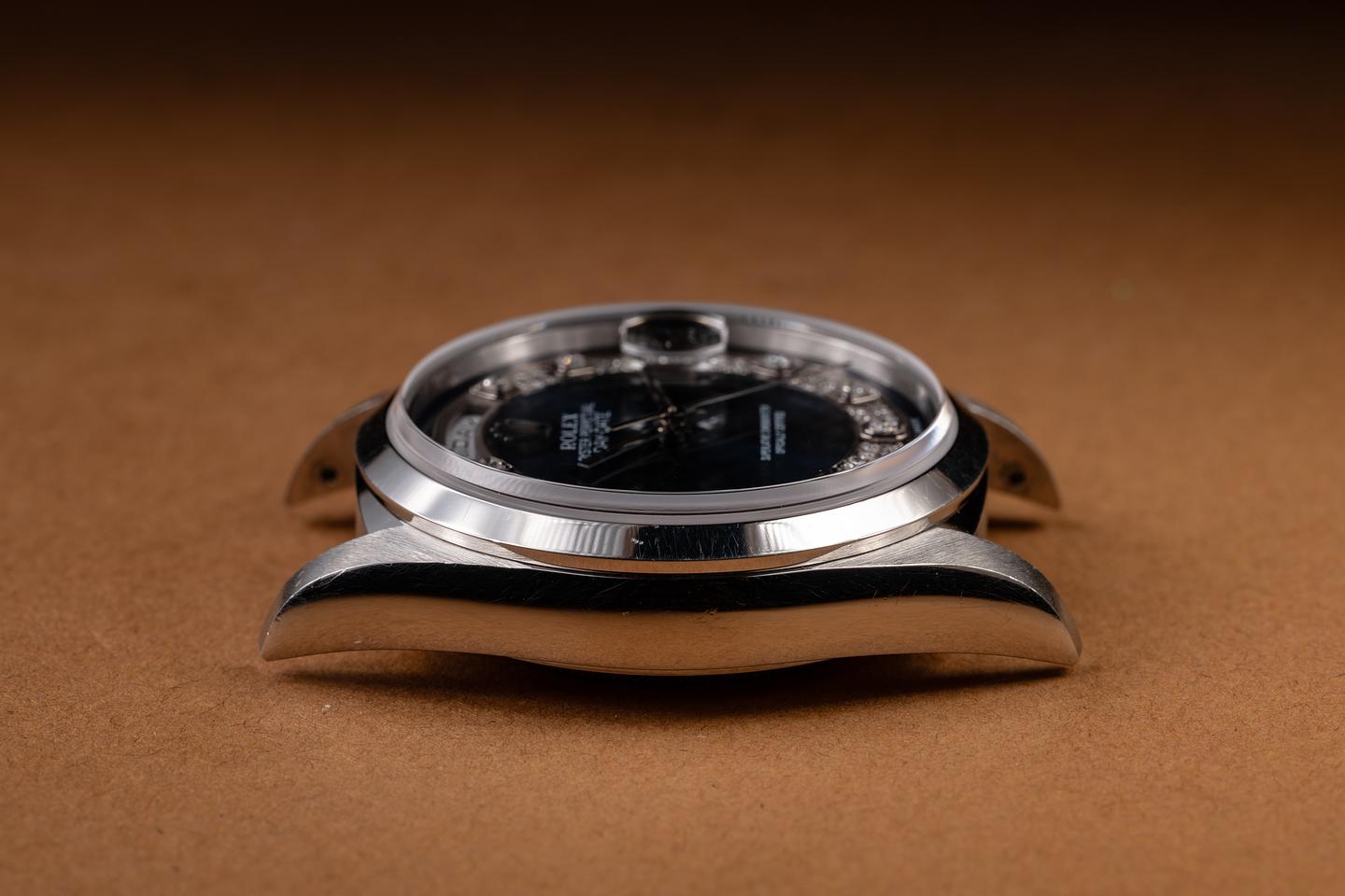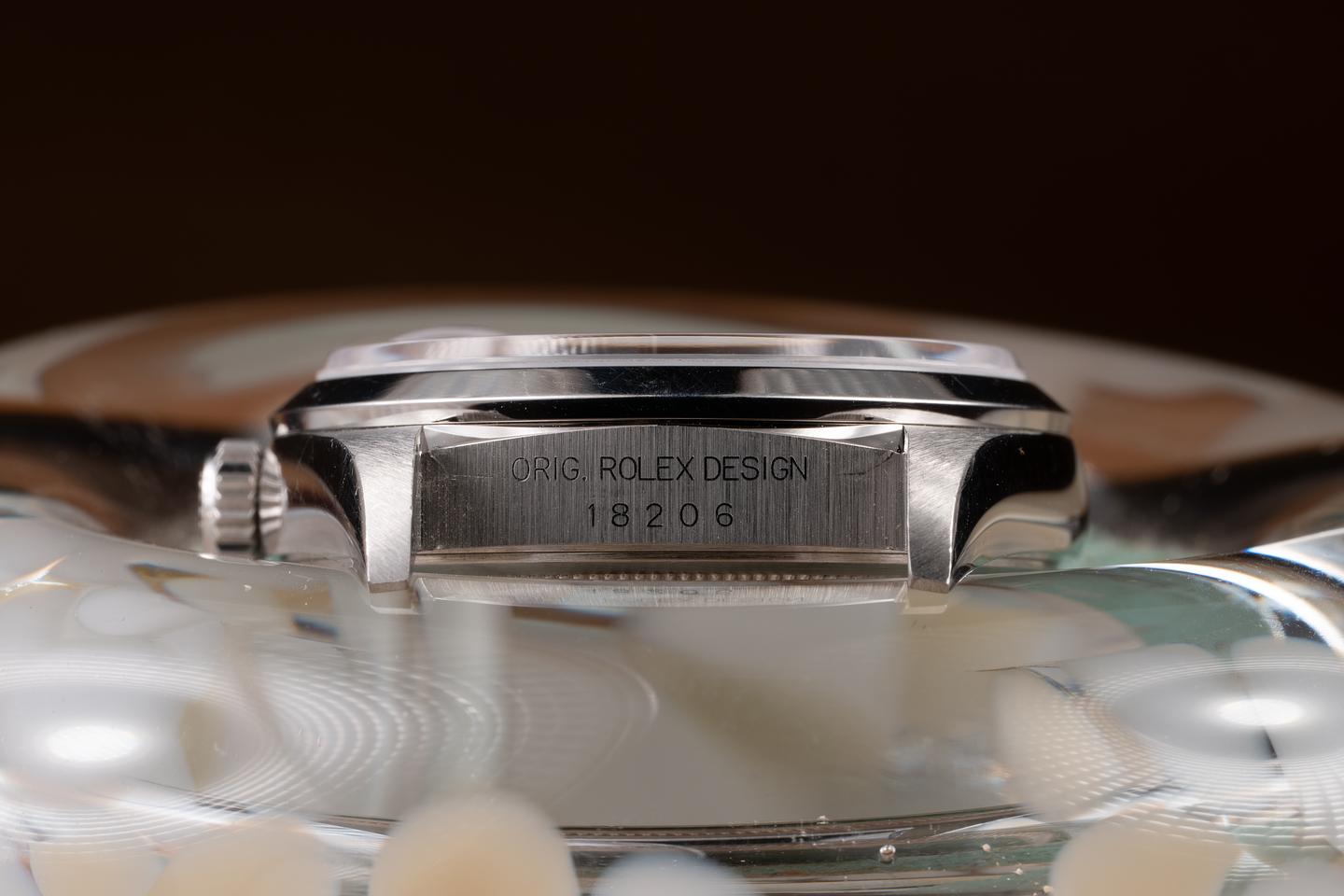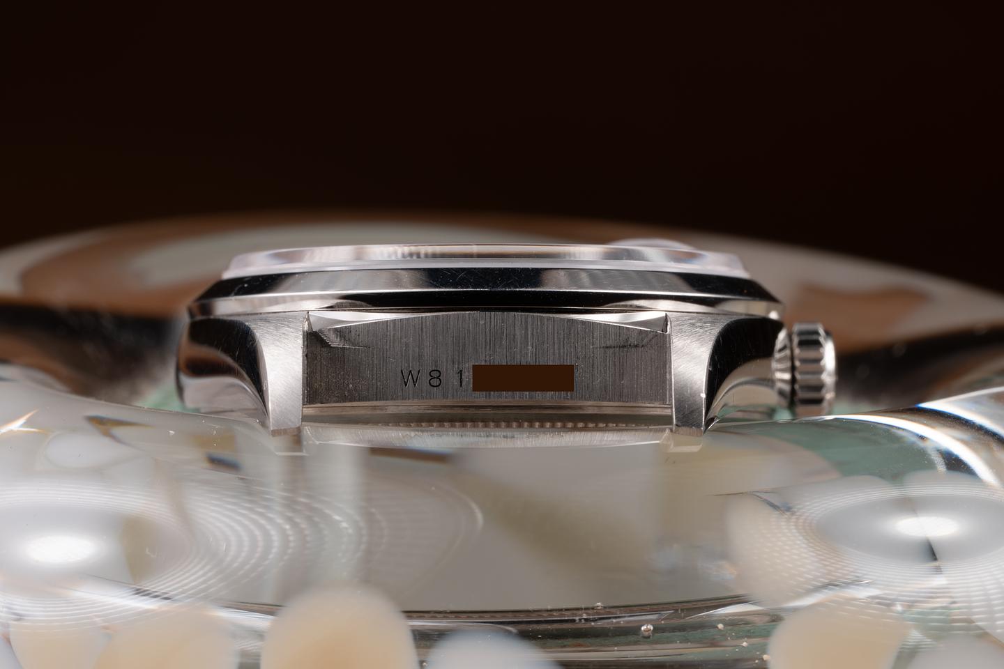 Case: The thick, sharp, and even platinum case is excellent, showing only very light wear from use. The smooth platinum bezel is also in excellent condition, showing only very light wear from use.