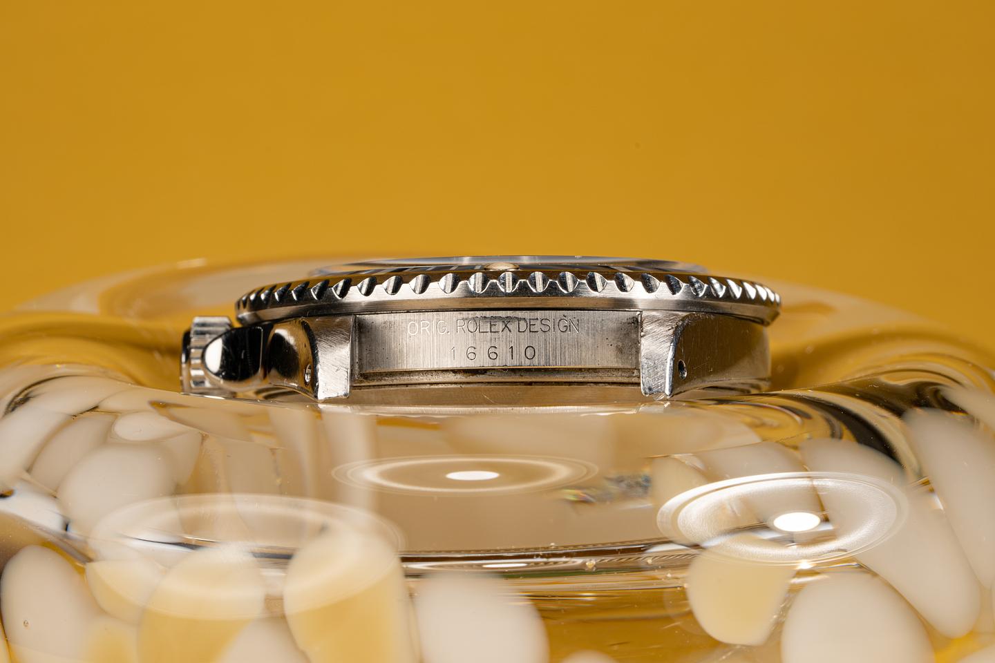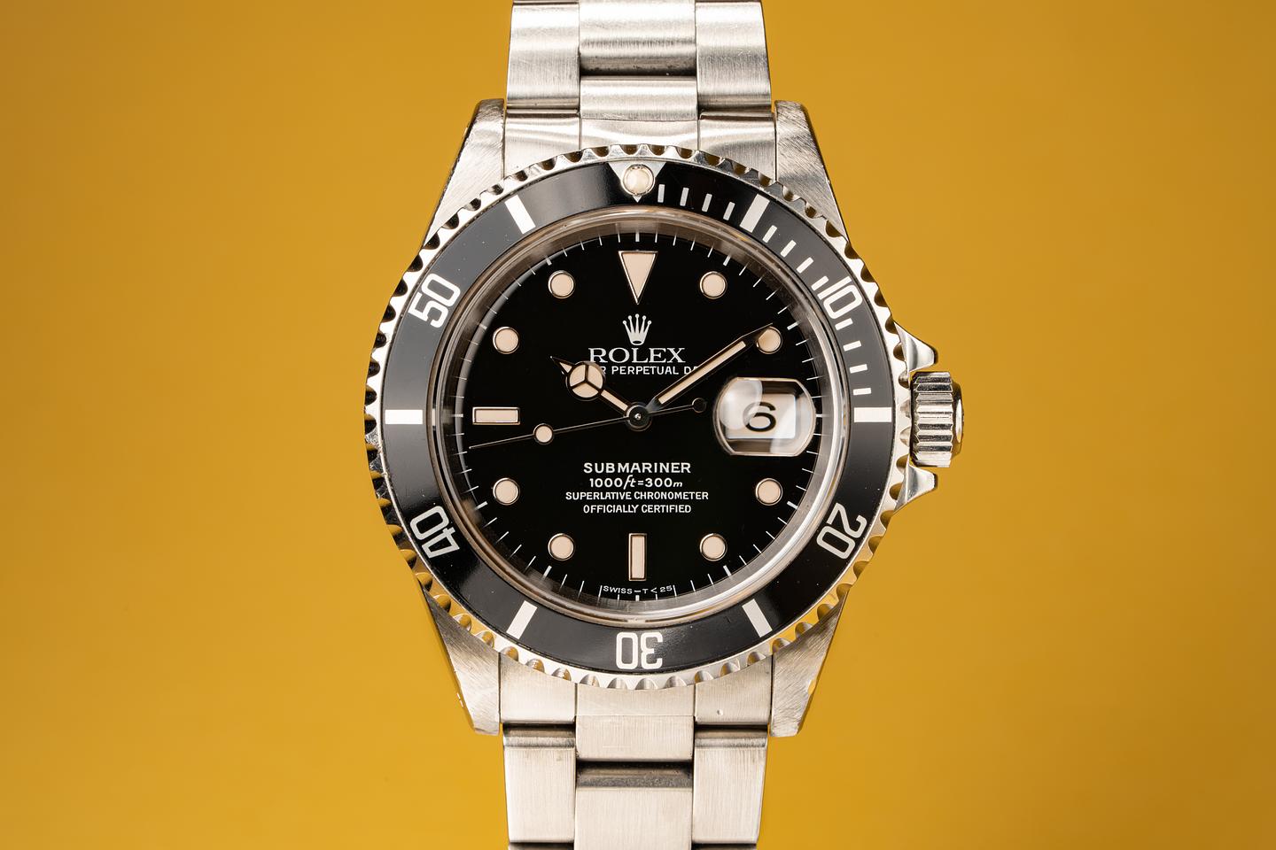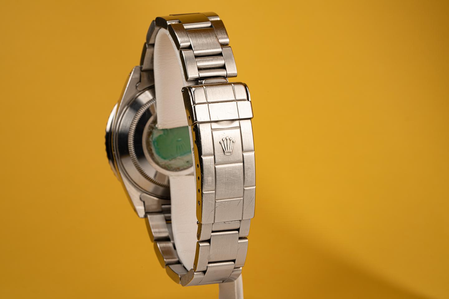 The 16610 is the slightly more complicated workhorse watch for those who need a date function. The thick beveled case shows the amount of wear you would expect from a watch that has been worn since 1995. The clean deep black dial shows no sign of damage and the tritium markers and hands are aging to warmer off white hue. The original bracelet with 11 links and 501 end pieces has light stretch from use.