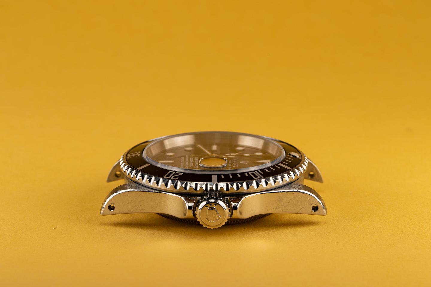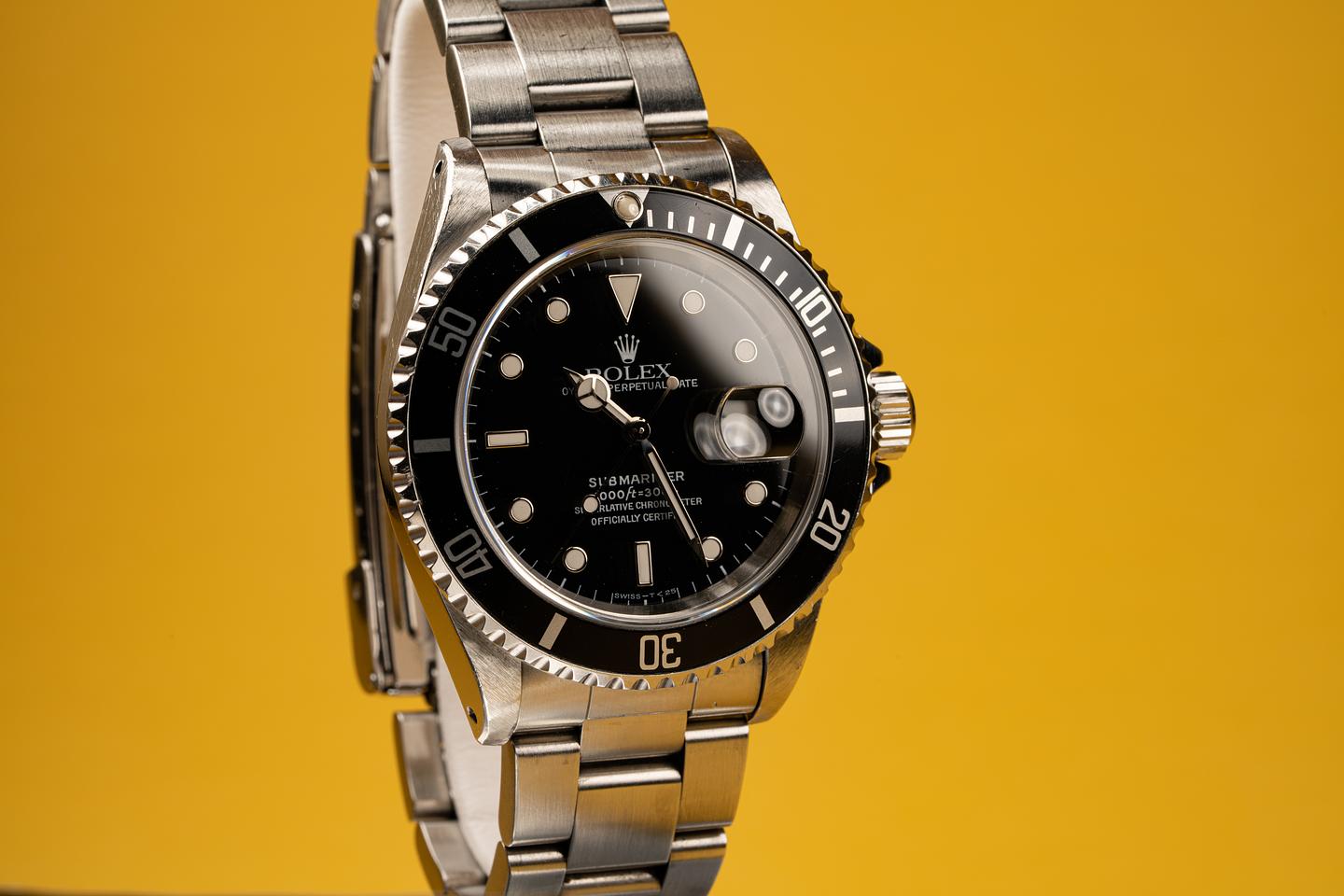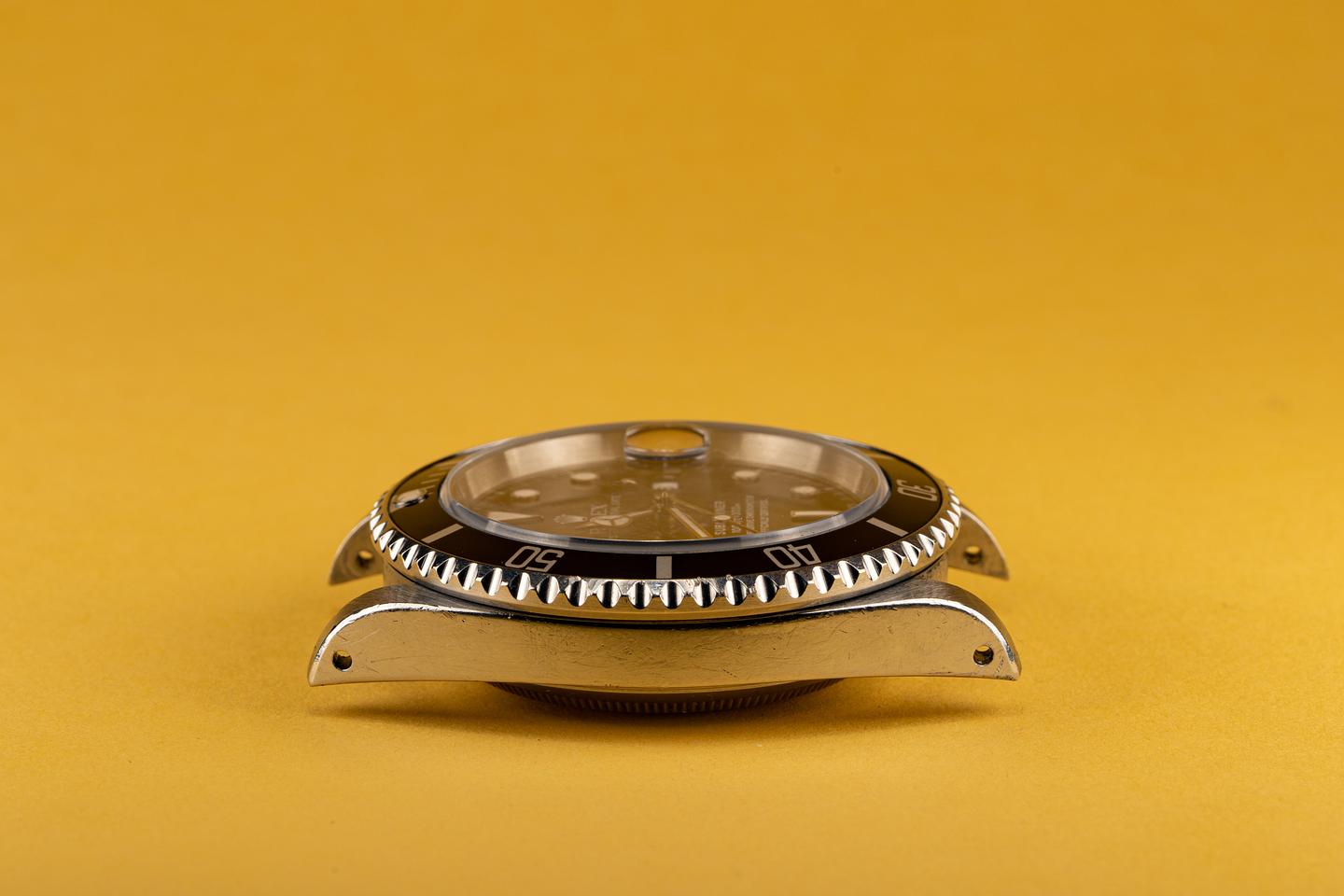 The 16610 is the slightly more complicated workhorse watch for those who need a date function. The thick beveled case shows the amount of wear you would expect from a watch that has been worn since 1995. The clean deep black dial shows no sign of damage and the tritium markers and hands are aging to warmer off white hue. The original bracelet with 11 links and 501 end pieces has light stretch from use.