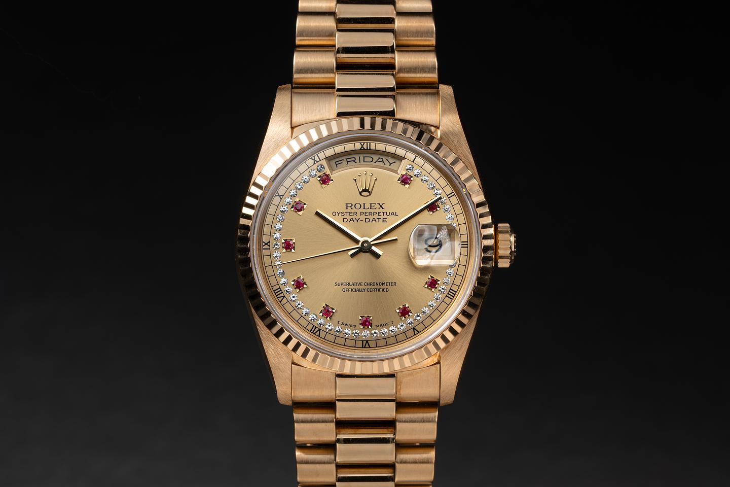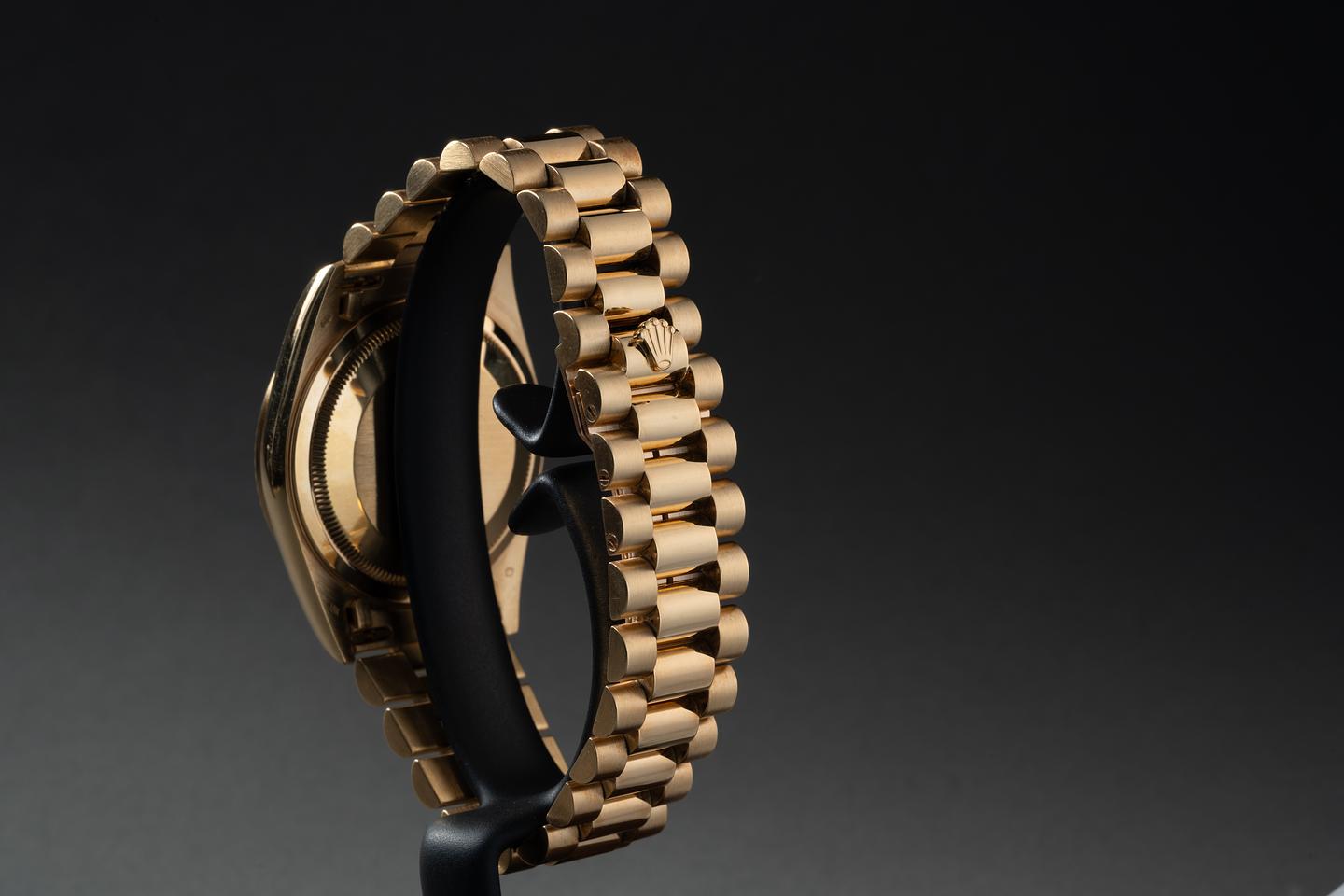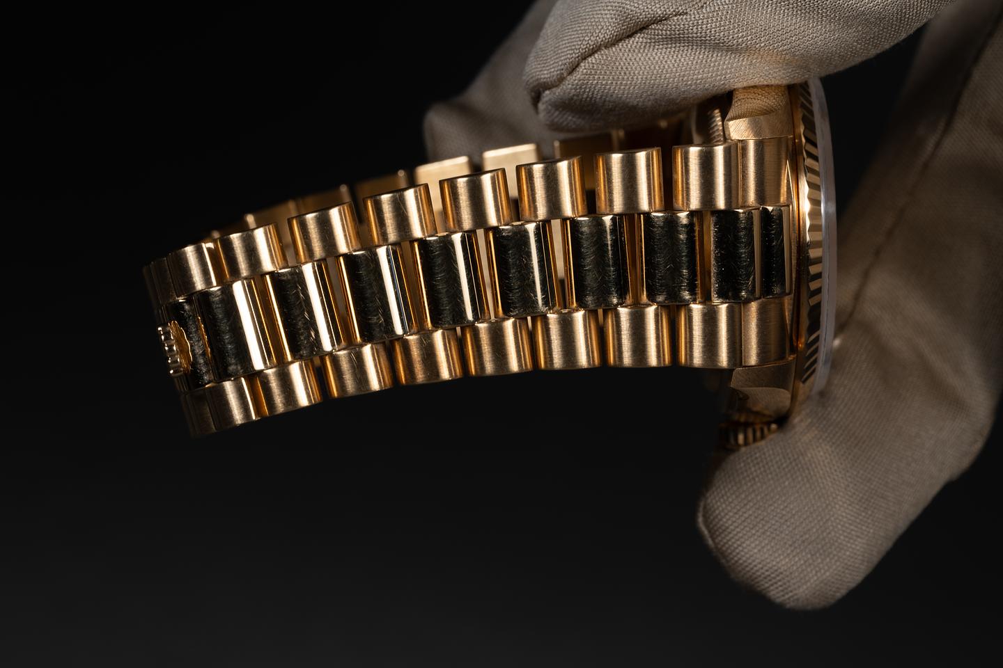 Bracelet: The 22 link 18K yellow gold president bracelet is excellent showing only very light stretch for its age. The clasp is stamped with a matching 1996 date code. The bracelet will fit up to a 17.3 cm. / 6.81" wrist.