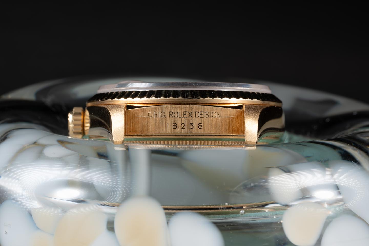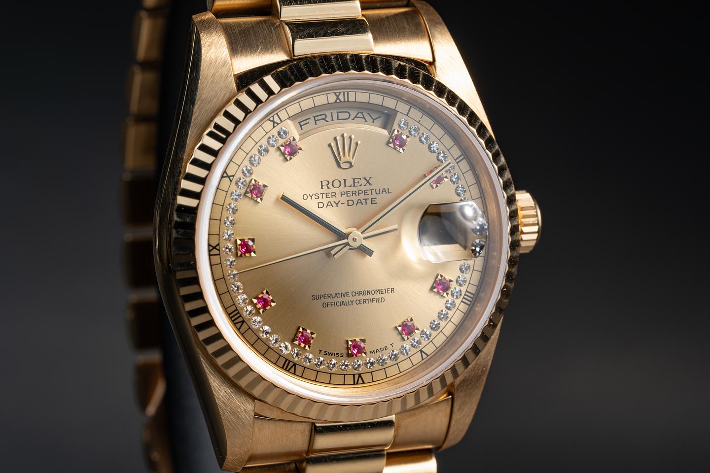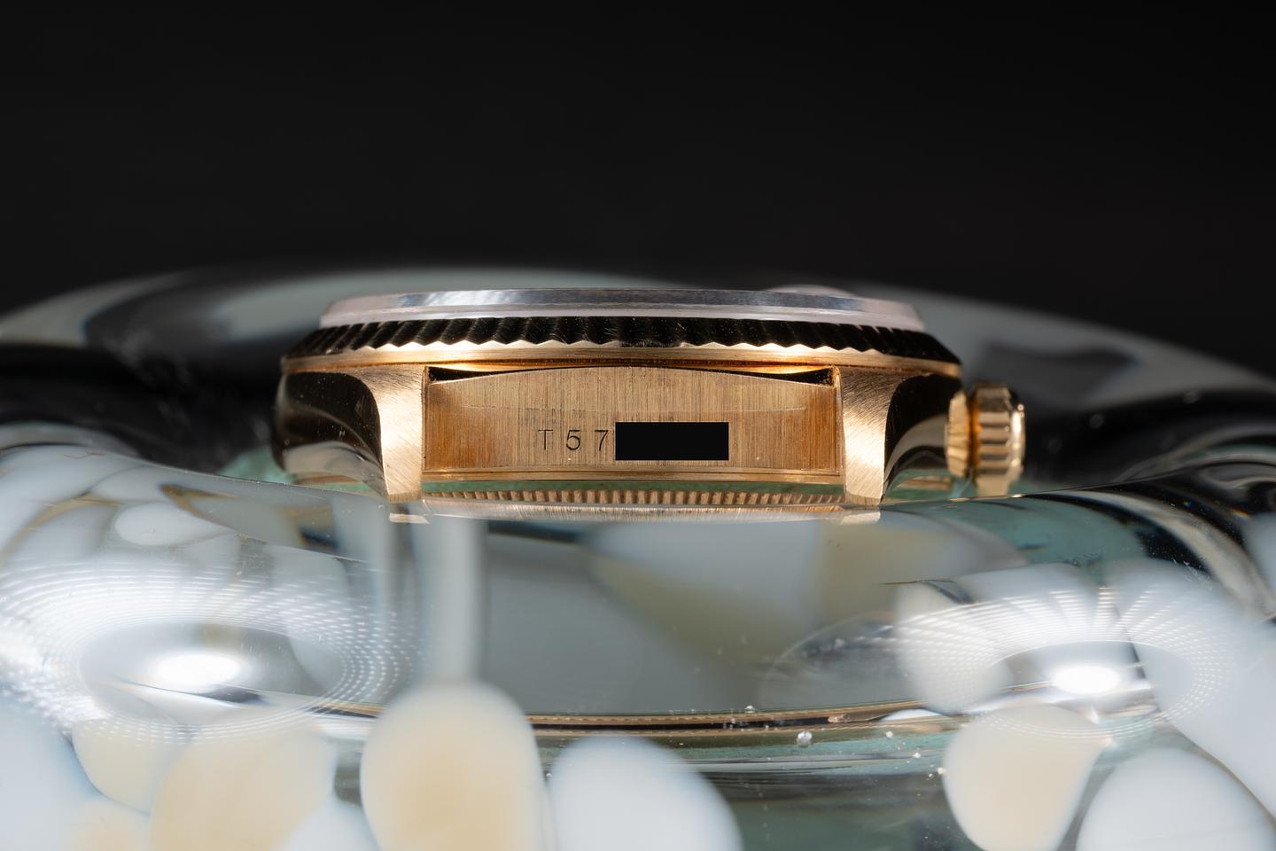 Bracelet: The 22 link 18K yellow gold president bracelet is excellent showing only very light stretch for its age. The clasp is stamped with a matching 1996 date code. The bracelet will fit up to a 17.3 cm. / 6.81" wrist.