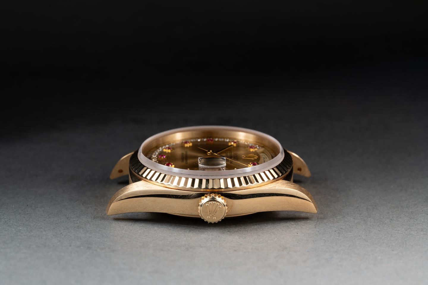 Dial: The champagne diamond and ruby string dial is excellent showing no visible wear. The original factory no lume hands are matching.