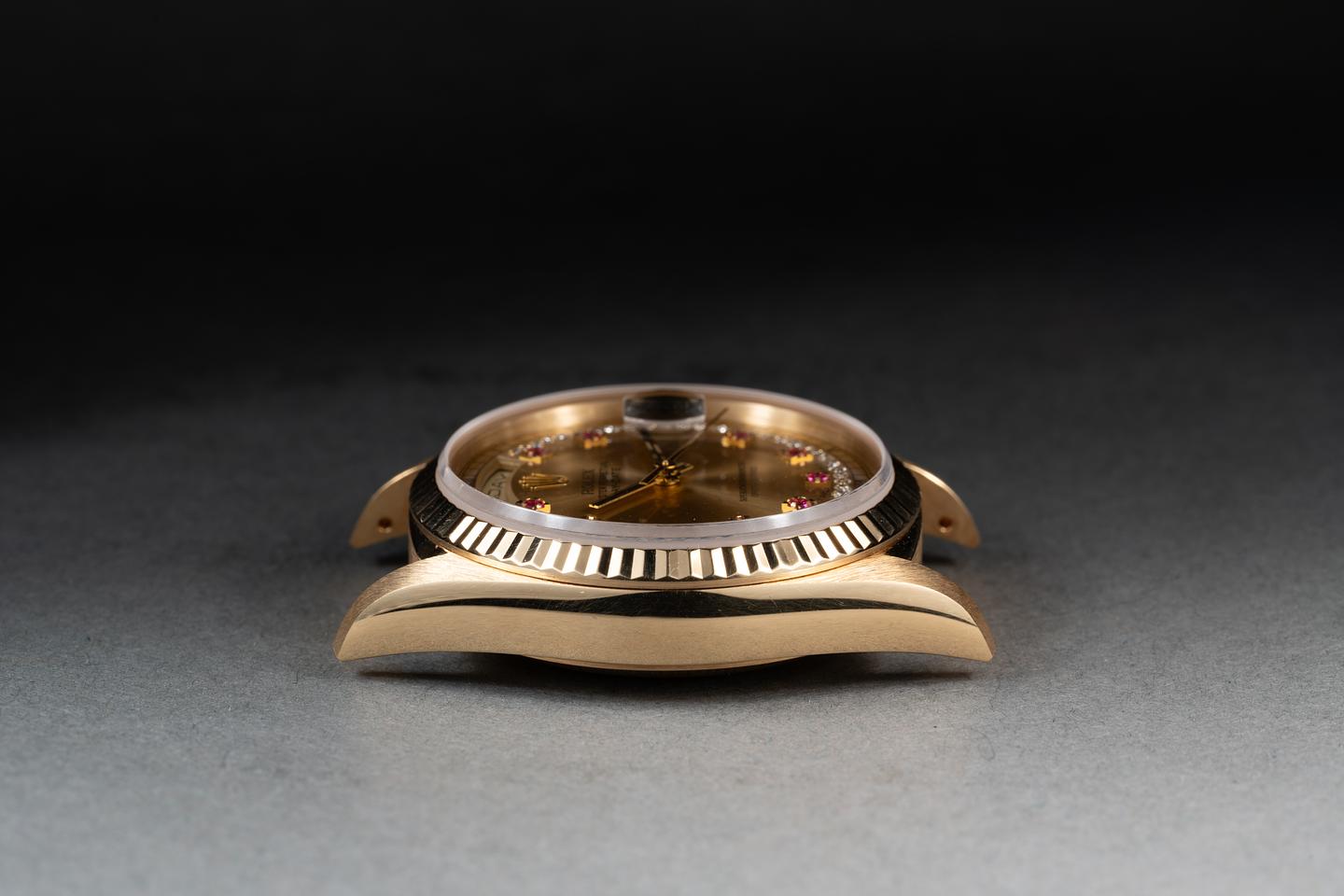 Case: The thick, sharp, and even 18k yellow gold case has recently been polished showing only very light wear. The freshly polished 18k yellow gold fluted bezel is also excellent showing only very light wear.