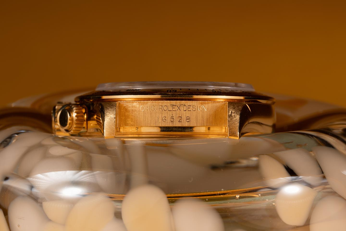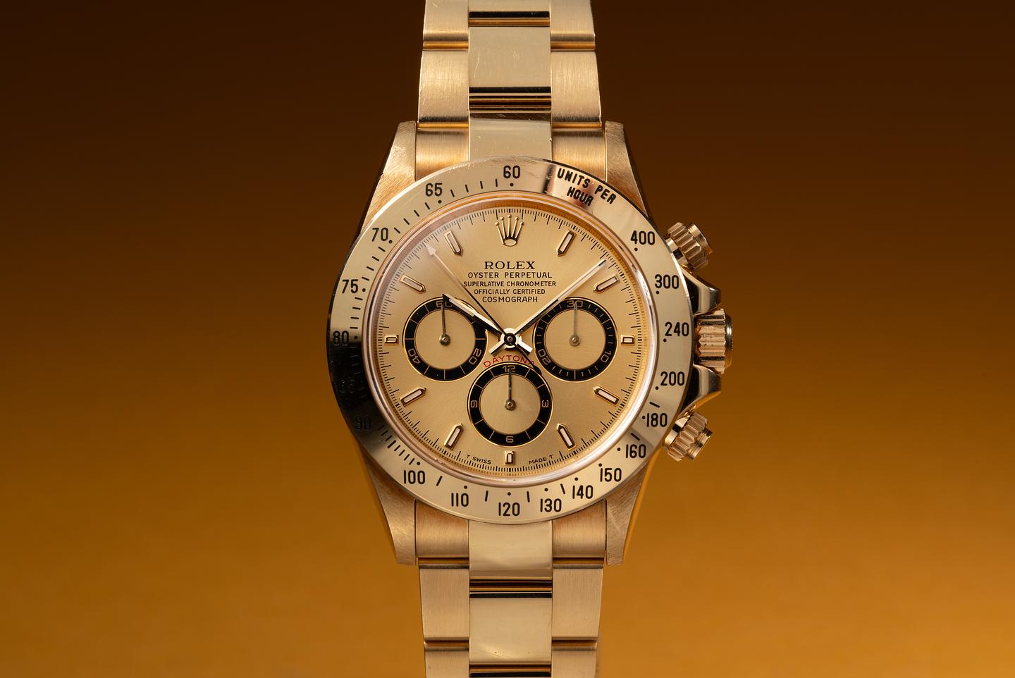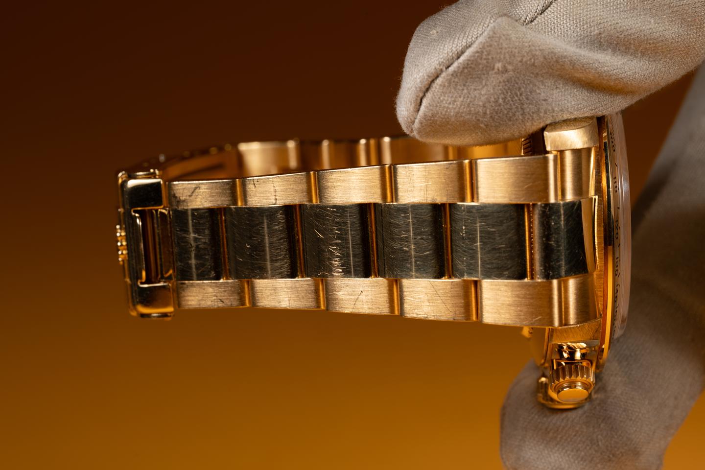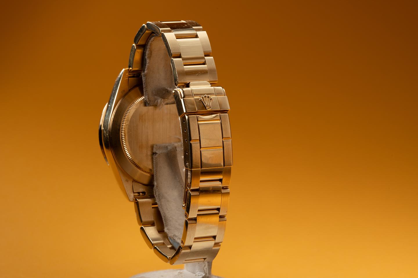 Bracelet: The 12 link 18K yellow gold Oyster bracelet is excellent showing only extremely light stretch for its age. The clasp is stamped with a matching 1996 date code.