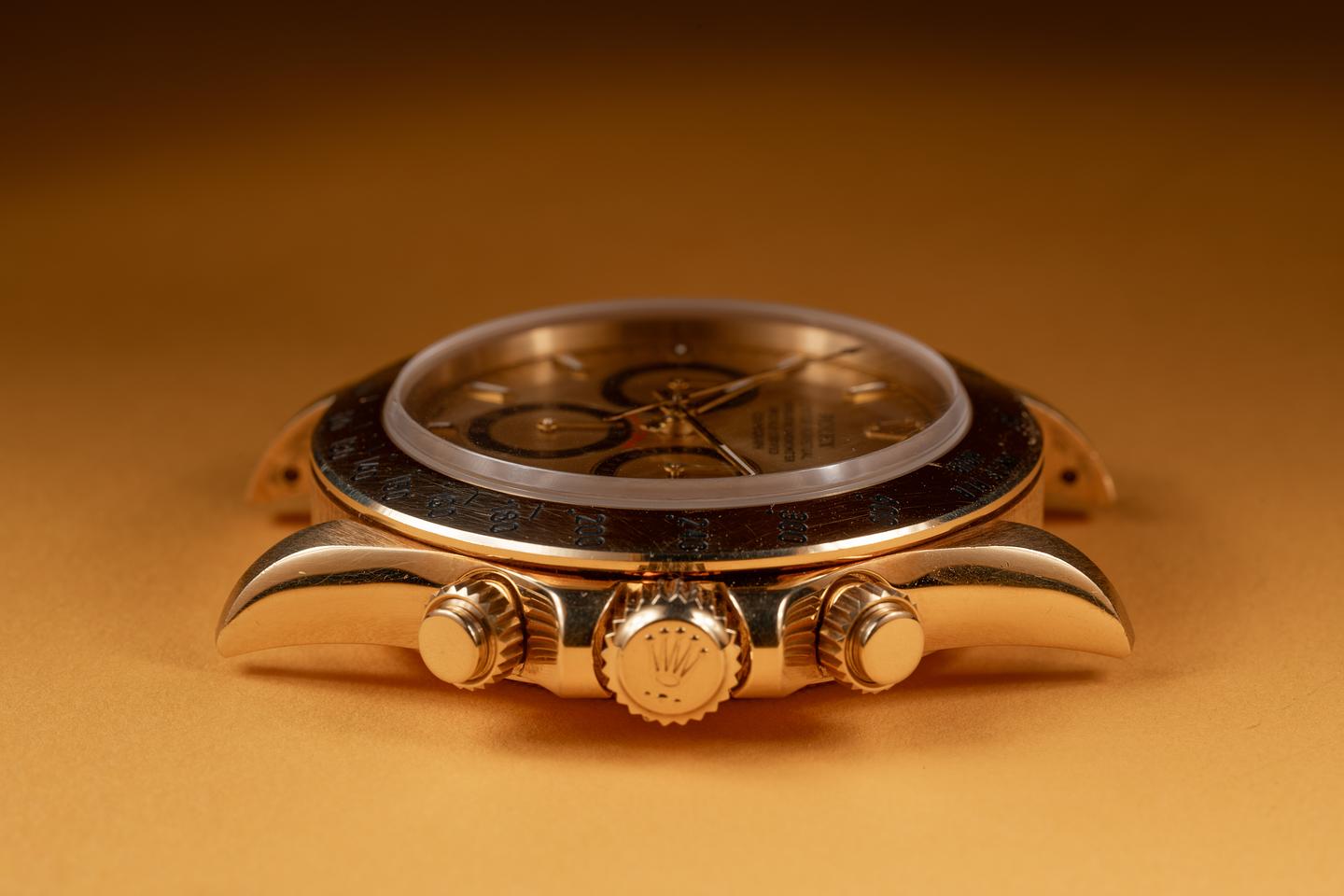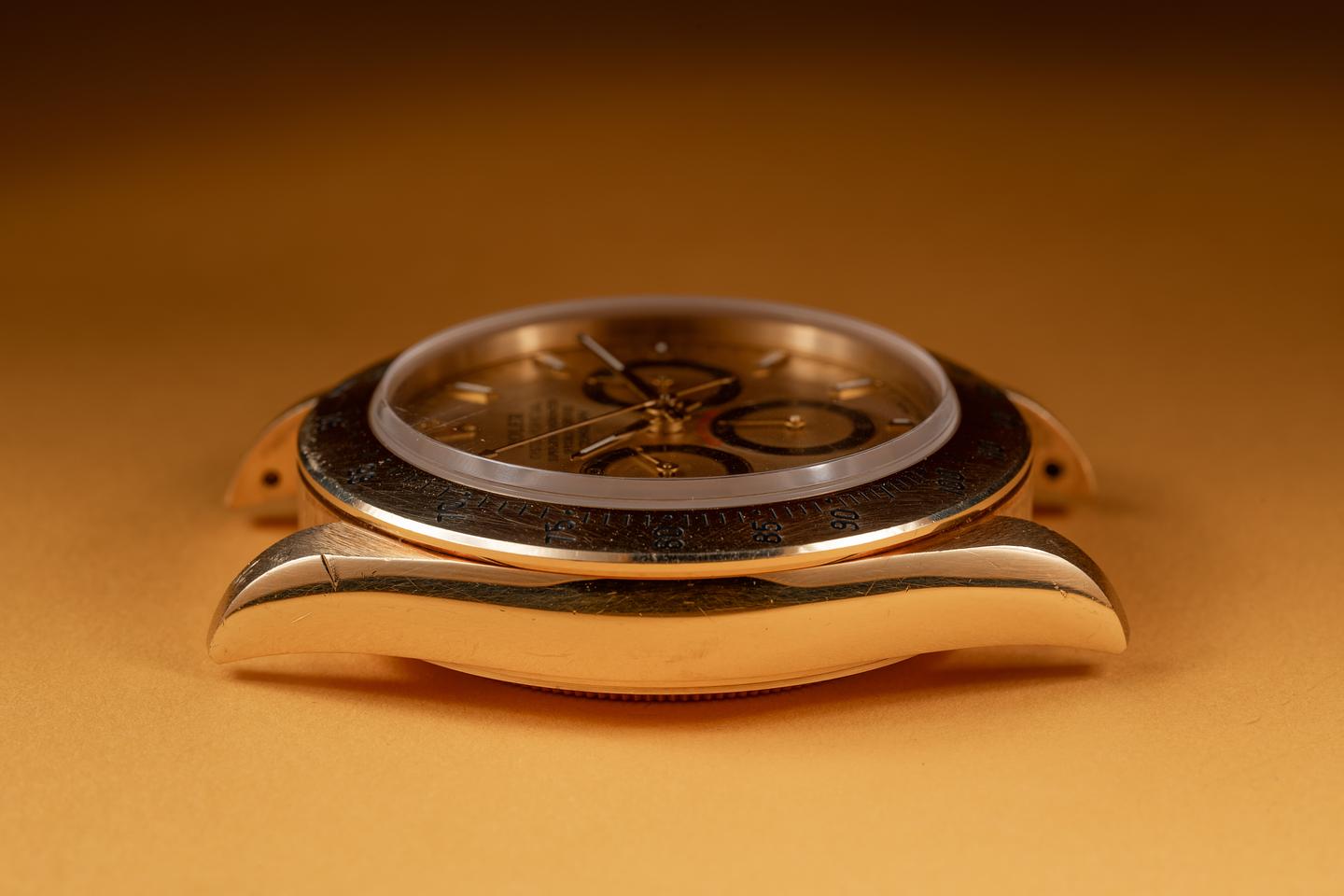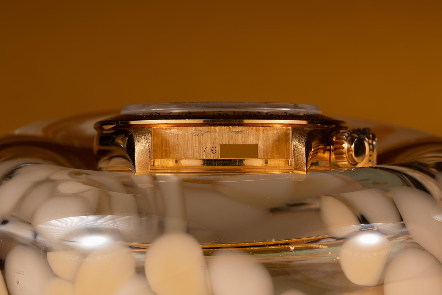 Case: The thick and even 18k yellow gold case is excellent showing only light wear from use. There is one small ding on the side of the 11 o'clock bezel. The 18k yellow gold bezel is also in excellent condition showing only light wear from use.