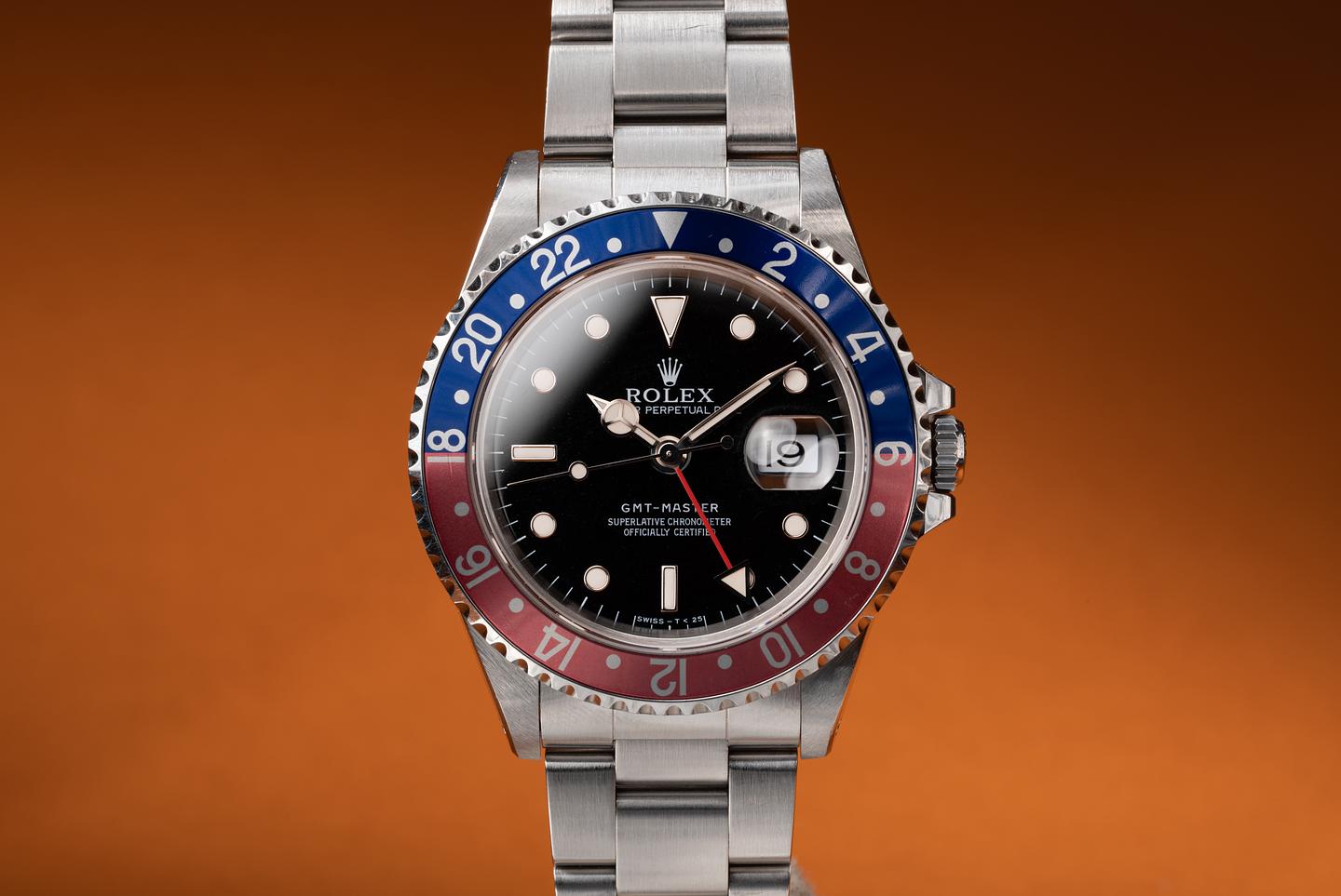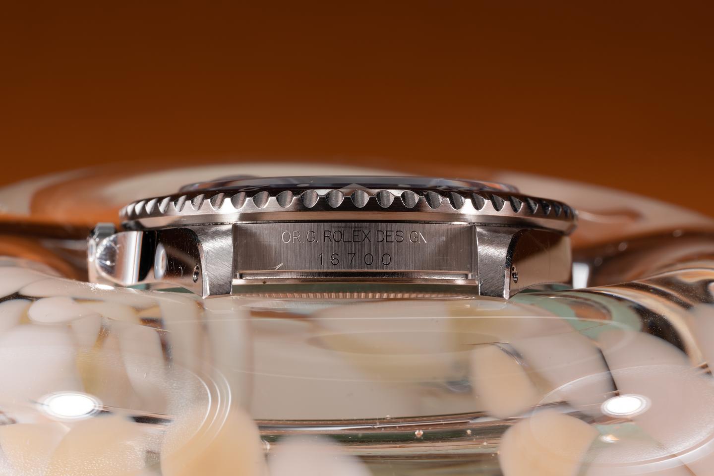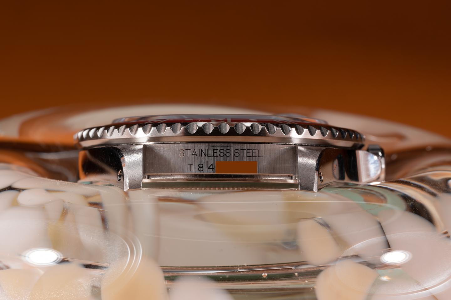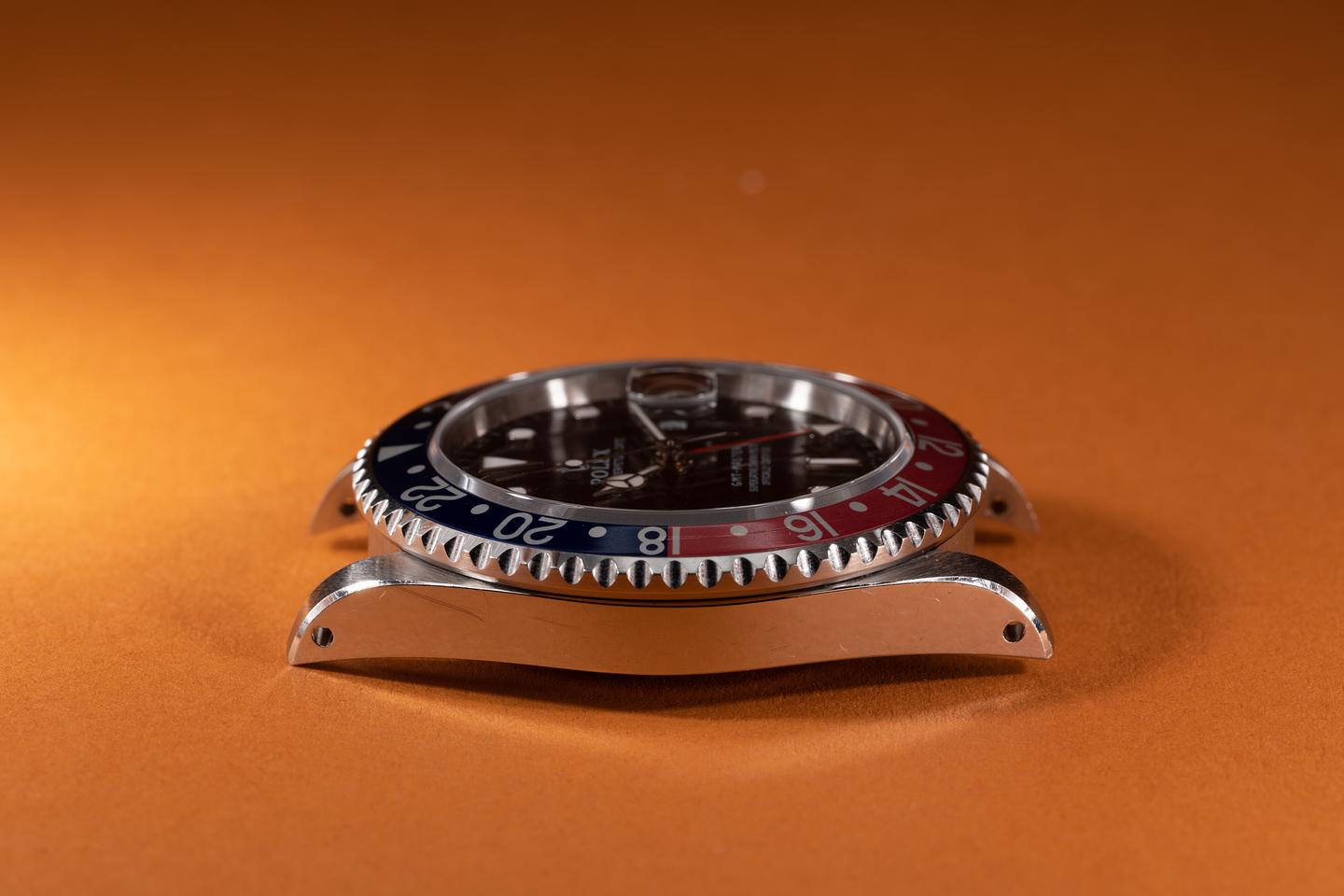 Case: The thick and even case appears to be unpolished showing sharp prominent factory bevels and some light wear from use. The "Pepsi" bezel insert is also in excellent condition showing only light wear from use. The red portion of the insert has faded to a light silvery red while the blue portion remains largely unfaded.