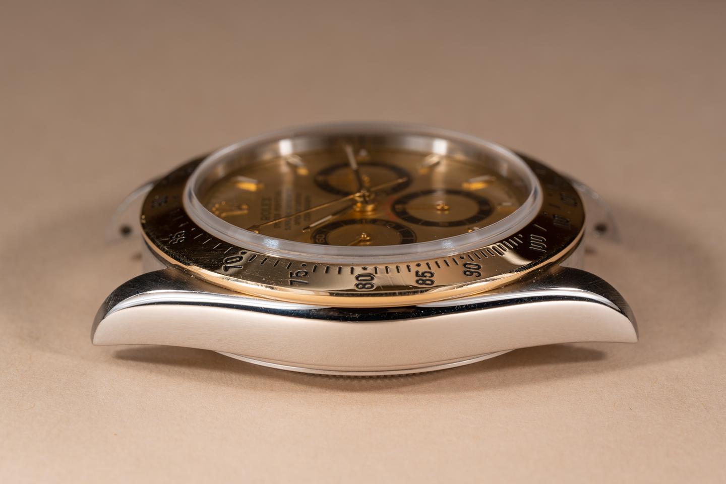 Case: The thick and even case has been polished in the past showing only light wear from use. The 18k yellow gold bezel is also in excellent condition showing only light wear from use.