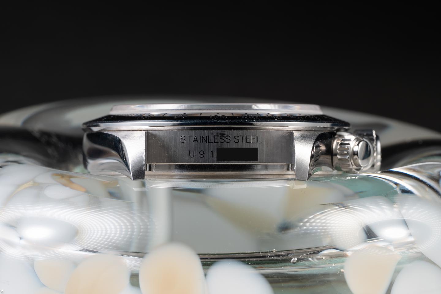Case: The case is in unpolished and has some light wear from use. There is a small ding on the 1 o'clock bezel edge. The stainless bezel is also in unpolished showing only very light wear.