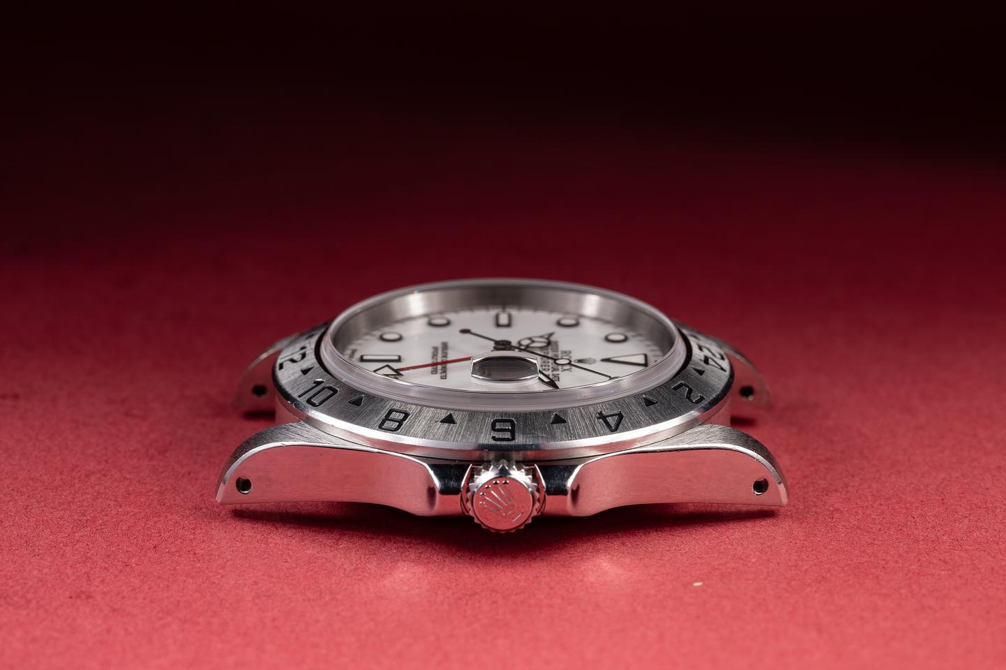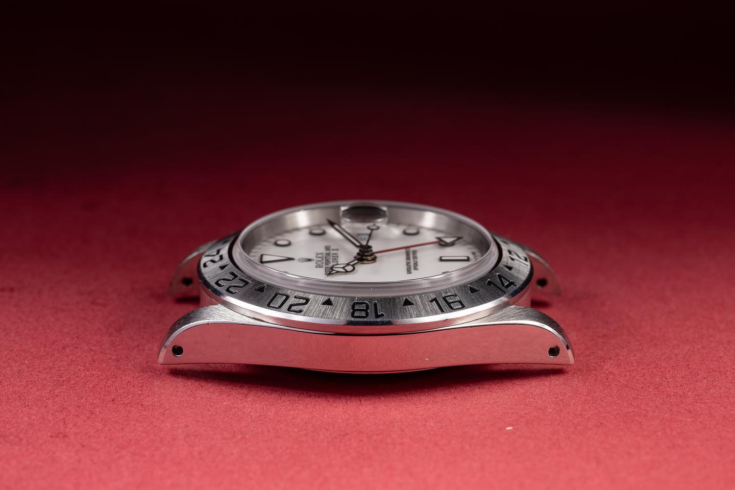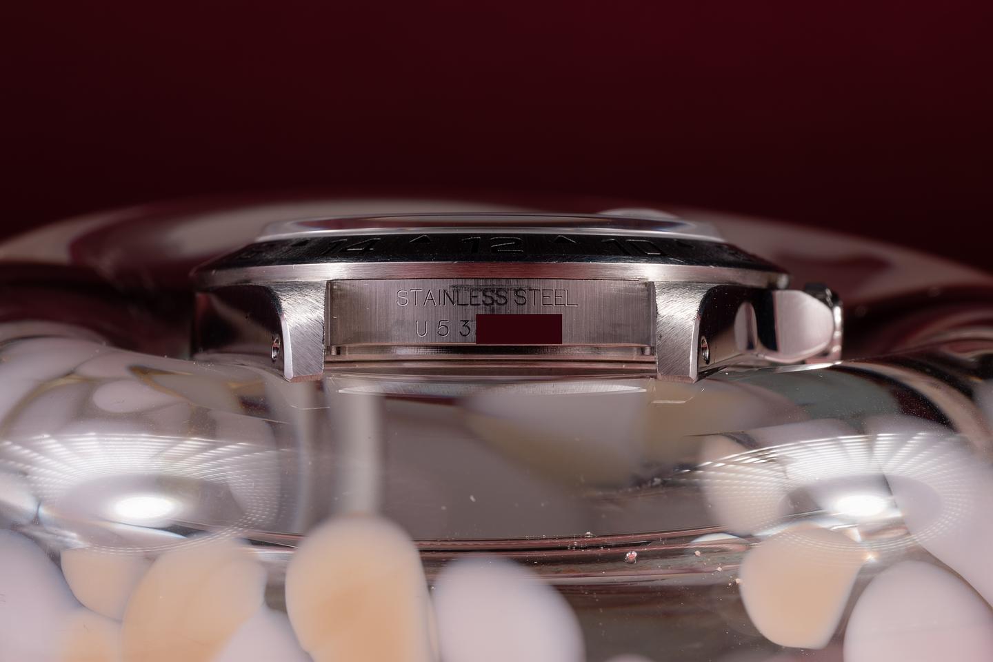 Case: The recently polished case is excellent, showing sharp, prominent bevels and only very light wear. The stainless bezel is also in excellent condition, showing only very light wear.