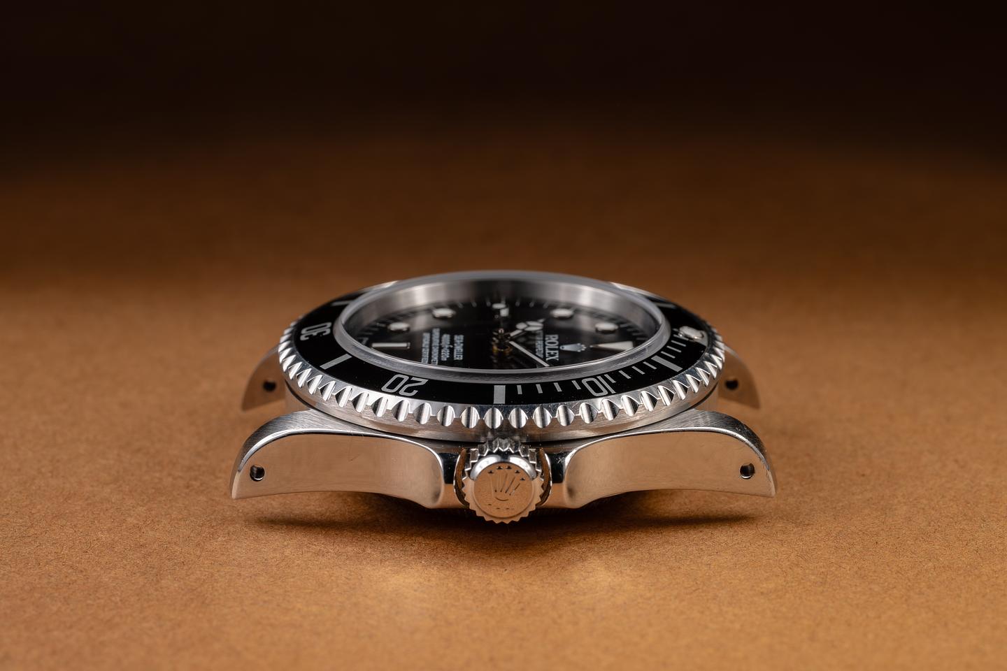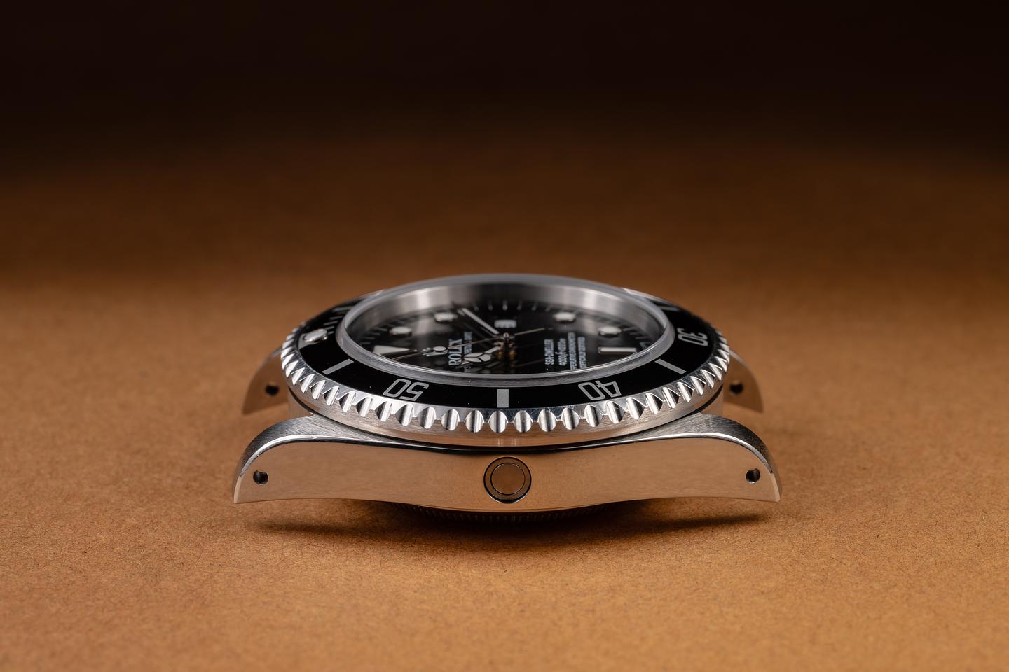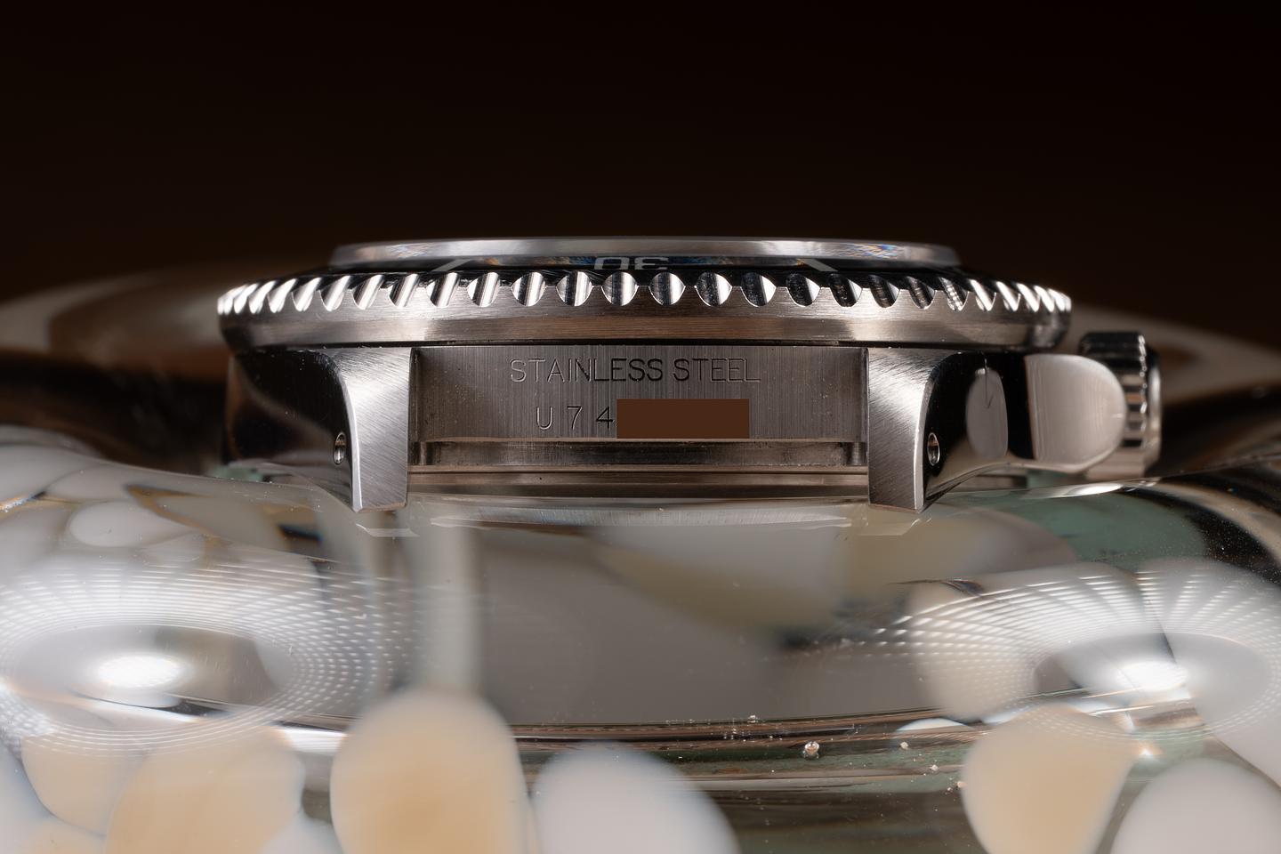 Case: The thick, even case is excellent, showing prominent bevels and only light wear from use. The black bezel insert is also in excellent condition, showing only light wear from use. The watch still retains its green sticker on the back of the case.