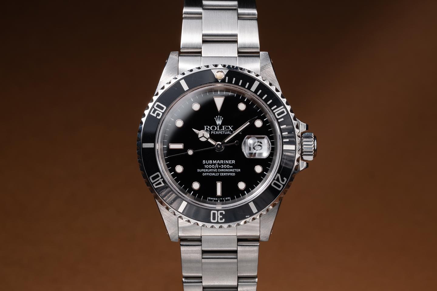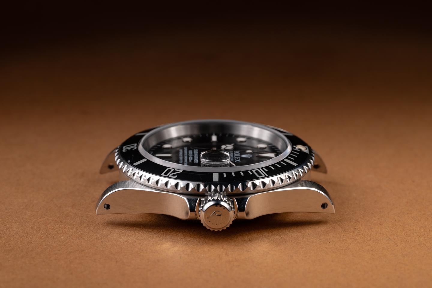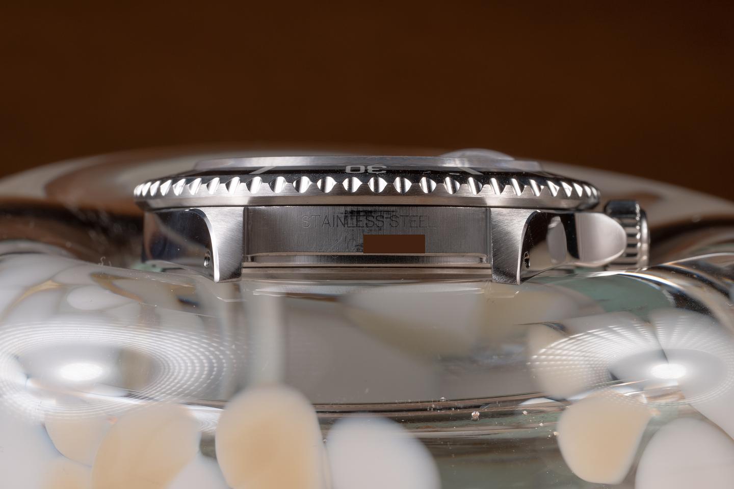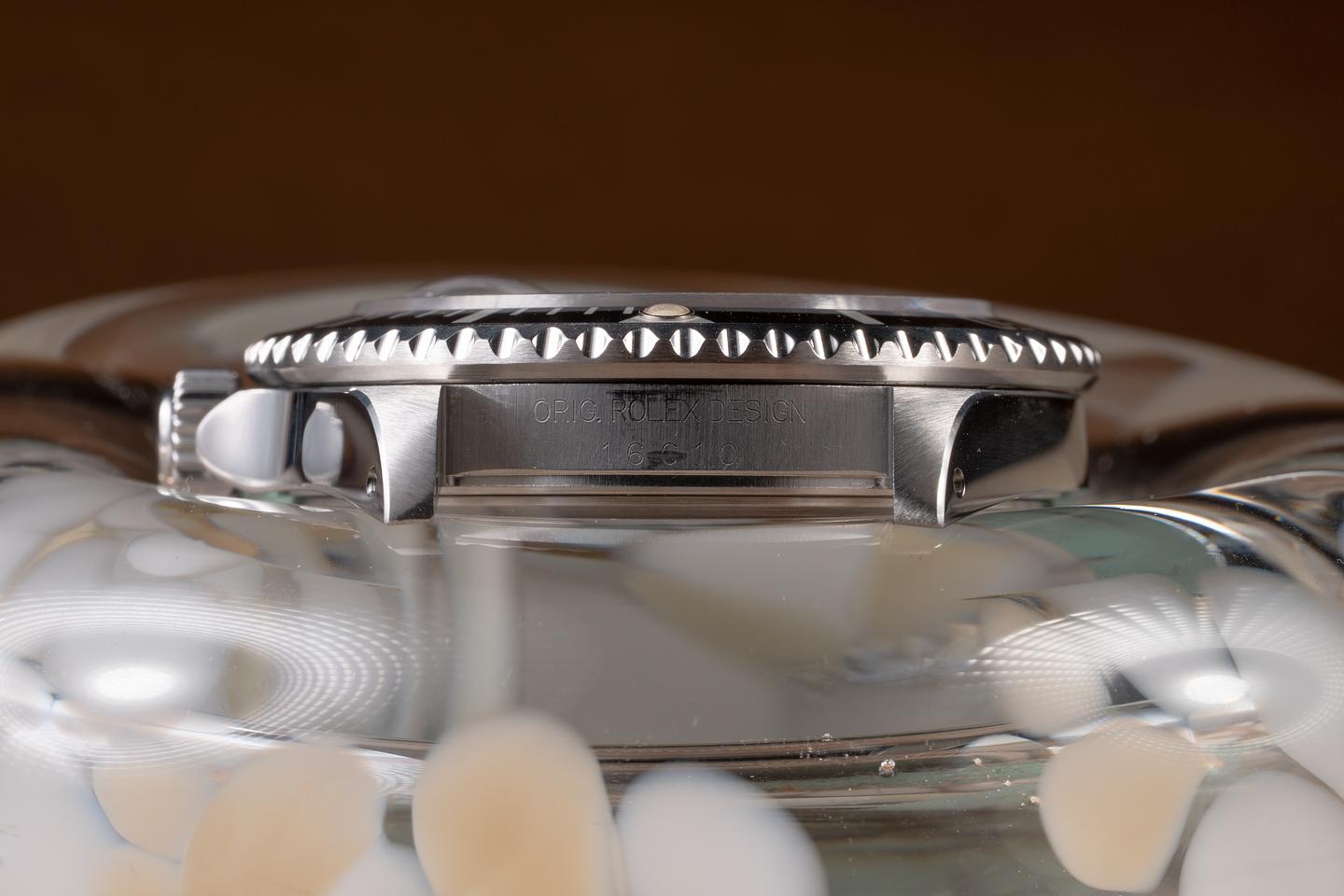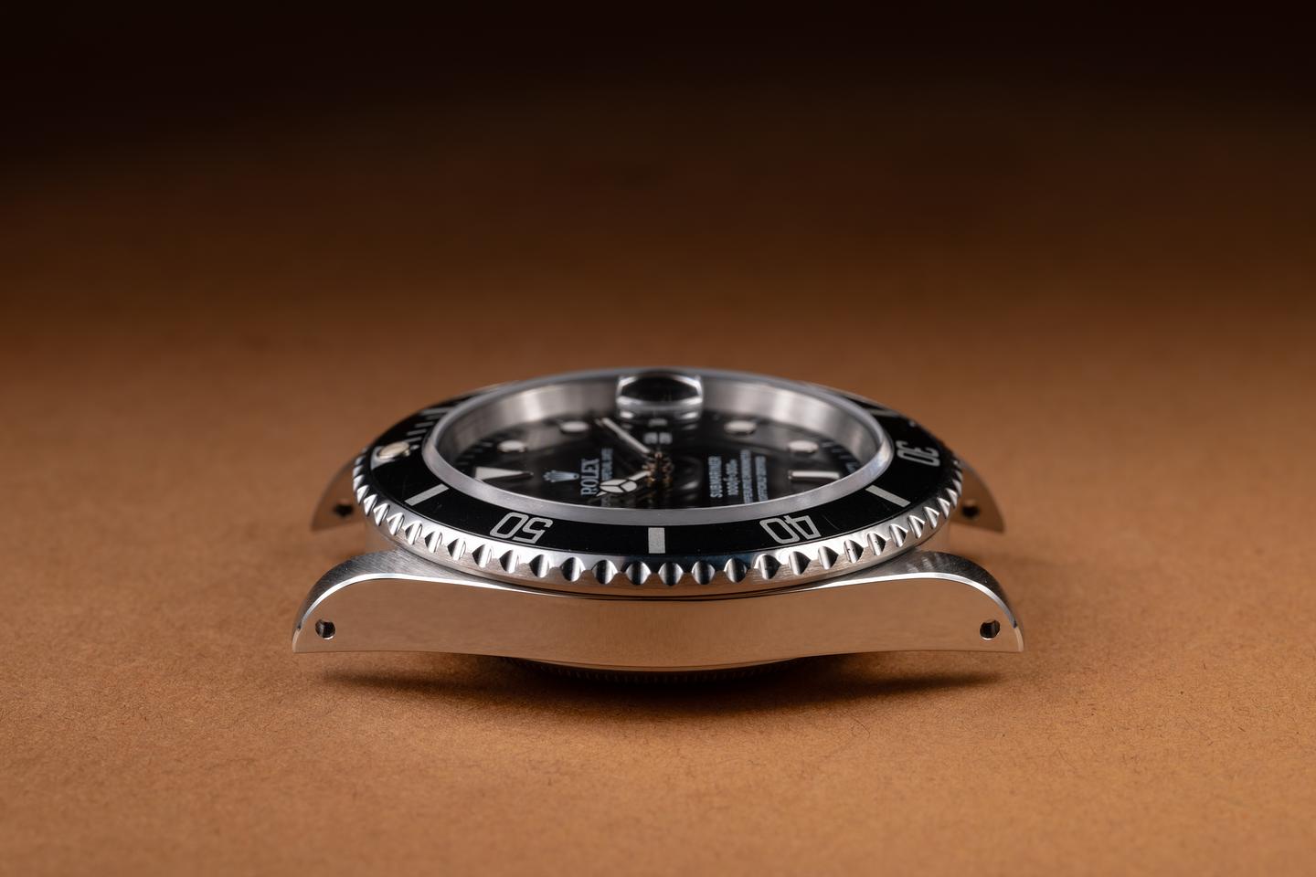 Case: The recently polished case is excellent, showing sharp, prominent bevels and only light wear from use. The black bezel insert is also in excellent condition, showing only light wear from use.