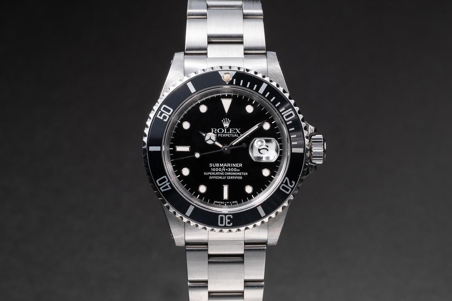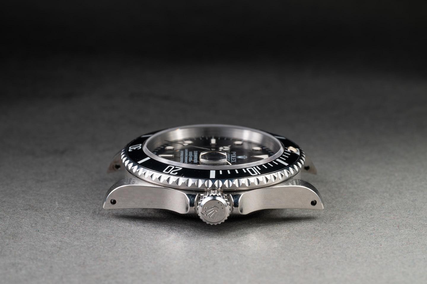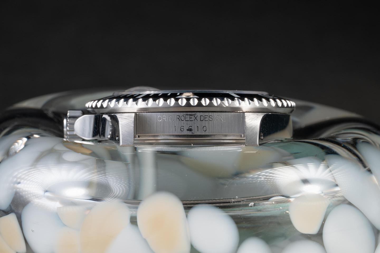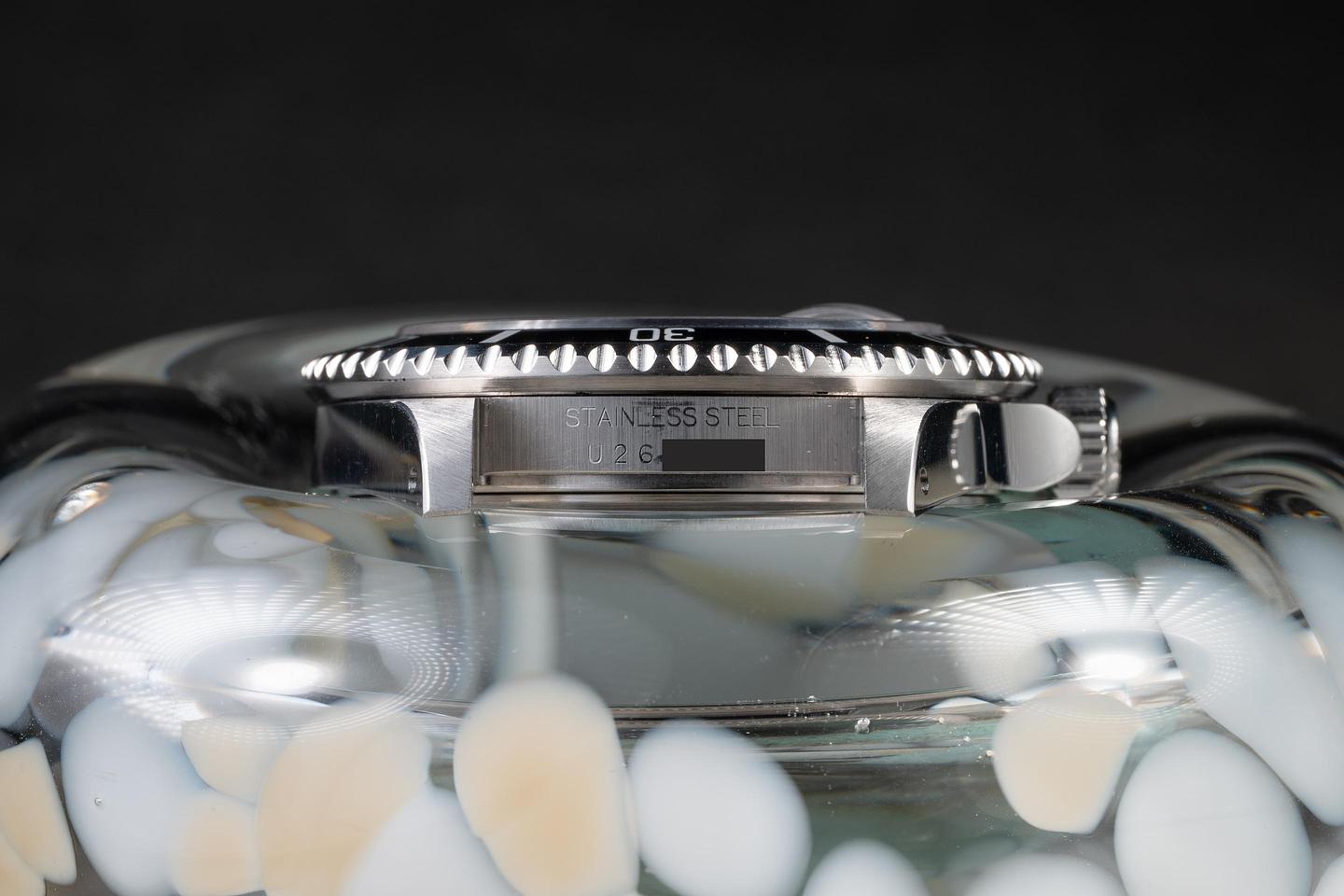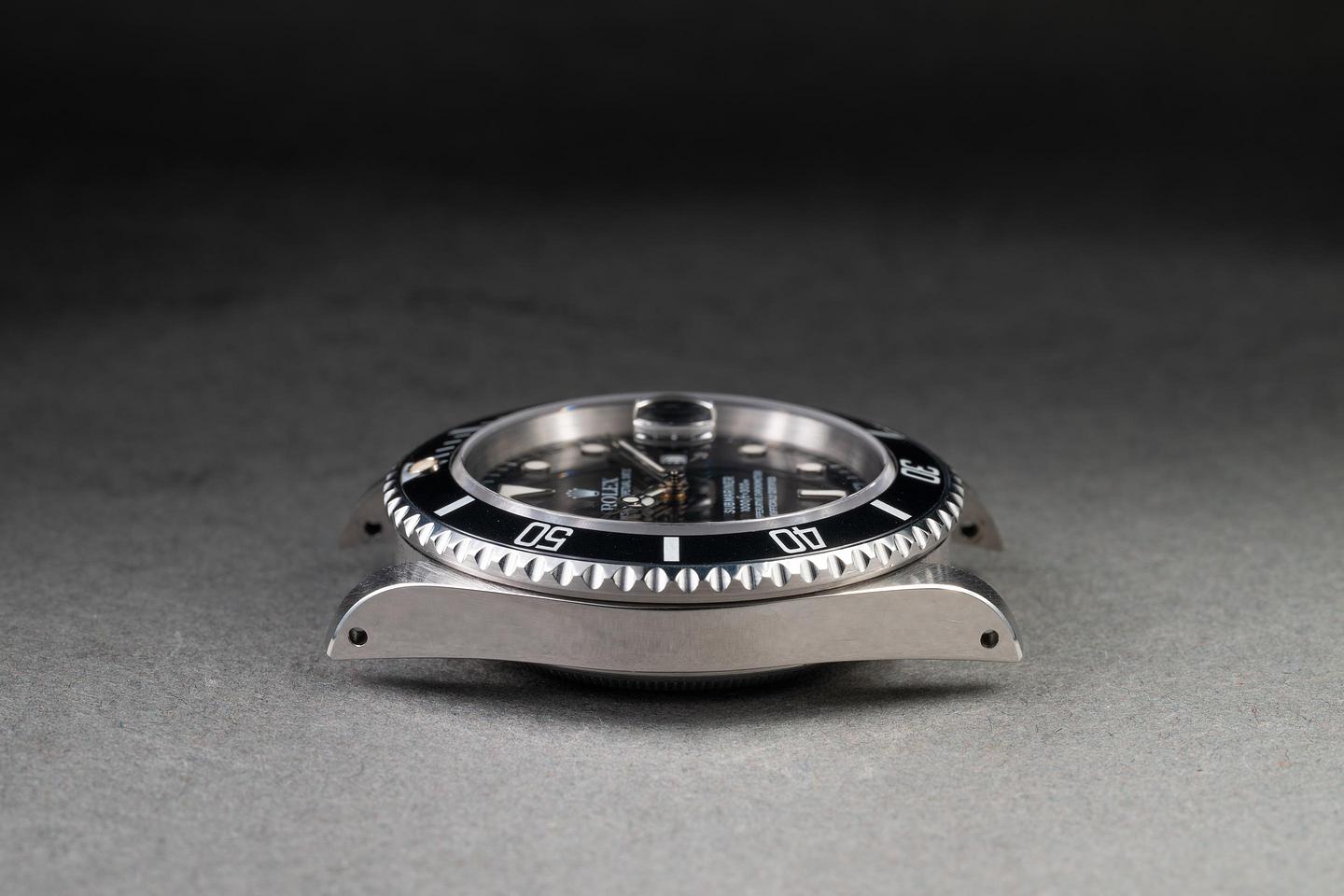Case: The previously polished case is excellent, showing sharp, prominent bevels and only light wear from use. The black bezel insert is also in excellent condition, showing only light wear from use.