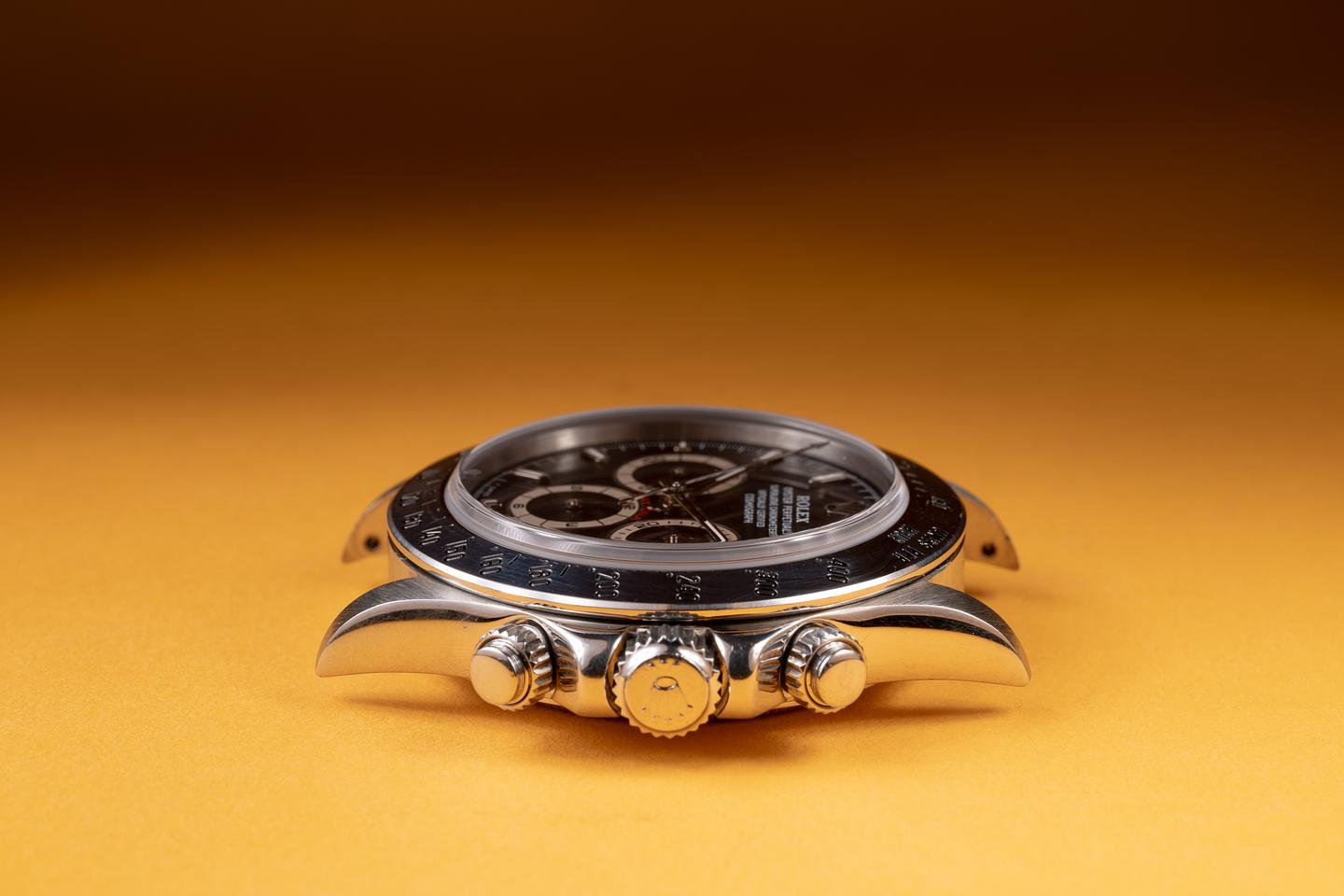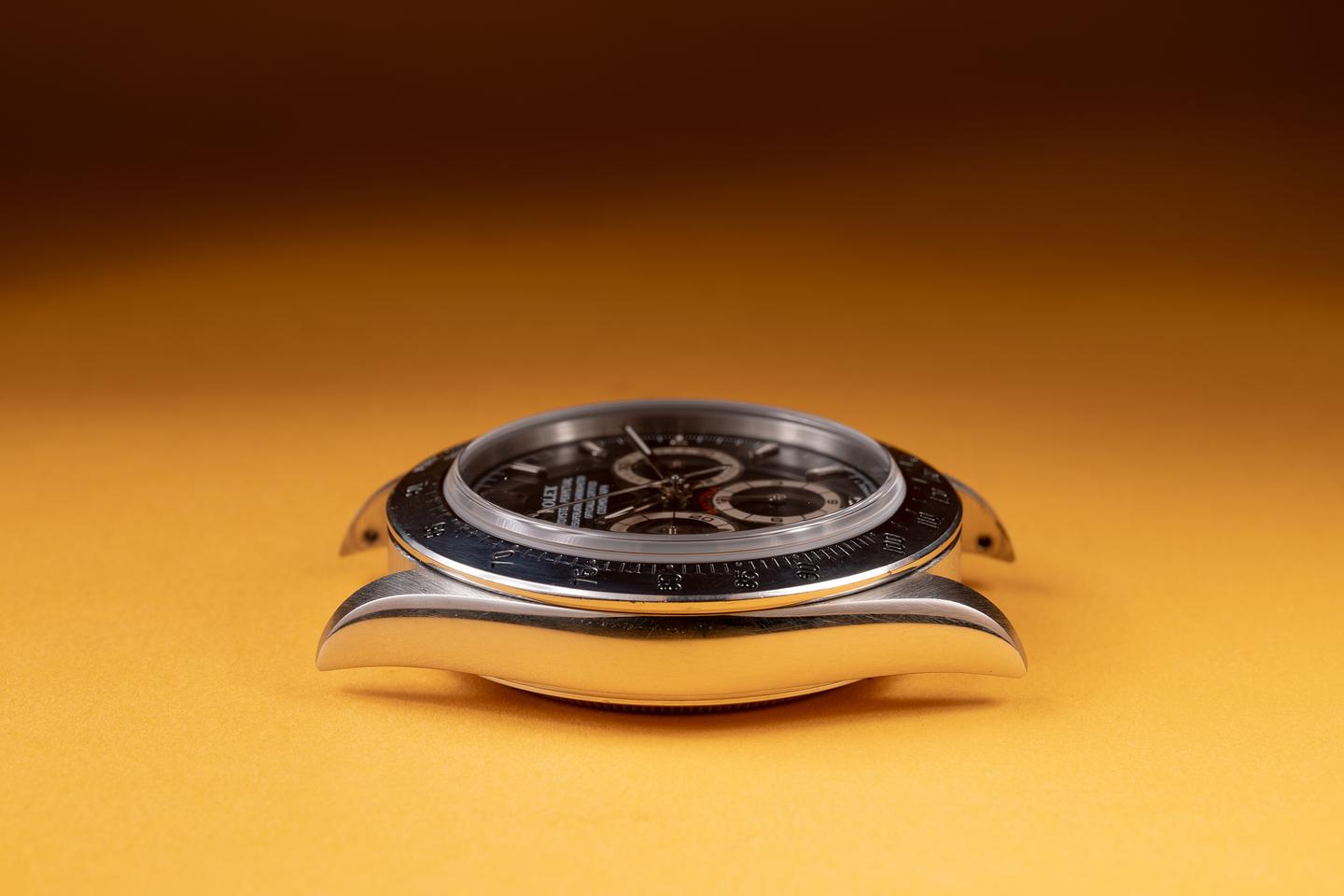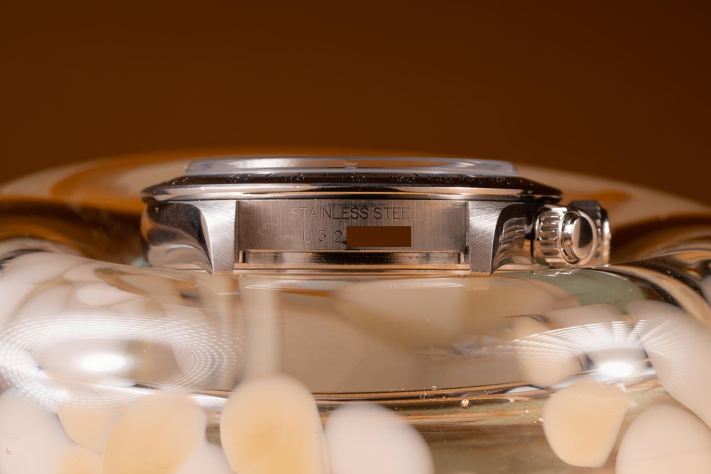 Case: The thick, sharp, and even case has recently been polished, showing only very light wear. The stainless bezel is also in excellent condition, showing only very light wear.