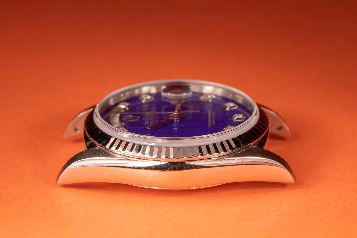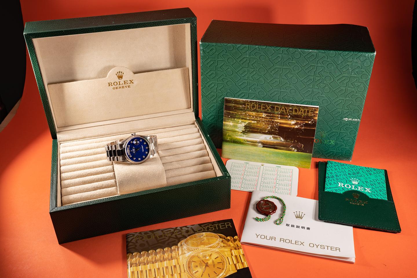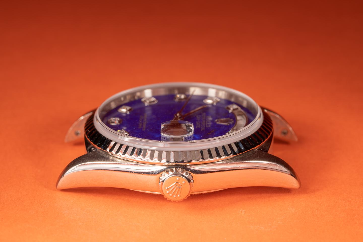 Dial: The deep blue lapis dial has a light natural speckling of gold pyrite with some bigger specks present just off the right of the x in "Rolex". The diamond markers are bright clear and clean and the factory no lume hands are matching. The Day and Date are printed in Chinese characters.