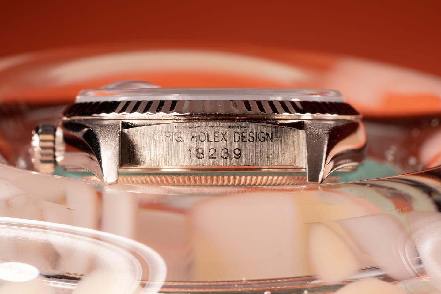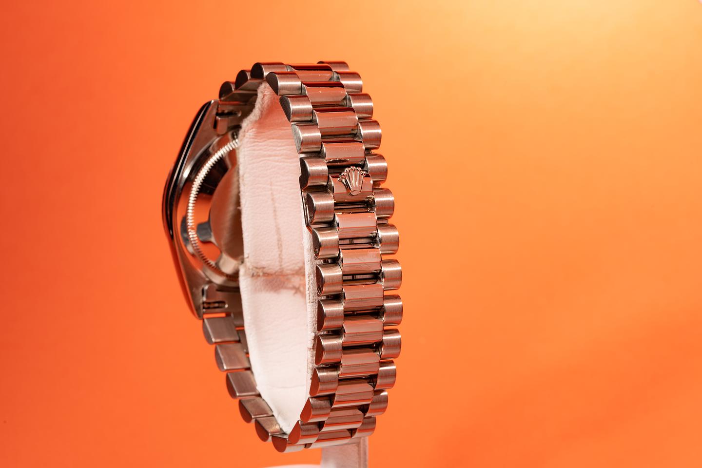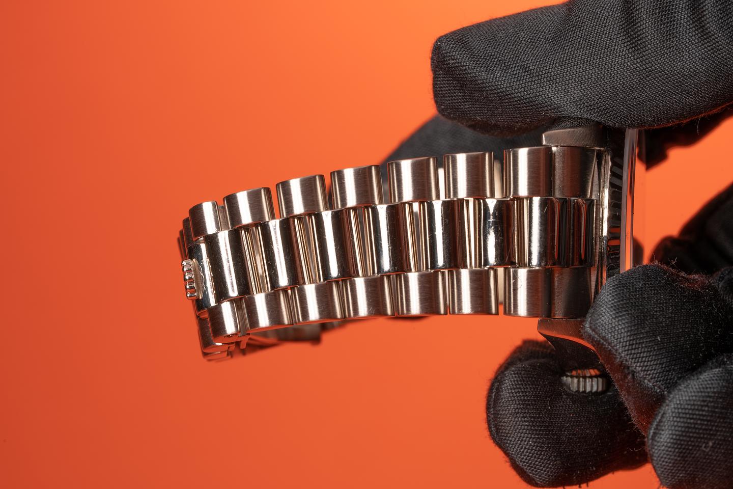 Bracelet: The 21 link 18k white gold president bracelet is excellent showing average stretch for its age. The clasp is stamped with a matching 1998 date code.
