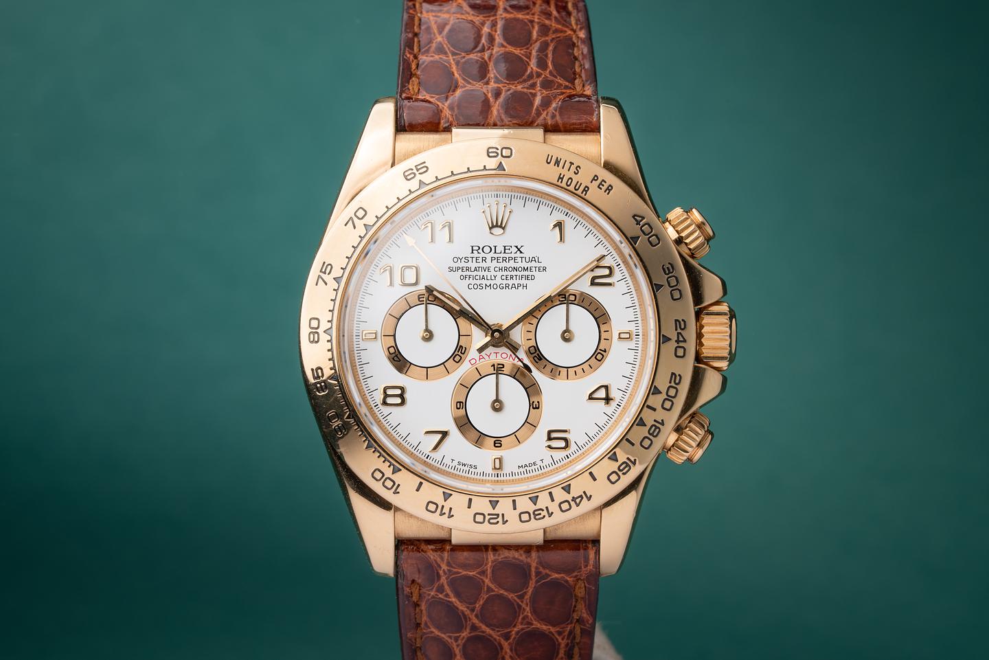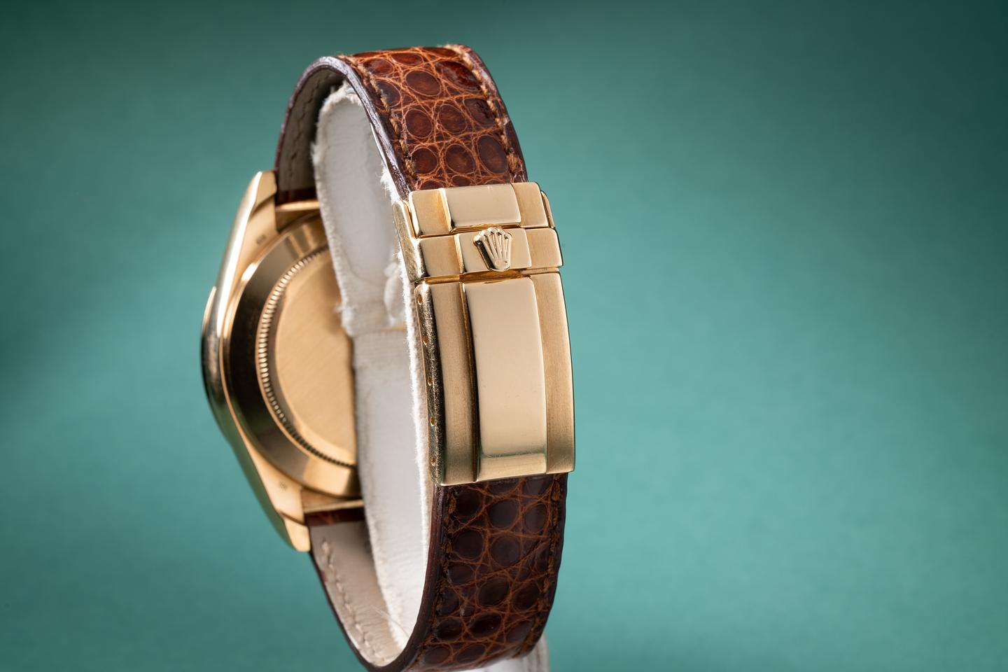 Bracelet: The Rolex brown crocodile leather strap is very good showing some wear for its age. The 18k yellow gold clasp is excellent showing only light wear for its age.