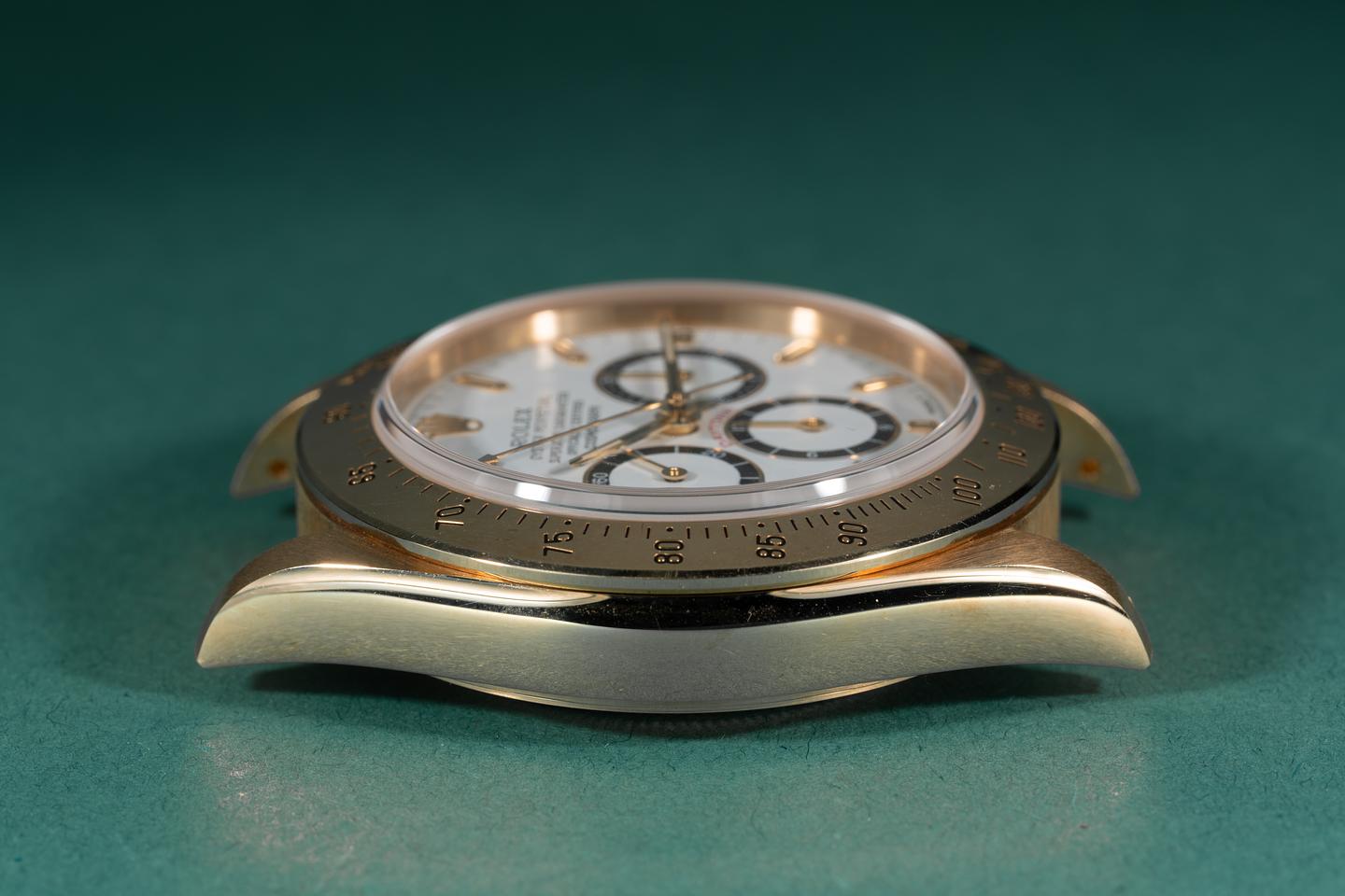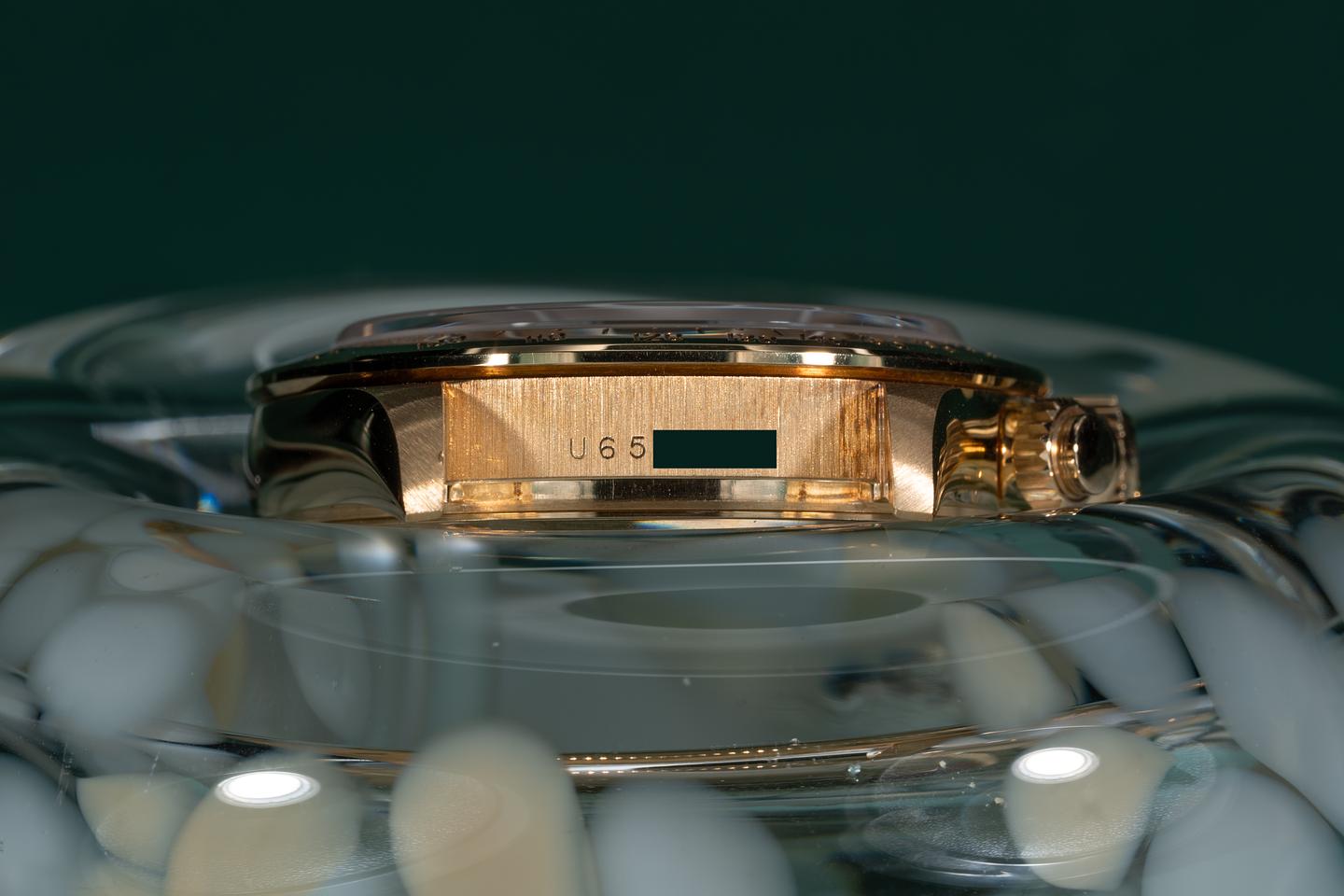 Case: The thick sharp 18k yellow gold case is excellent showing only very light wear from use. The 18k yellow gold bezel is also in excellent condition showing only very light wear from use.