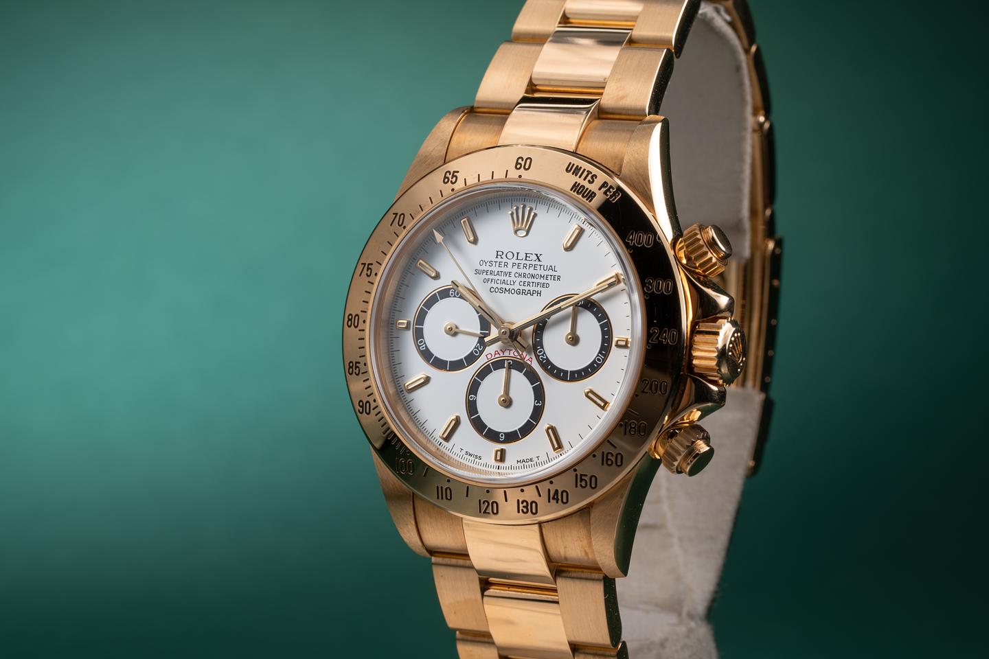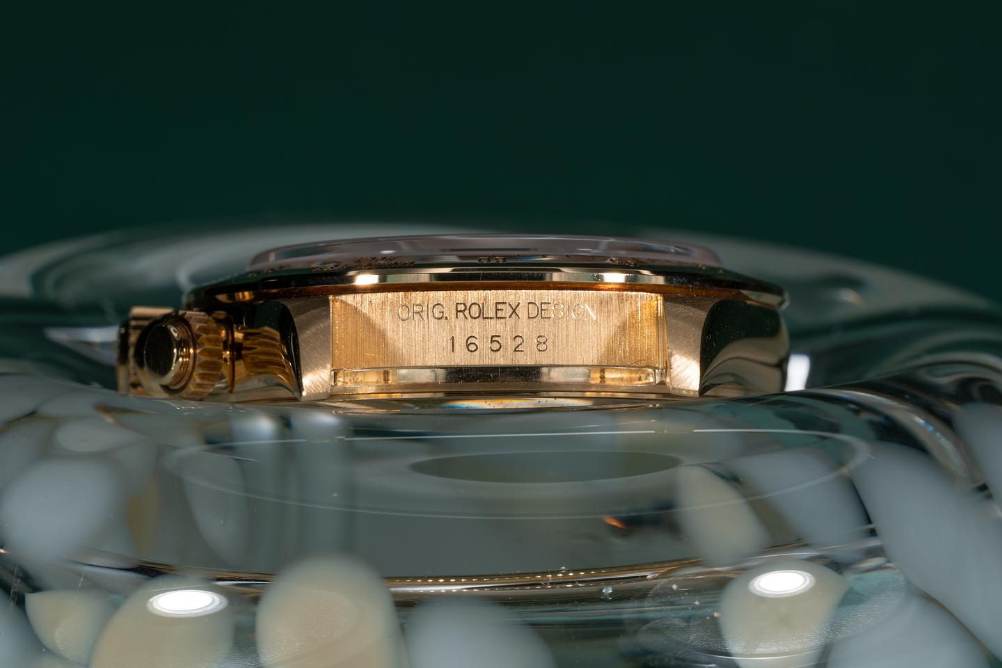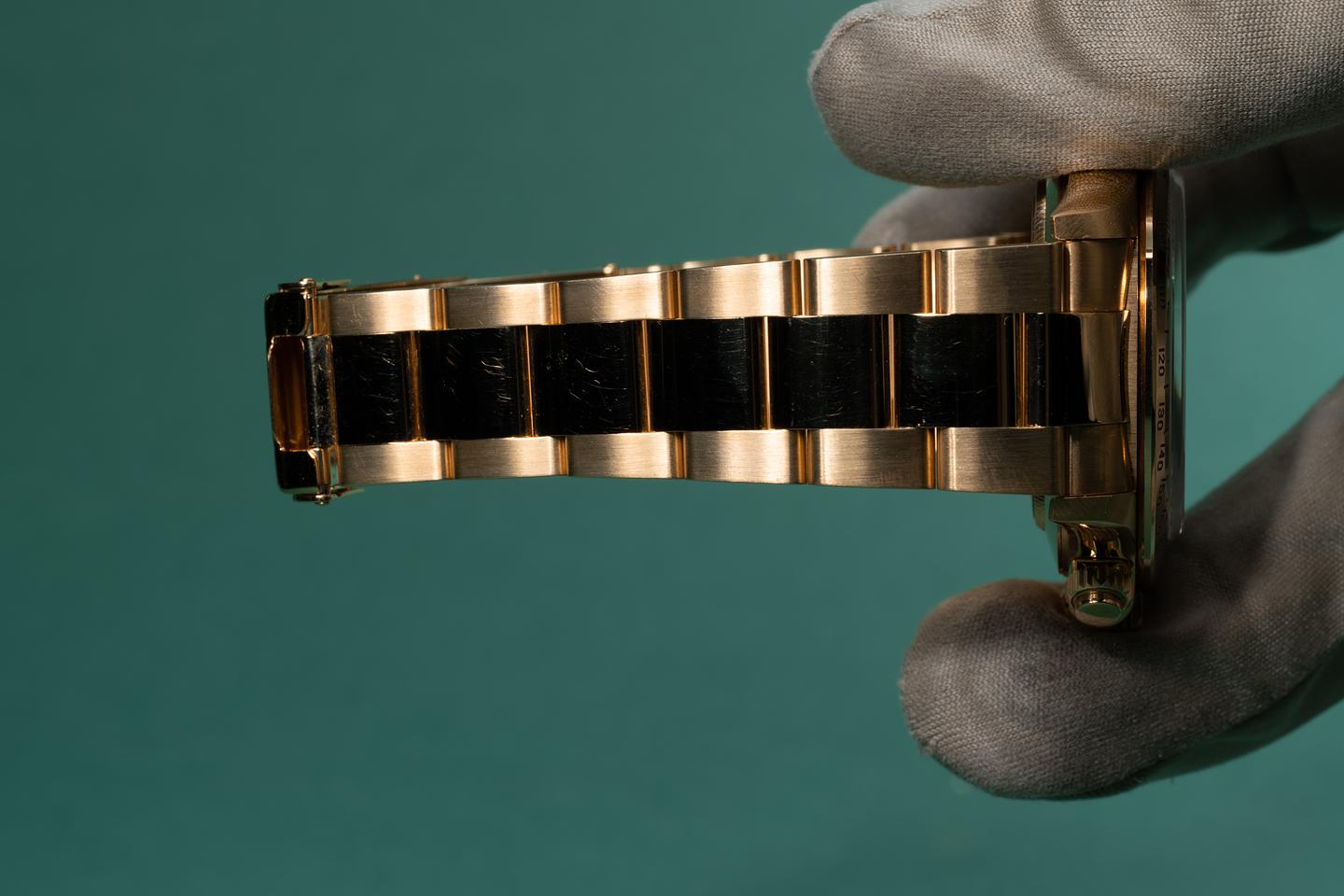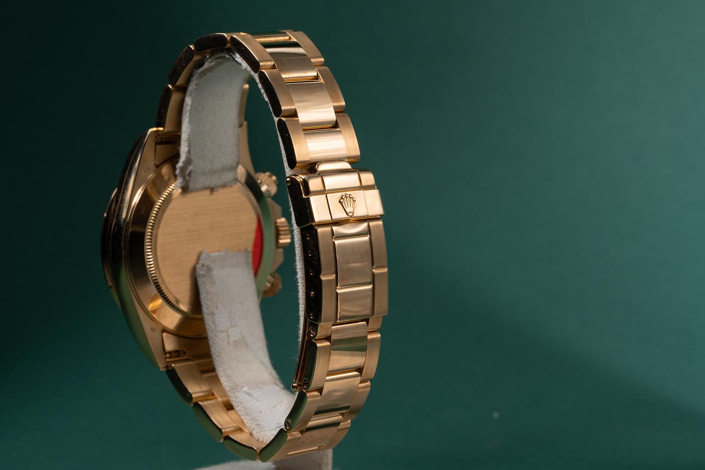 Bracelet: The 13 link 18K yellow gold Oyster bracelet is excellent showing extremely light stretch for its age. The clasp is stamped with a matching 1998 date code.
