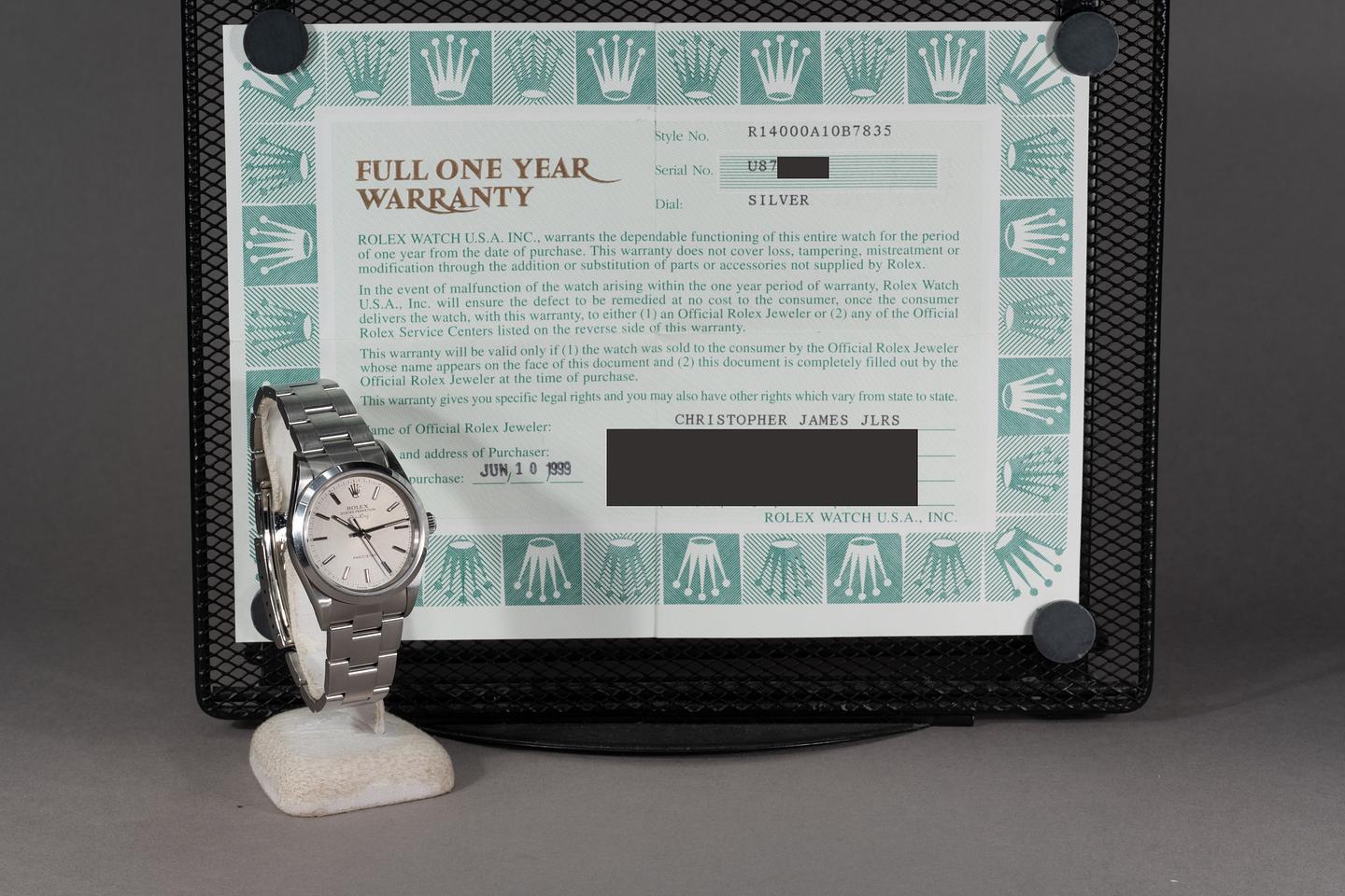 Bracelet: The 12 link Oyster bracelet is excellent showing only extremely light stretch for its age. The clasp is stamped with a 1999 date code.