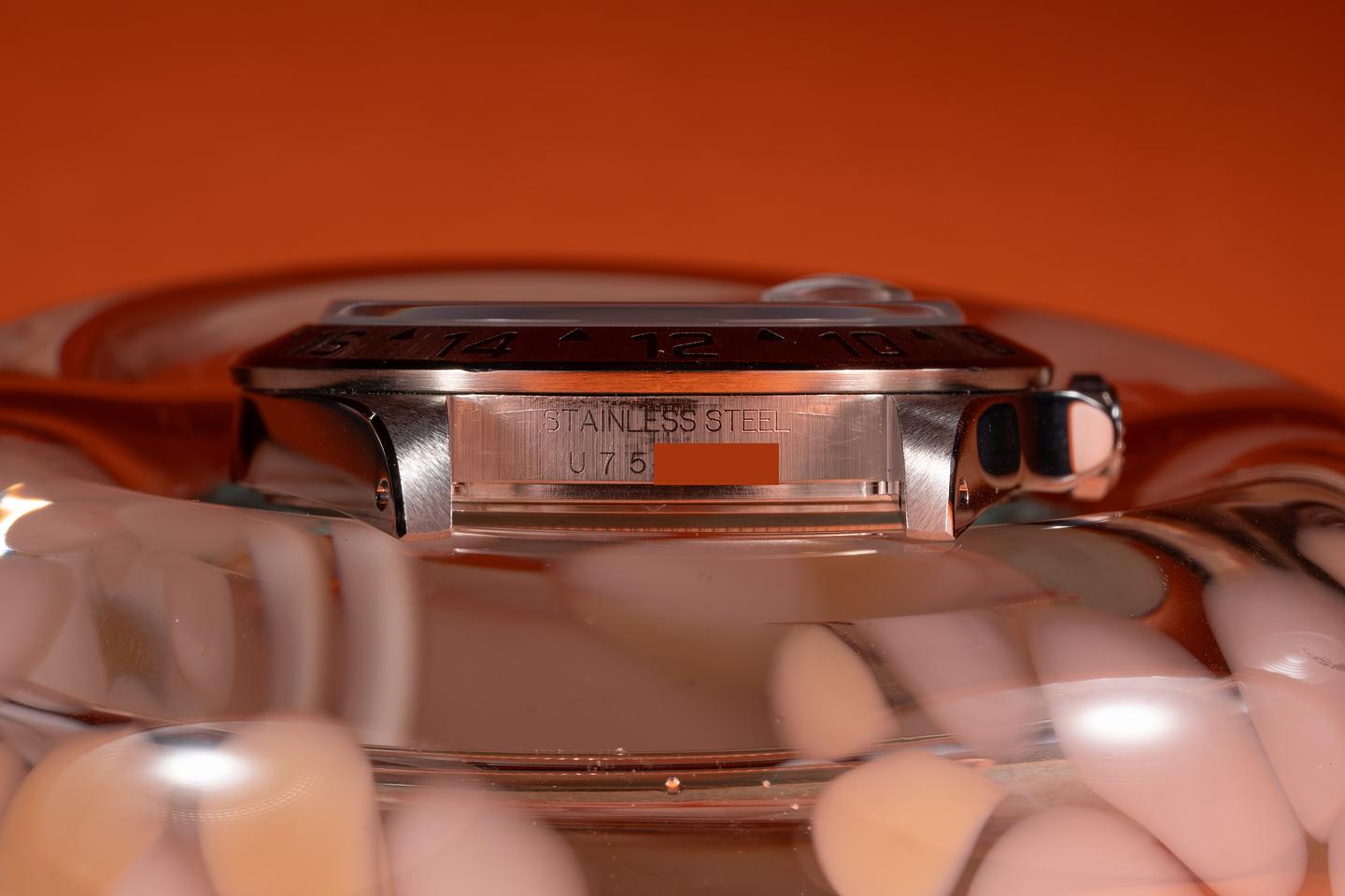 Case: The recently polished case is excellent showing sharp prominent bevels and only light wear from use. THe stainless bezel is also in excellent condition showing a sharp well defined sunburst finish and only very light wear from use.