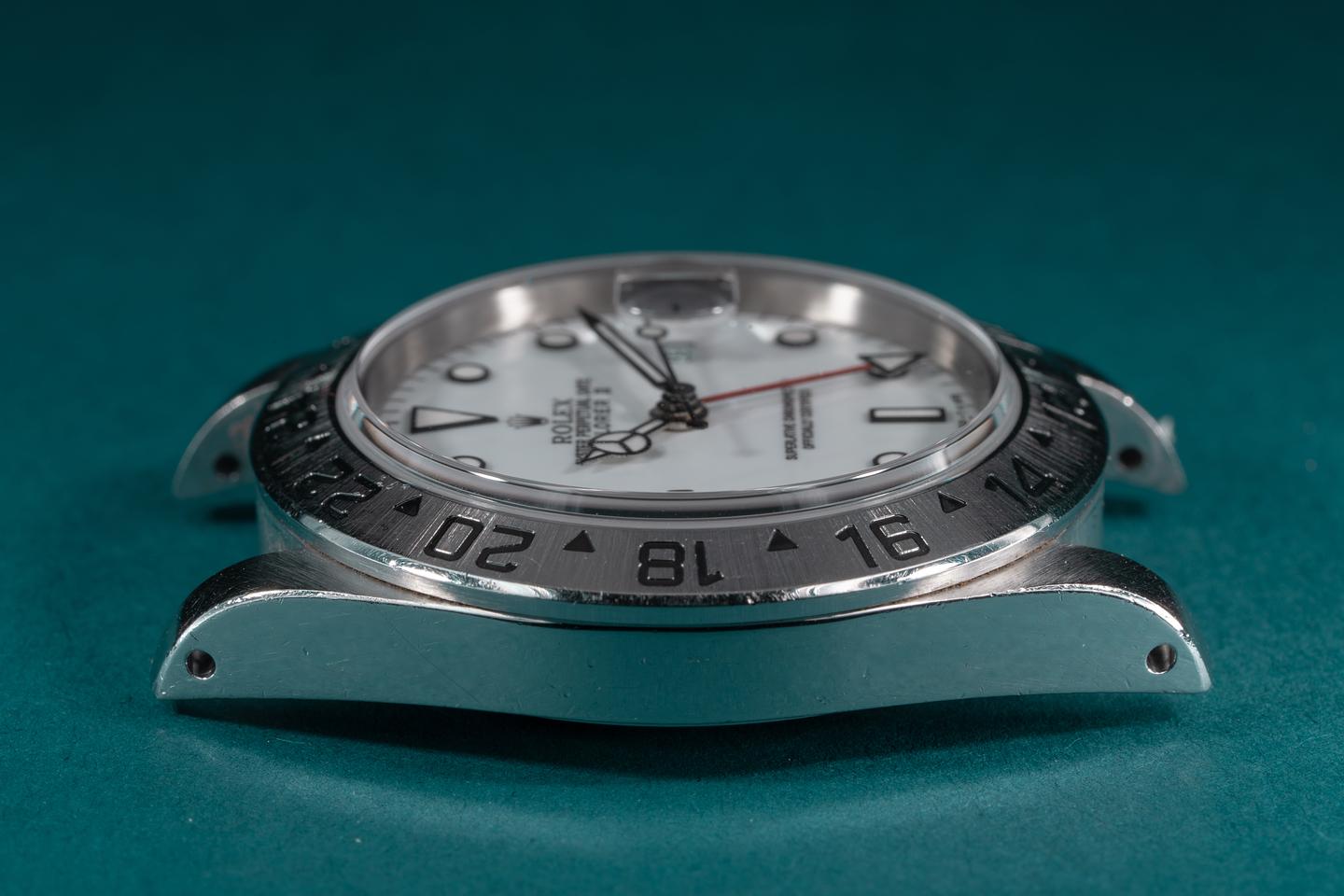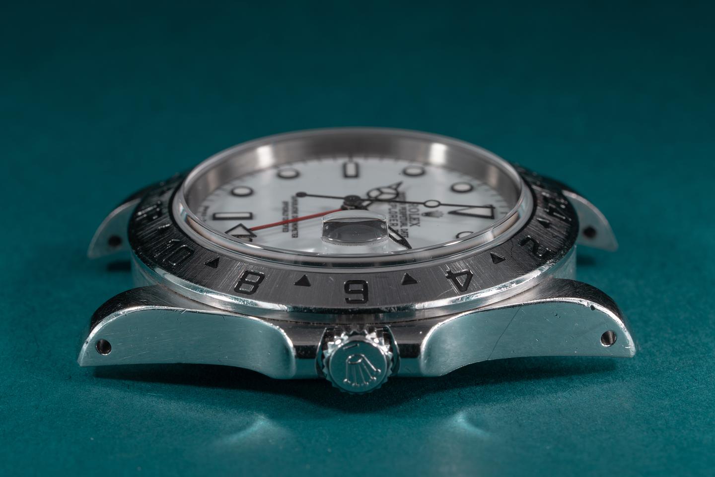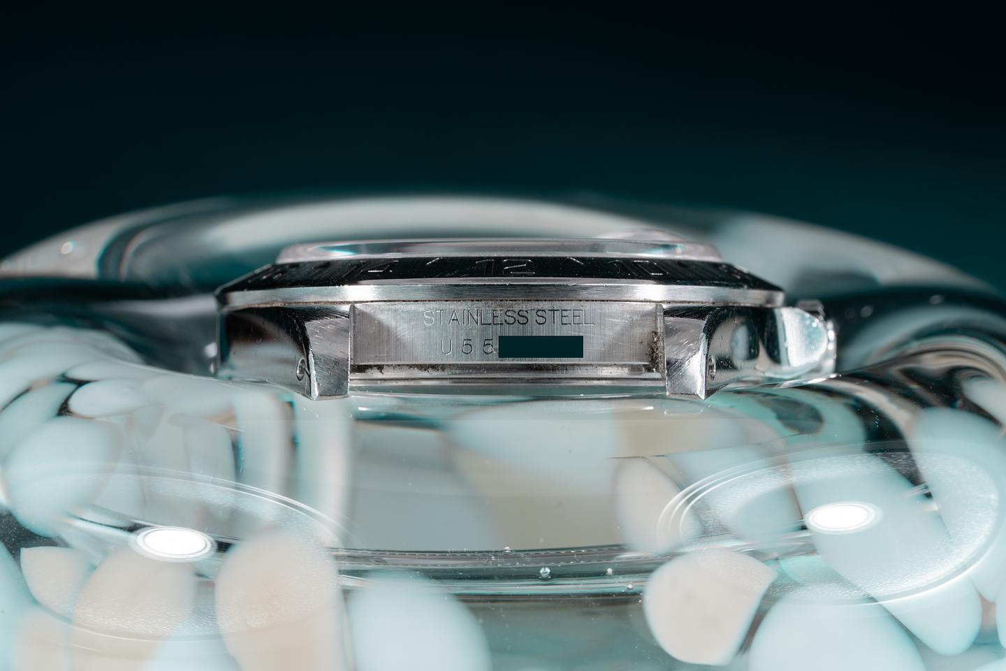Case: The thick and even case is excellent with intact factory bevels showing a semi-sleeve polished finish and some wear from use. The stainless bezel is also in excellent condition showing some light wear from use.