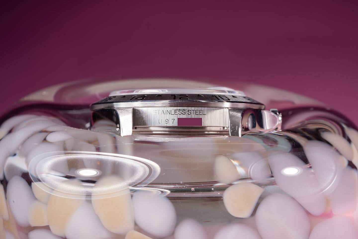 Case: The case appears to be unpolished showing sharp prominent factory bevels and overall light wear from use. The 5 o'clock lug has small ding near the very tip. The stainless bezel is also in excellent condition showing a sharp and well-defined sunburst finish. The original factory sticker is still in place on the caseback.