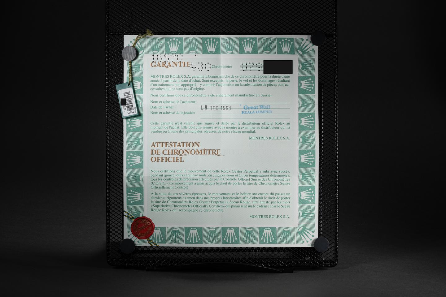 Bracelet: The 12 link Oyster bracelet is excellent showing light stretch. The clasp is stamped with a matching 1998 date code.