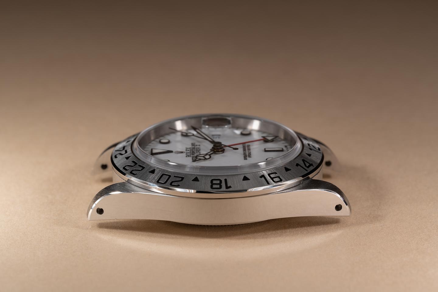 Case: The thick and even case has just returned from polishing showing sharp prominent bevels. The stainless bezel is also in excellent condition showing a sharp well defined sunburst finish.