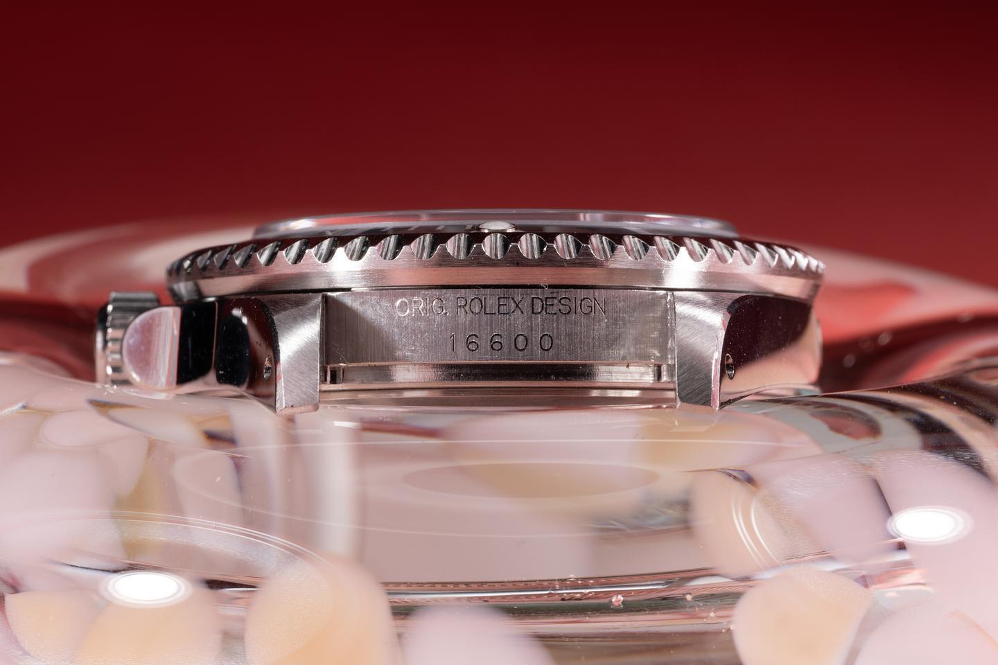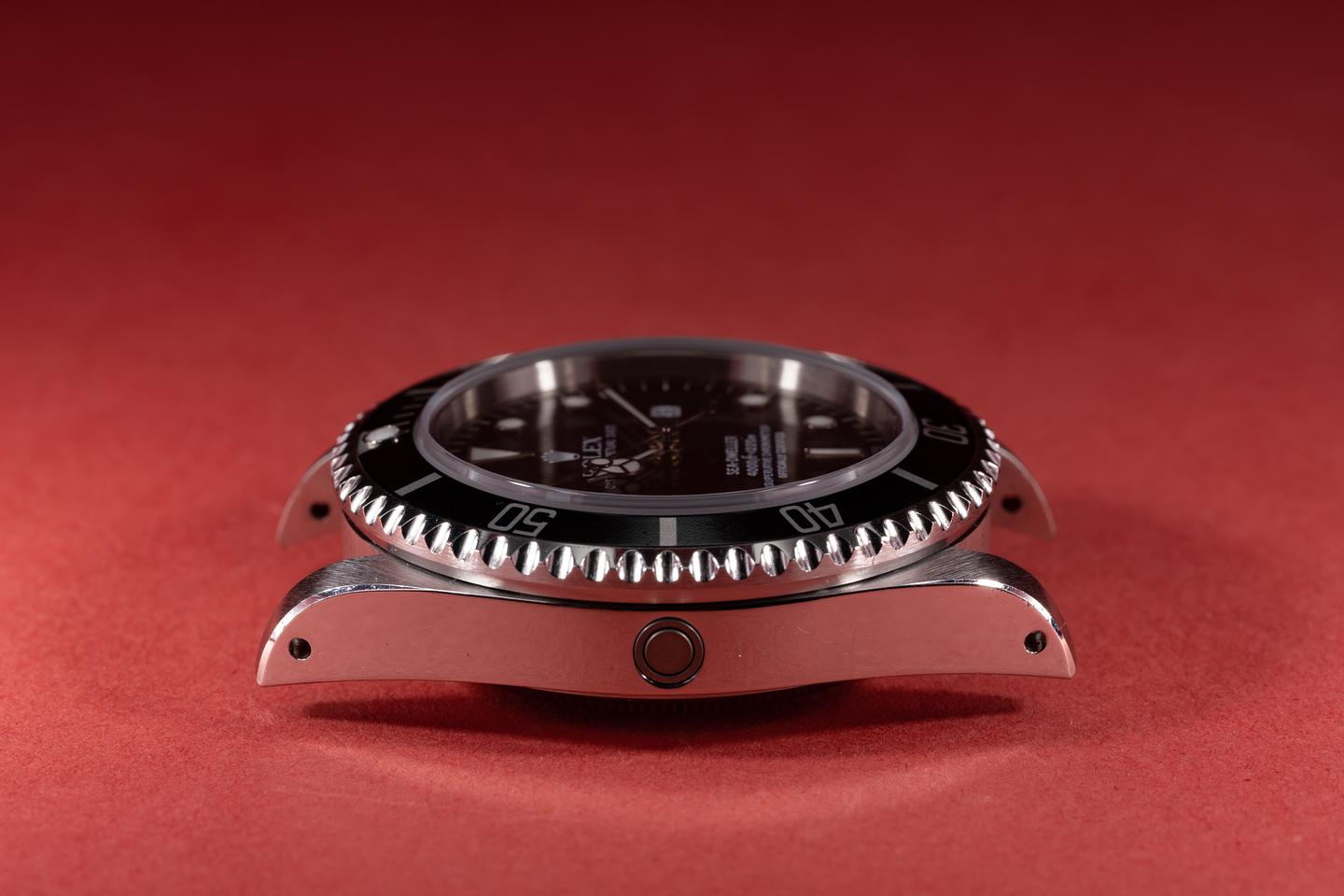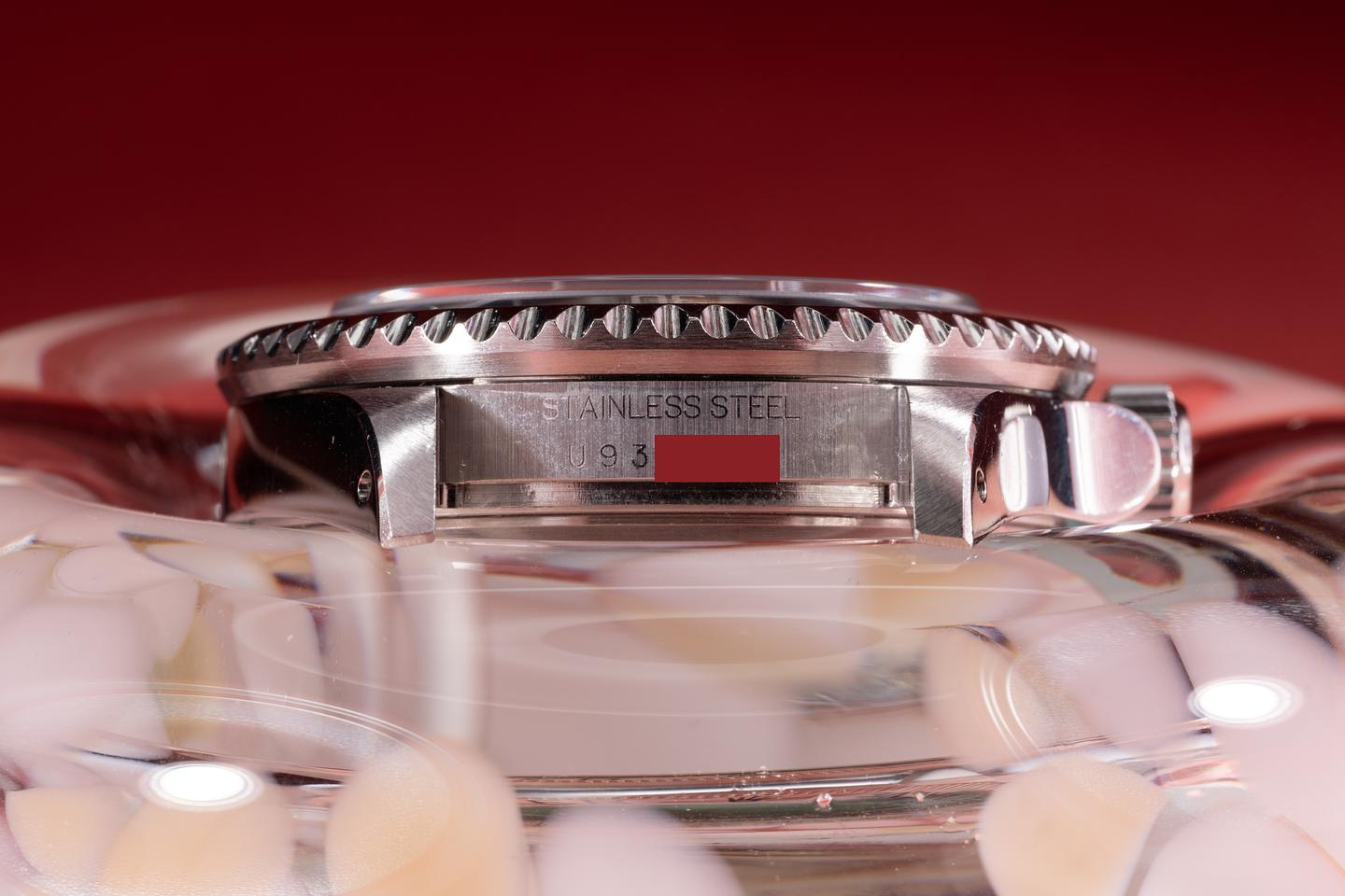 Case: The thick and even case appears to be unpolished showing sharp prominent factory bevels and only light wear from use. The black bezel insert is also in excellent condition showing only very light wer from use.