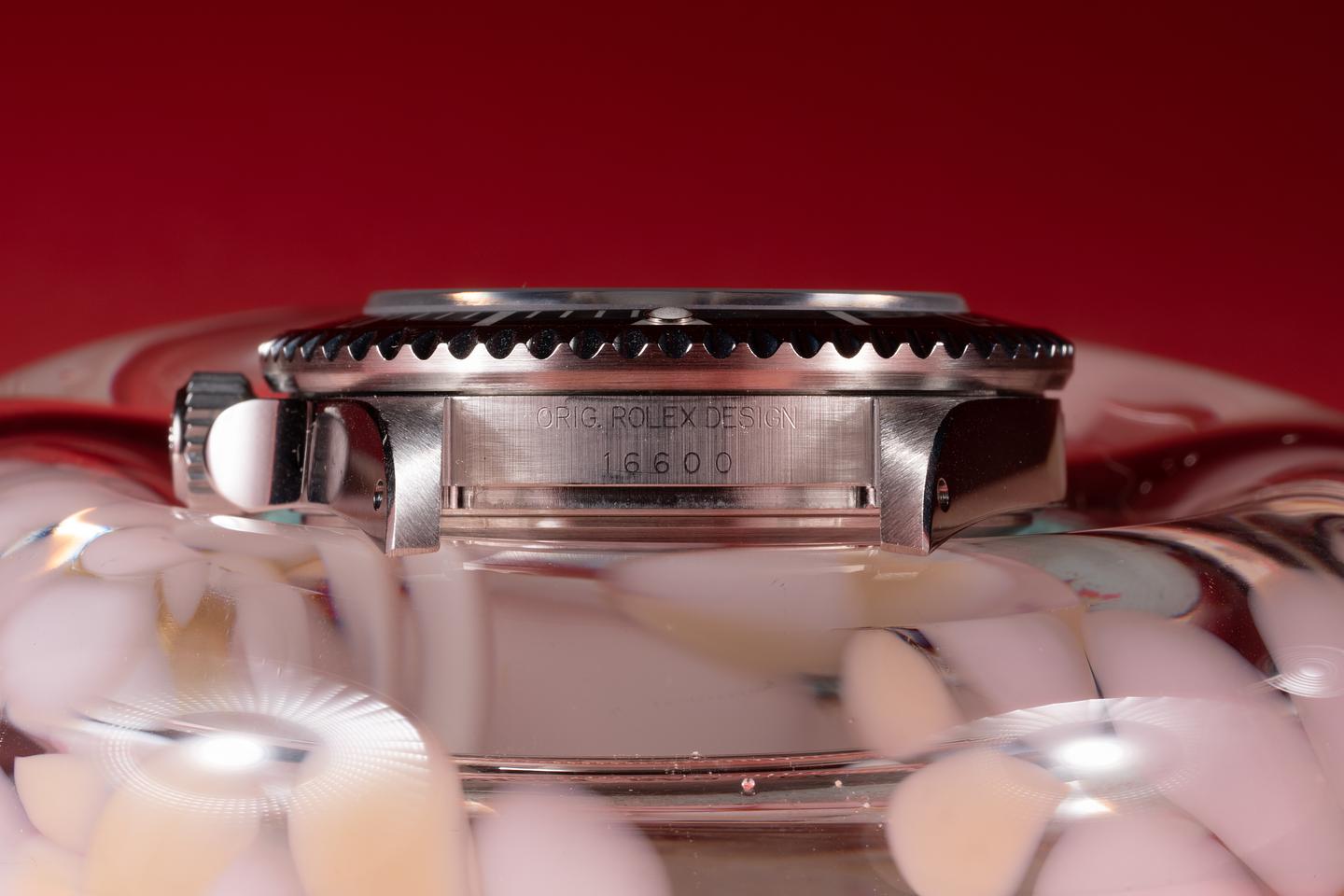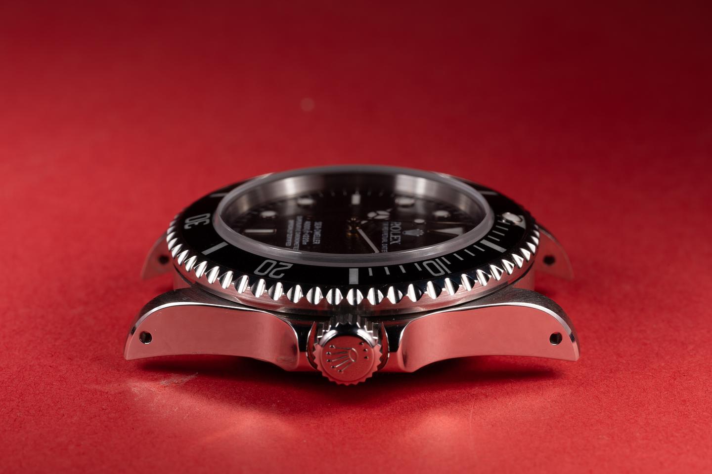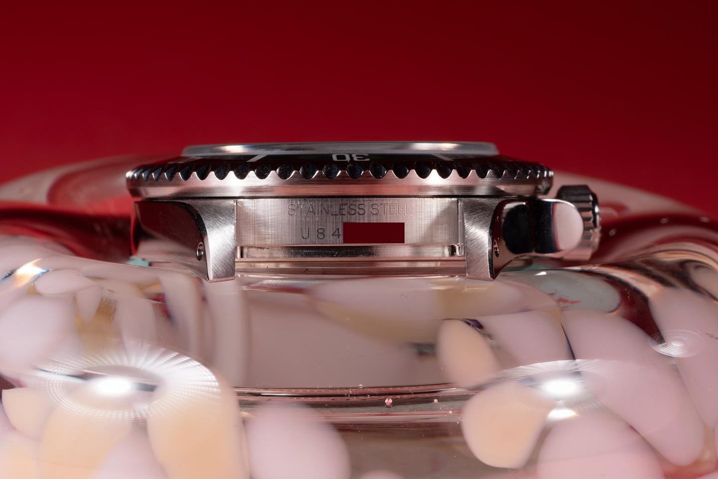 Case: The recently polished case is excellent showing sharp prominent bevels. The black bezel insert is also in excellent condition showing only light wear from use.
