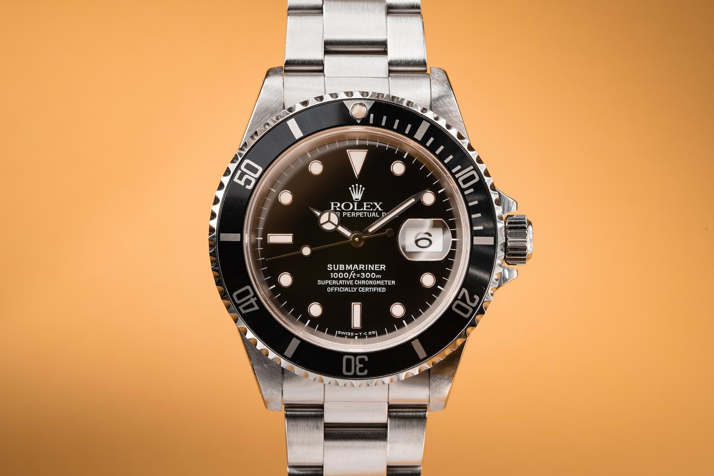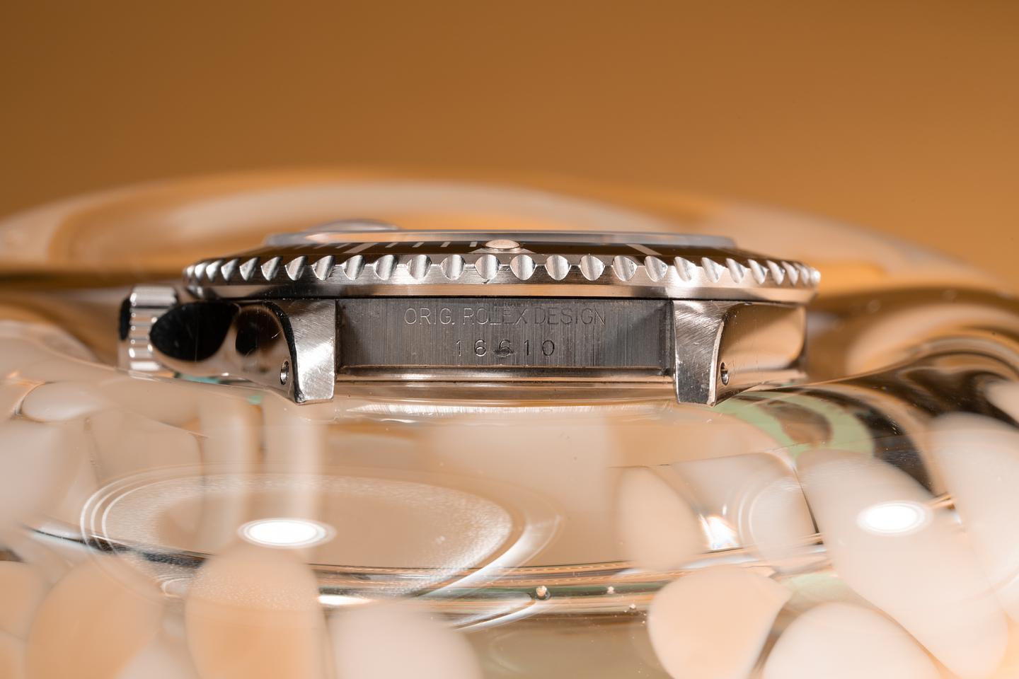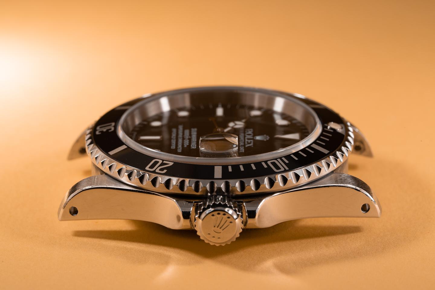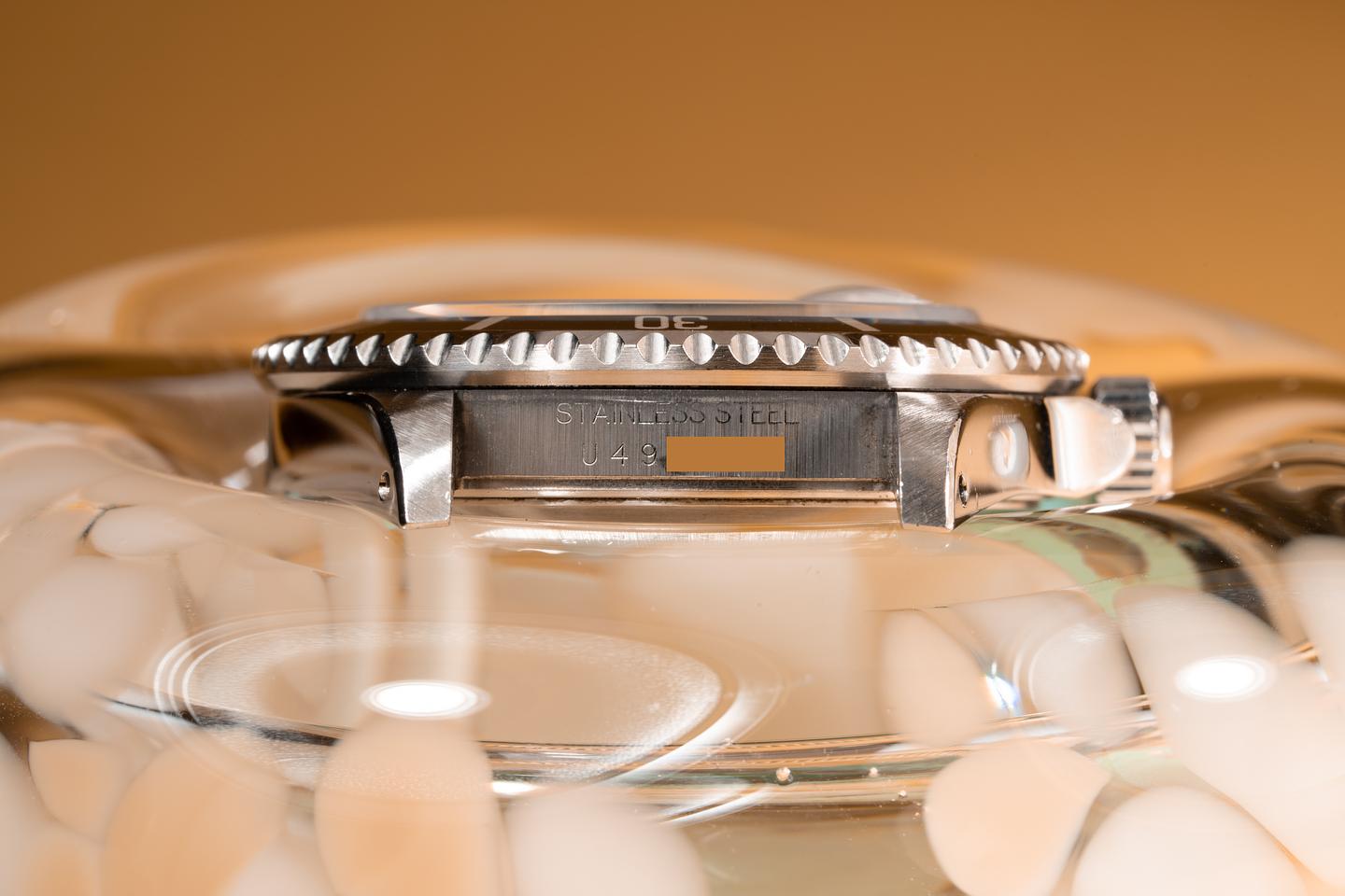 Case: The thick and even case appears to have been lightly polished in the past and still shows sharp prominent bevels. The black bezel is also in excellent condition and shows only light wear from use.