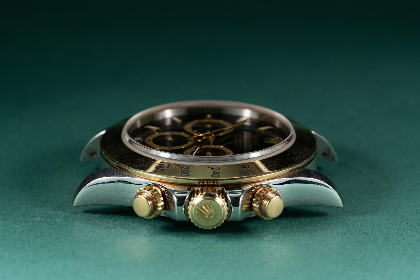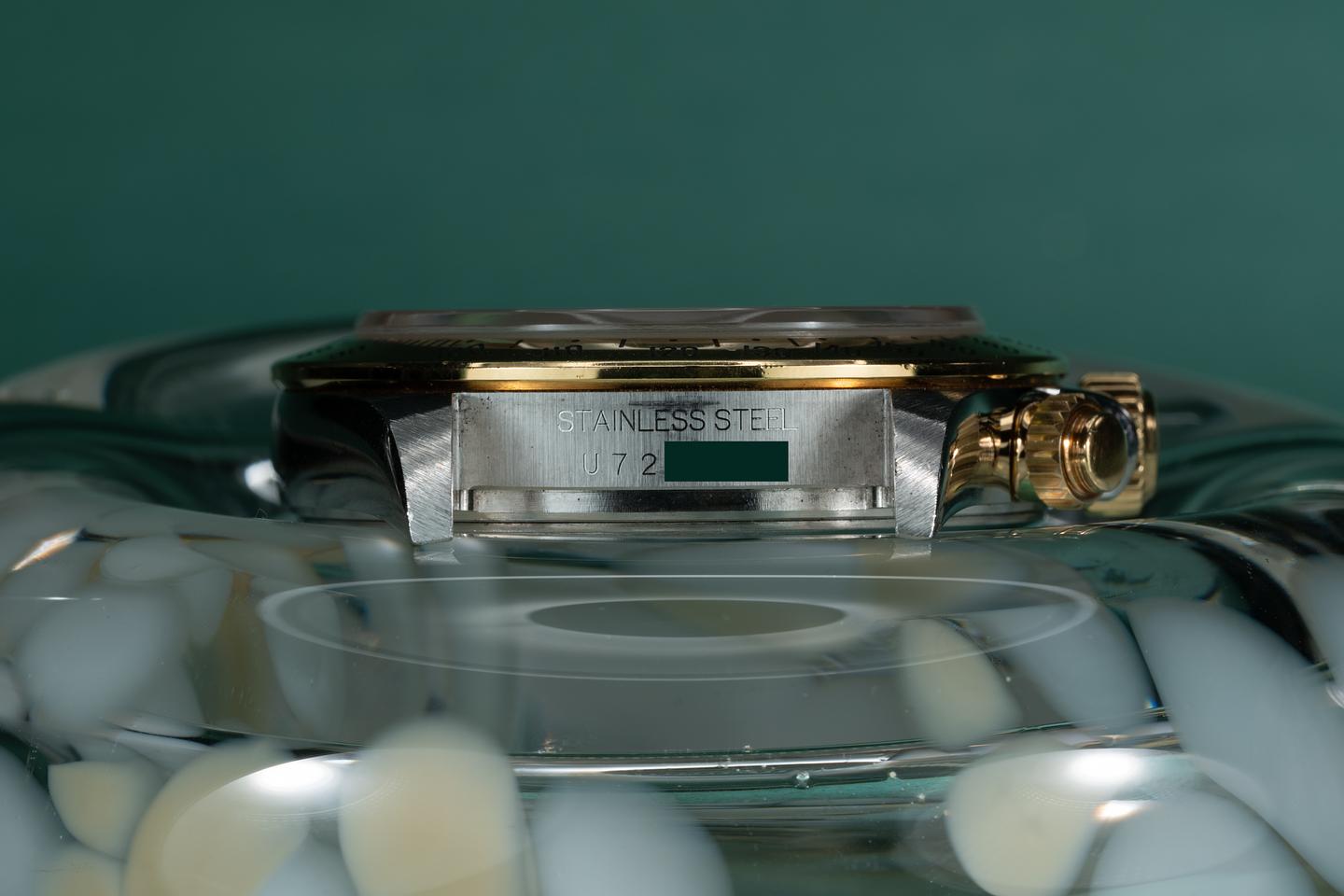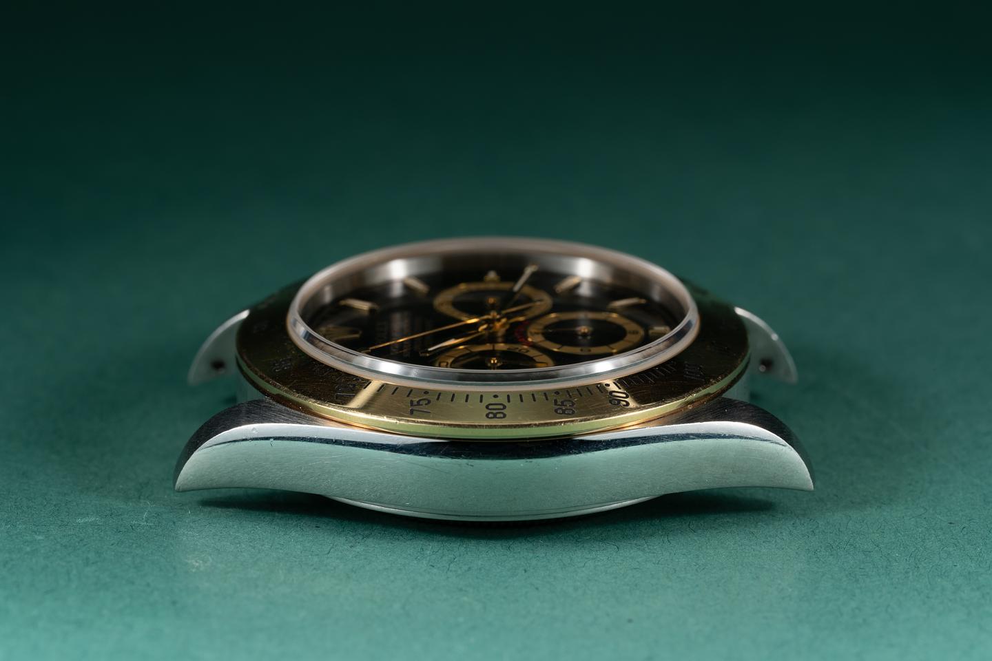 Case: The thick sharp case appears to be unpolished showing only light wear from use. The 18k yellow gold bezel is also in excellent condition showing only light wear from use.