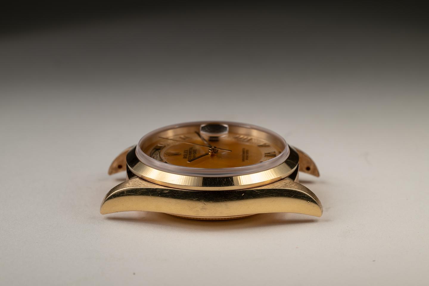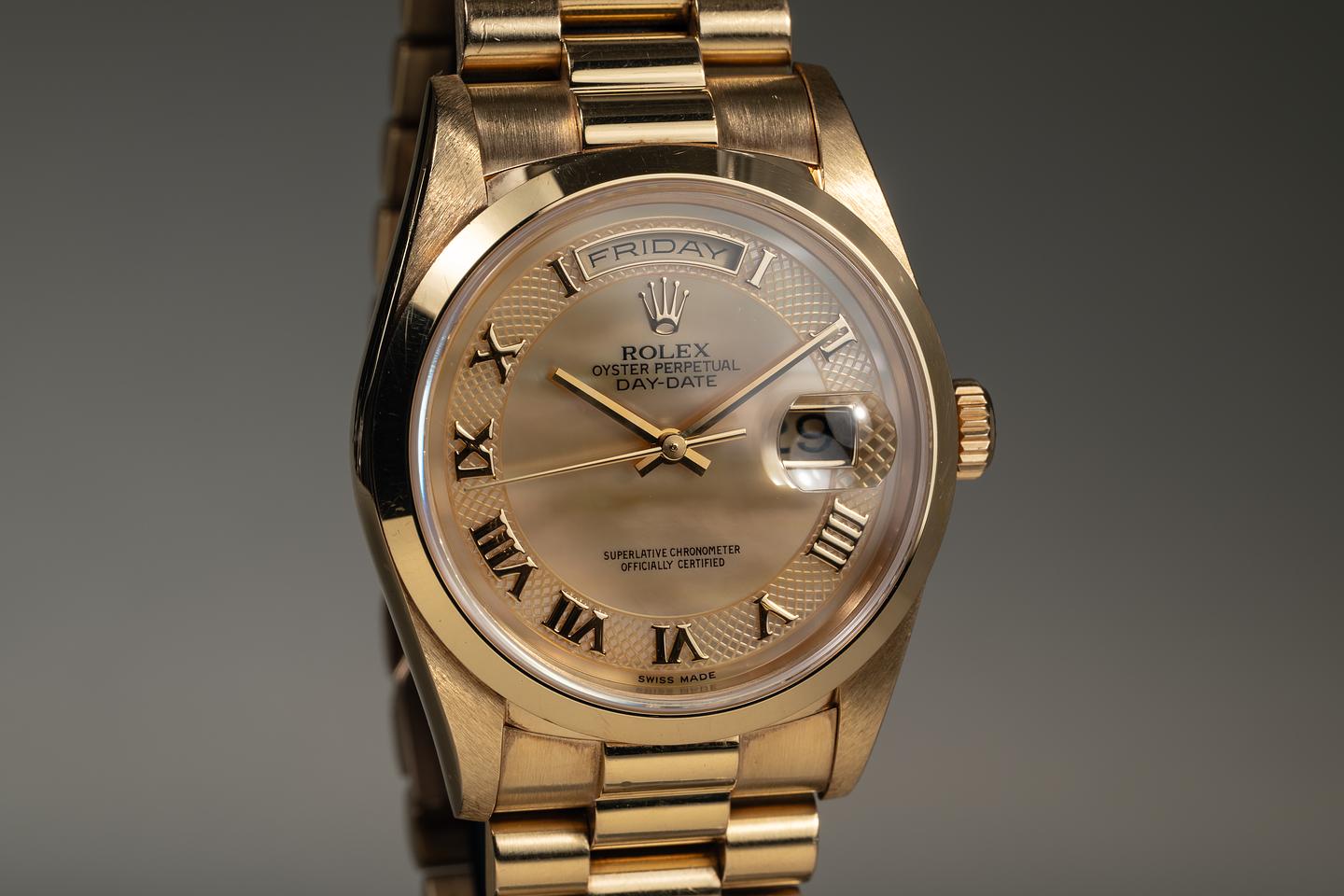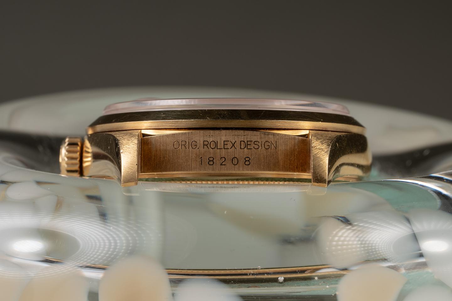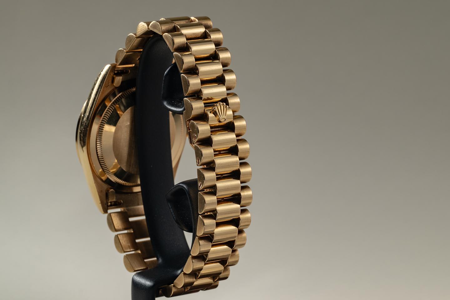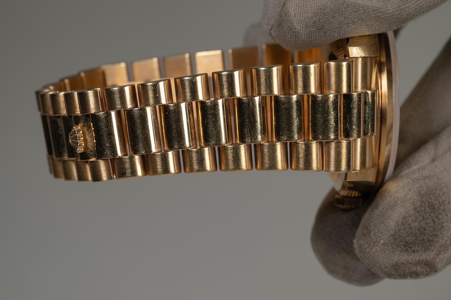 Bracelet: The 22-link 18K yellow gold president bracelet is excellent, showing only very light stretch for its age.