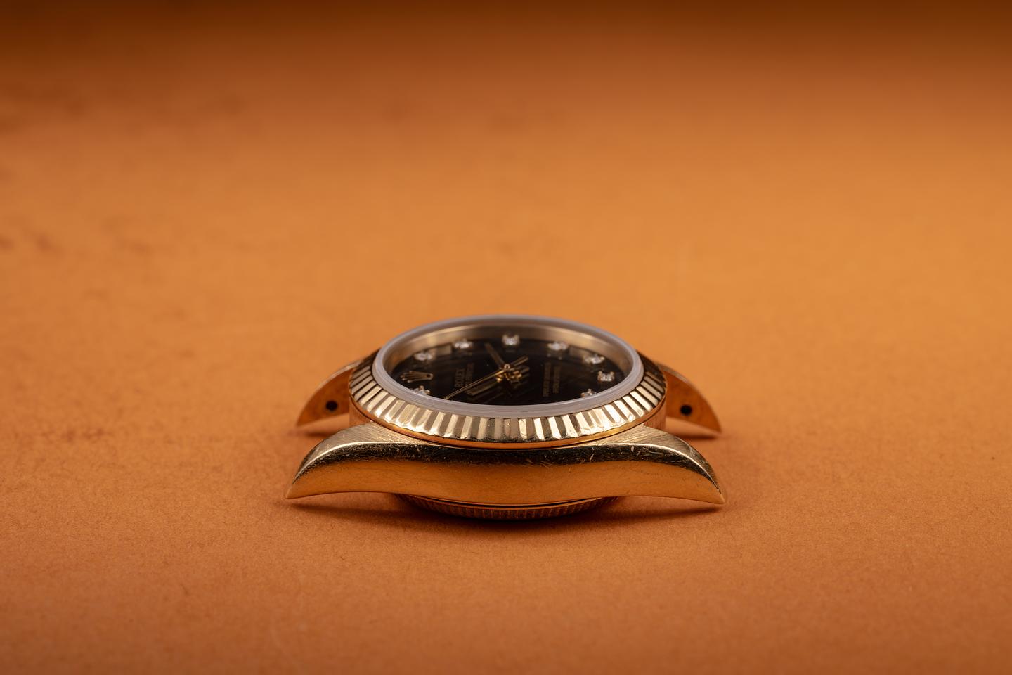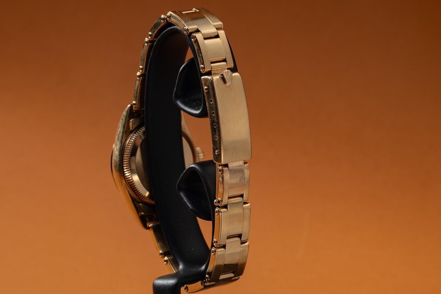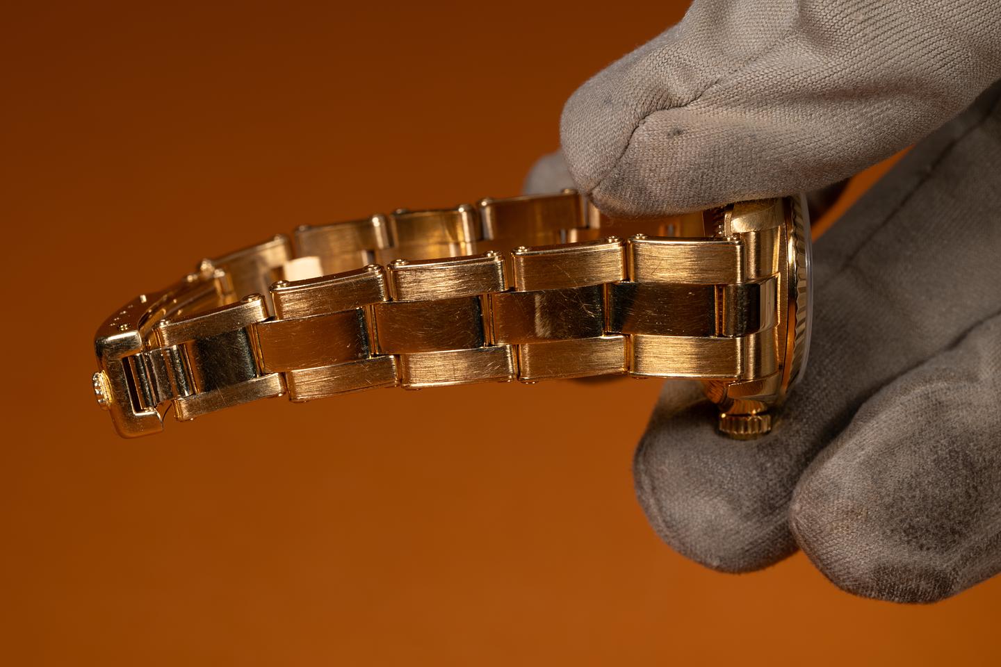 Case: The sharp, 26mm 18K yellow gold case is excellent, showing only light wear from use. The 18k yellow gold fluted bezel is also in excellent condition, showing only light wear from use.