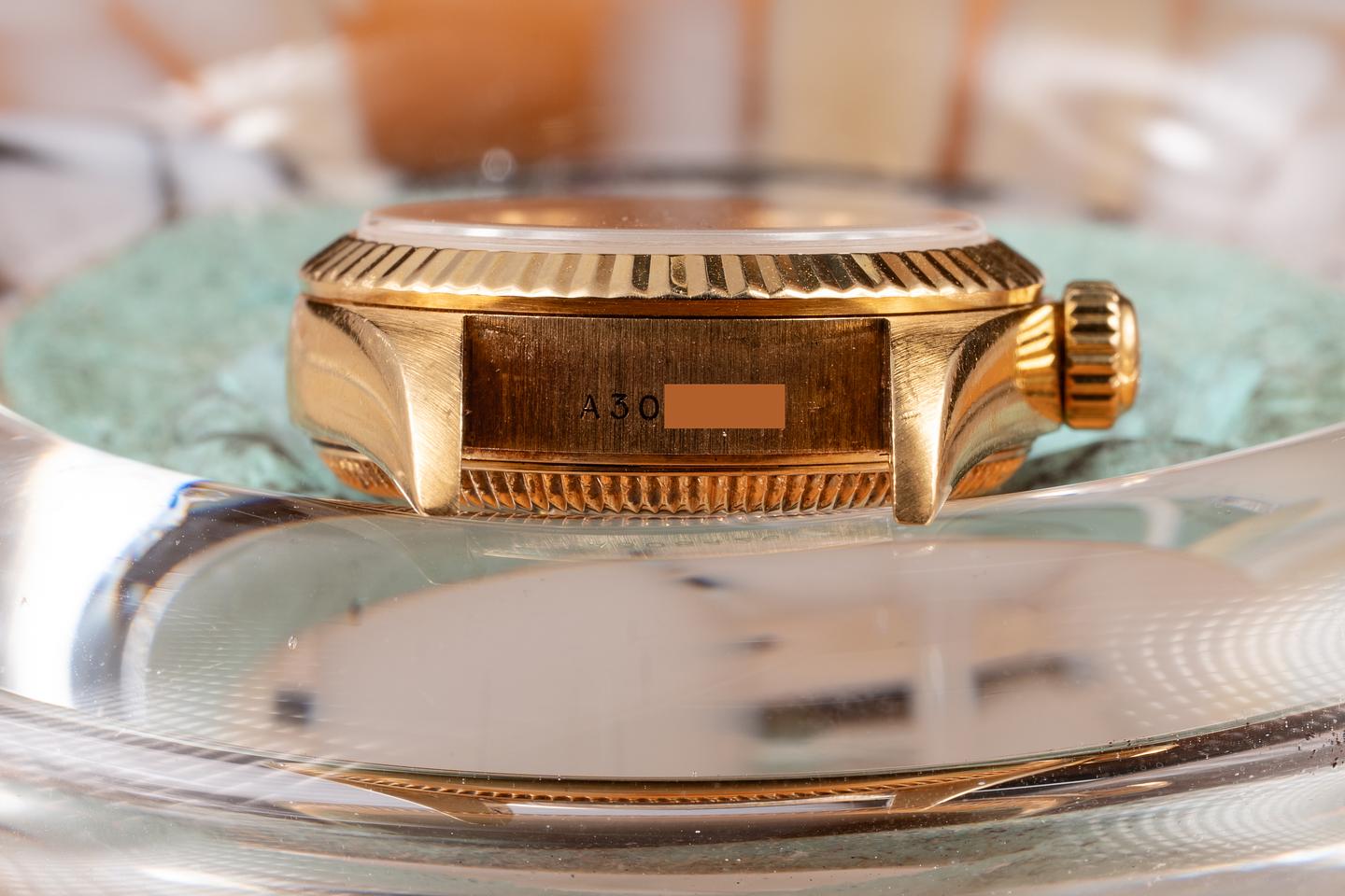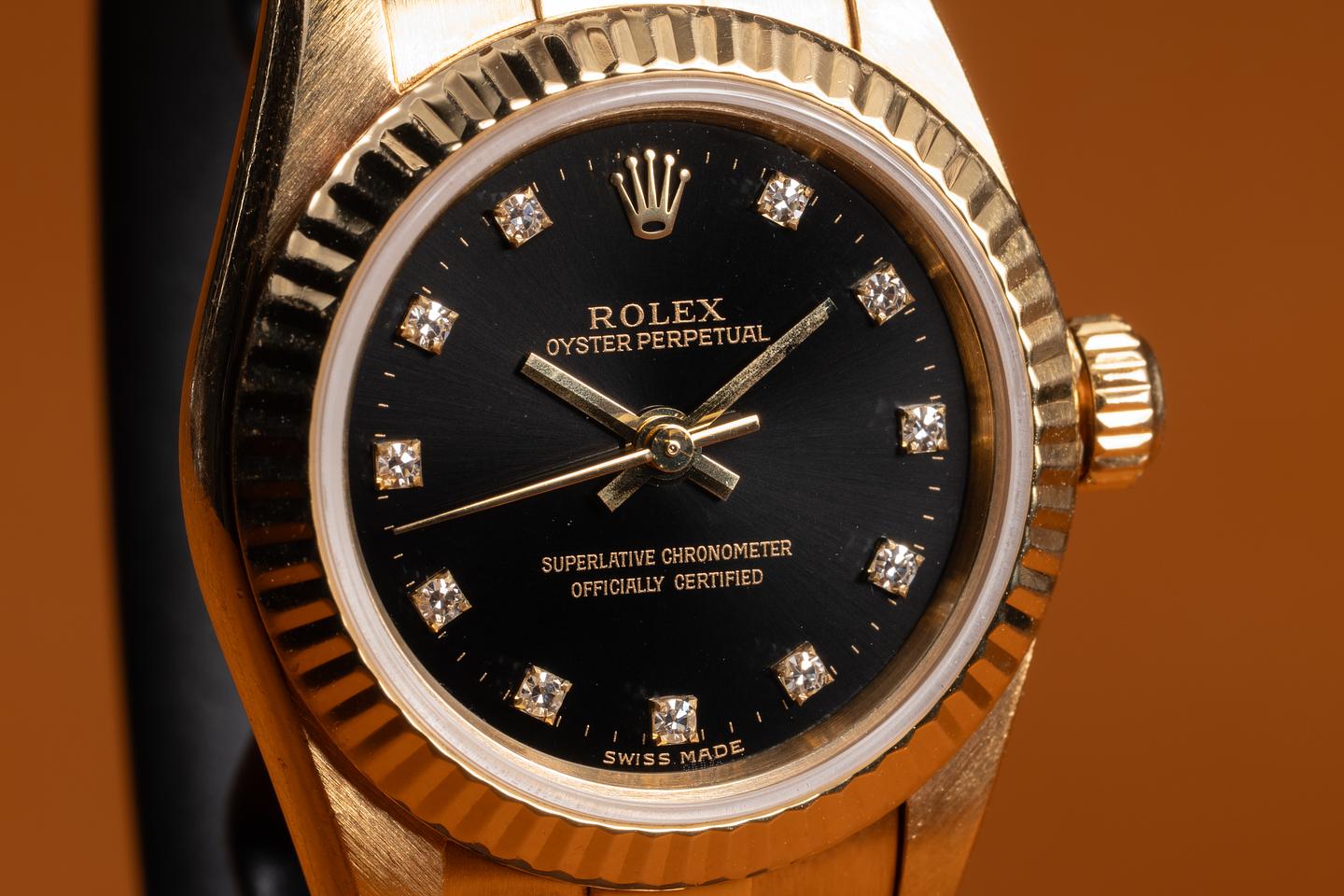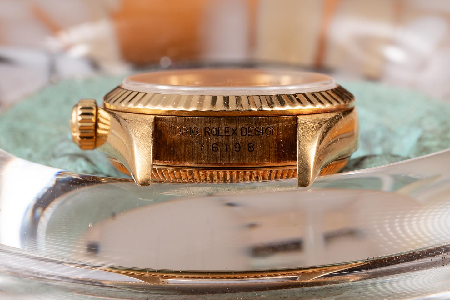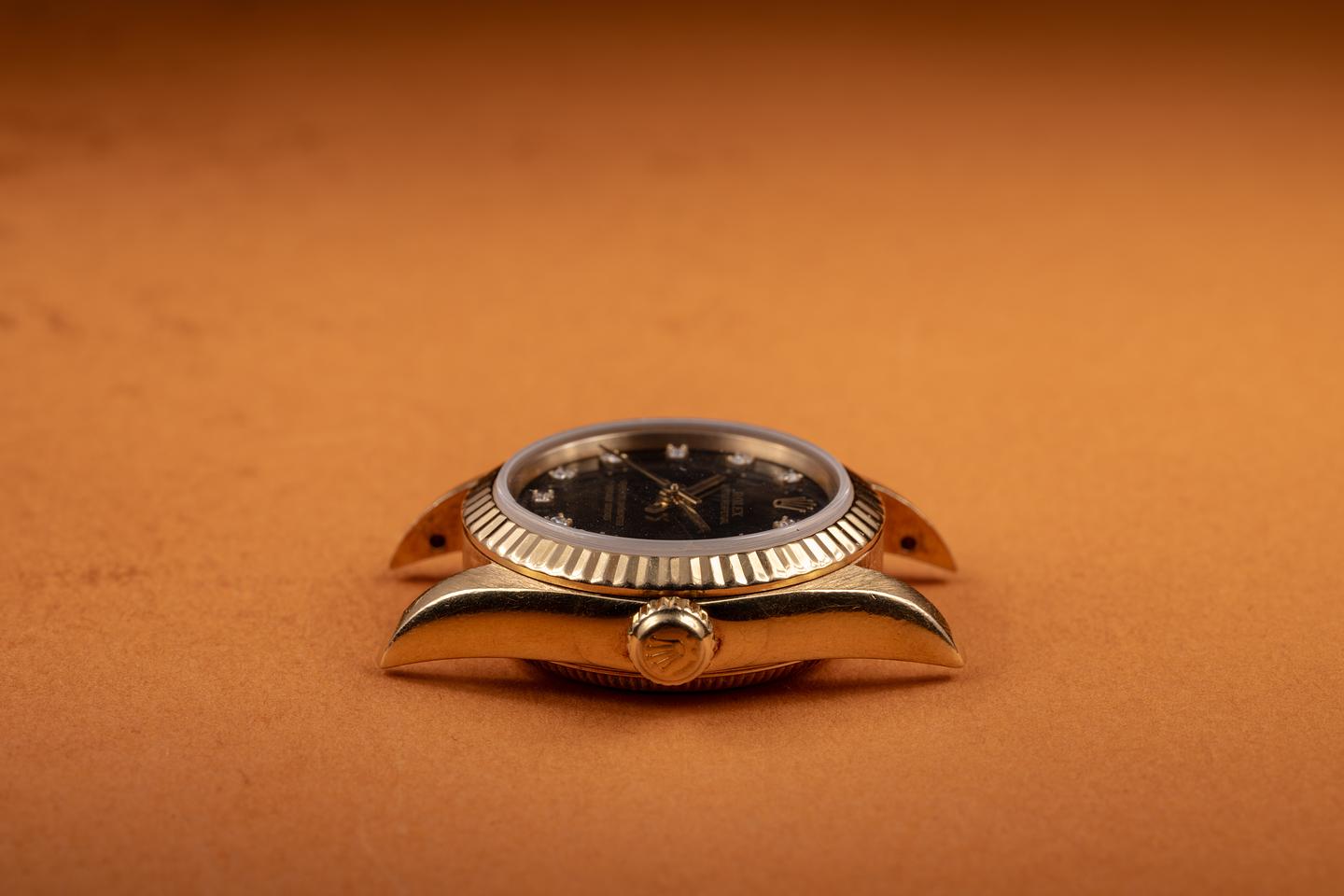 Case: The sharp, 26mm 18K yellow gold case is excellent, showing only light wear from use. The 18k yellow gold fluted bezel is also in excellent condition, showing only light wear from use.