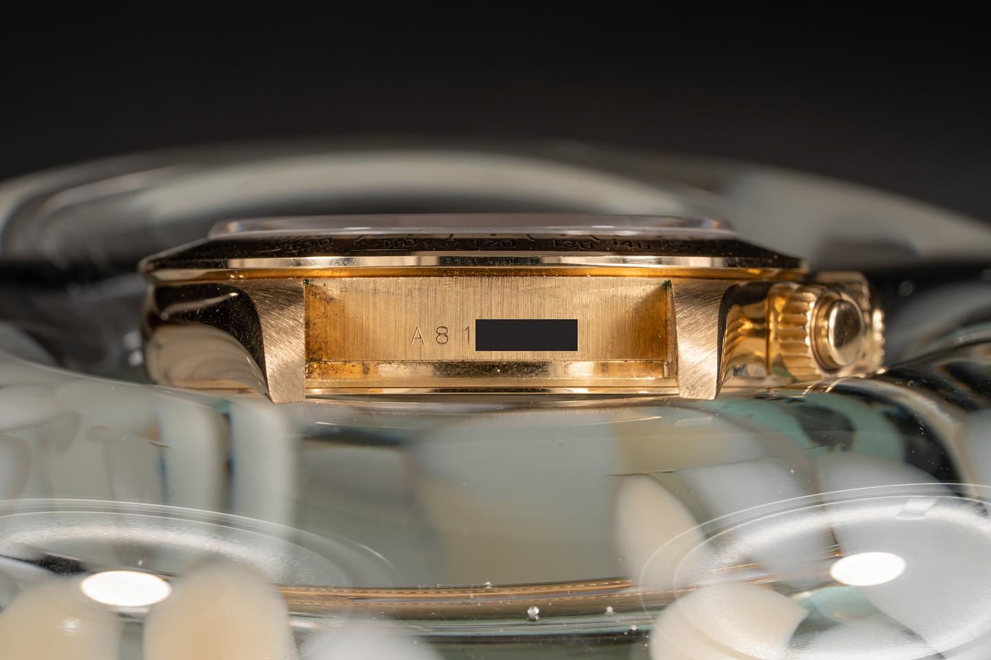 Case: The 18k yellow gold case and bezel have just returned from polishing and are both in excellent condition.