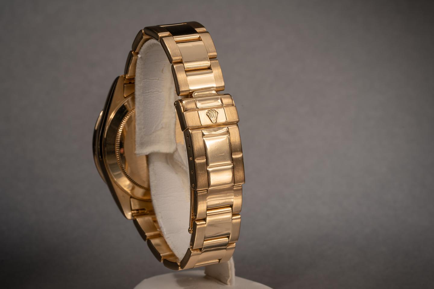 Bracelet: The 12 link 18k yellow gold oyster bracelet is excellent showing only very light stretch for its age. The clasp is stamped with a matching 1999 date code.