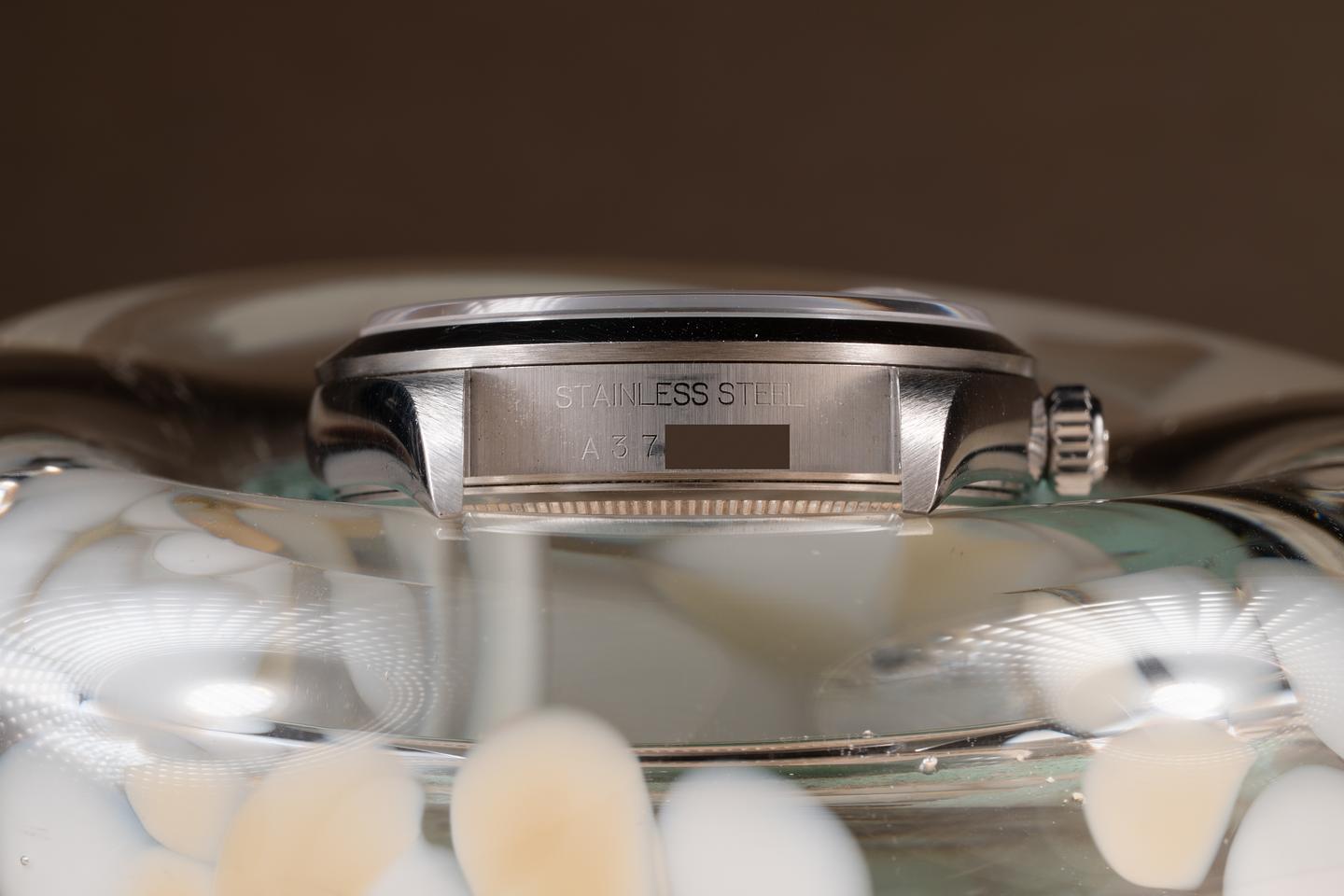 Case: The sharp 34mm case is unpolished, showing some light wear from use. The smooth stainless bezel is also in excellent unpolished condition, showing some light wear from use.