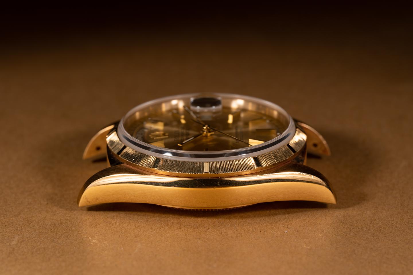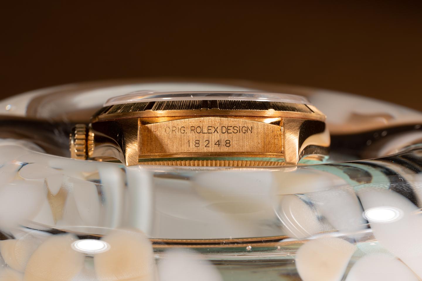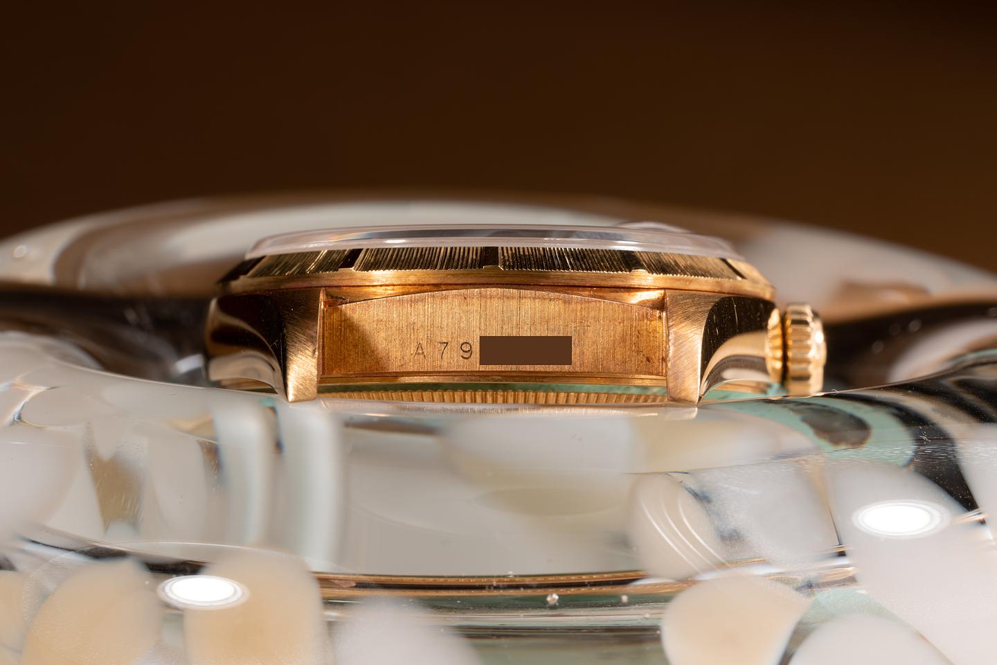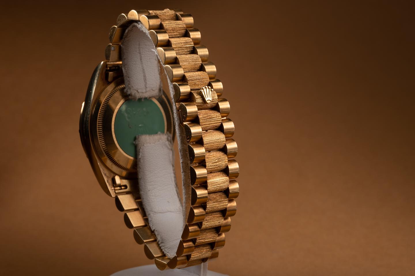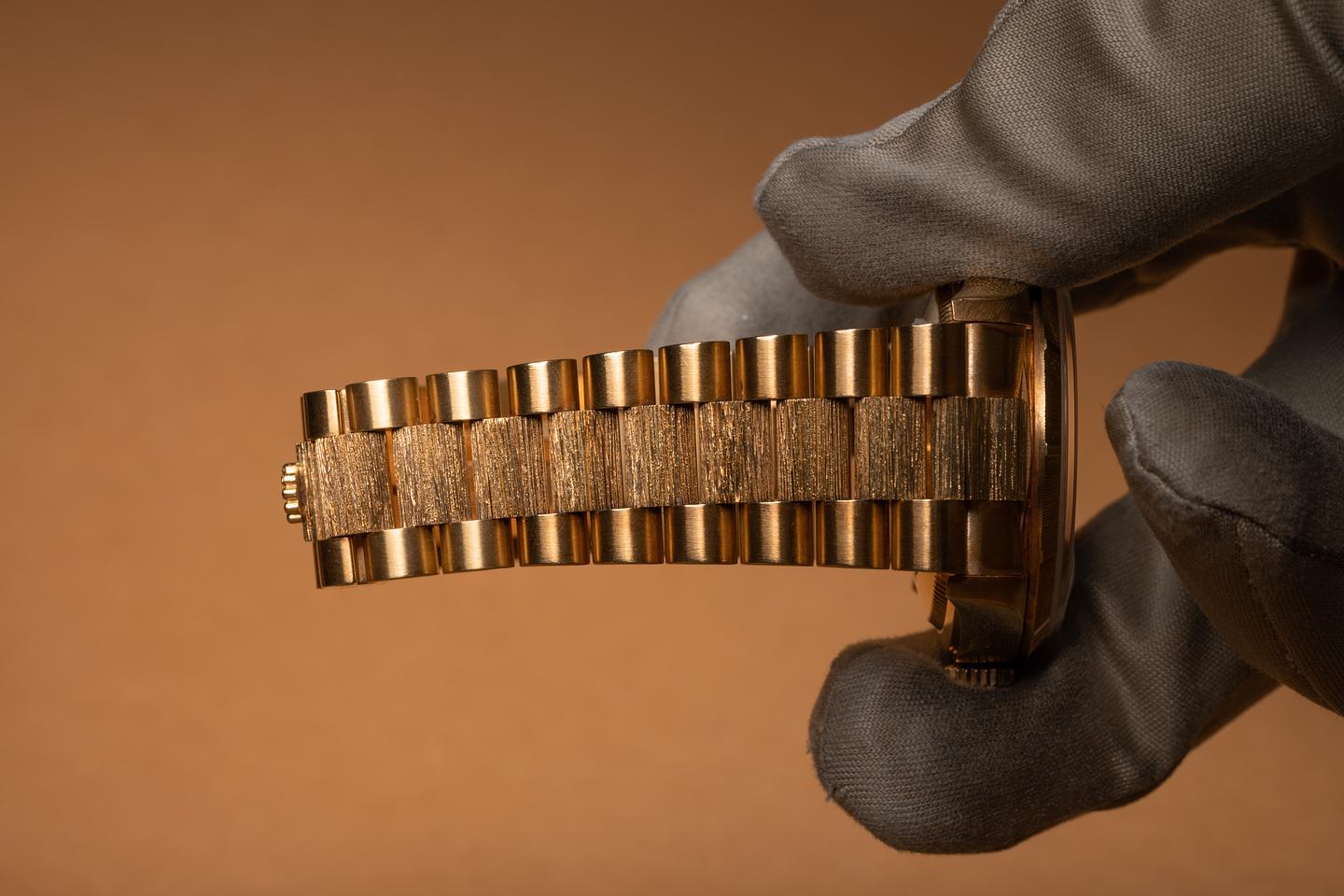 Notes: The combination of the engine-turned bezel and bark-finished bracelet give this particular Day-Date a very Buenos Aires in the 1970's vibe.