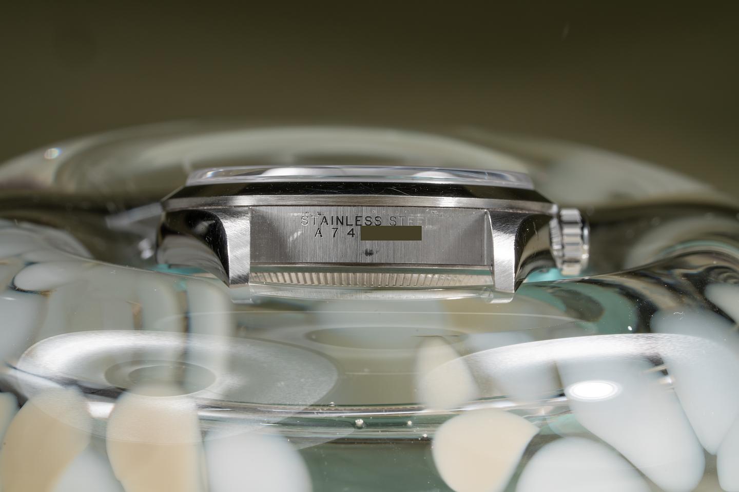 Case: The sharp case is excellent showing only very light wear from use. The smooth stainless bezel is also excellent showing very light wear. The original factory sticker is still in place on the caseback.